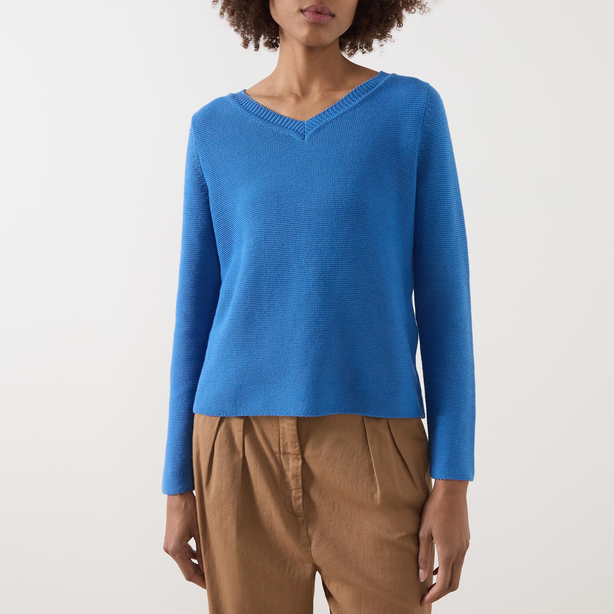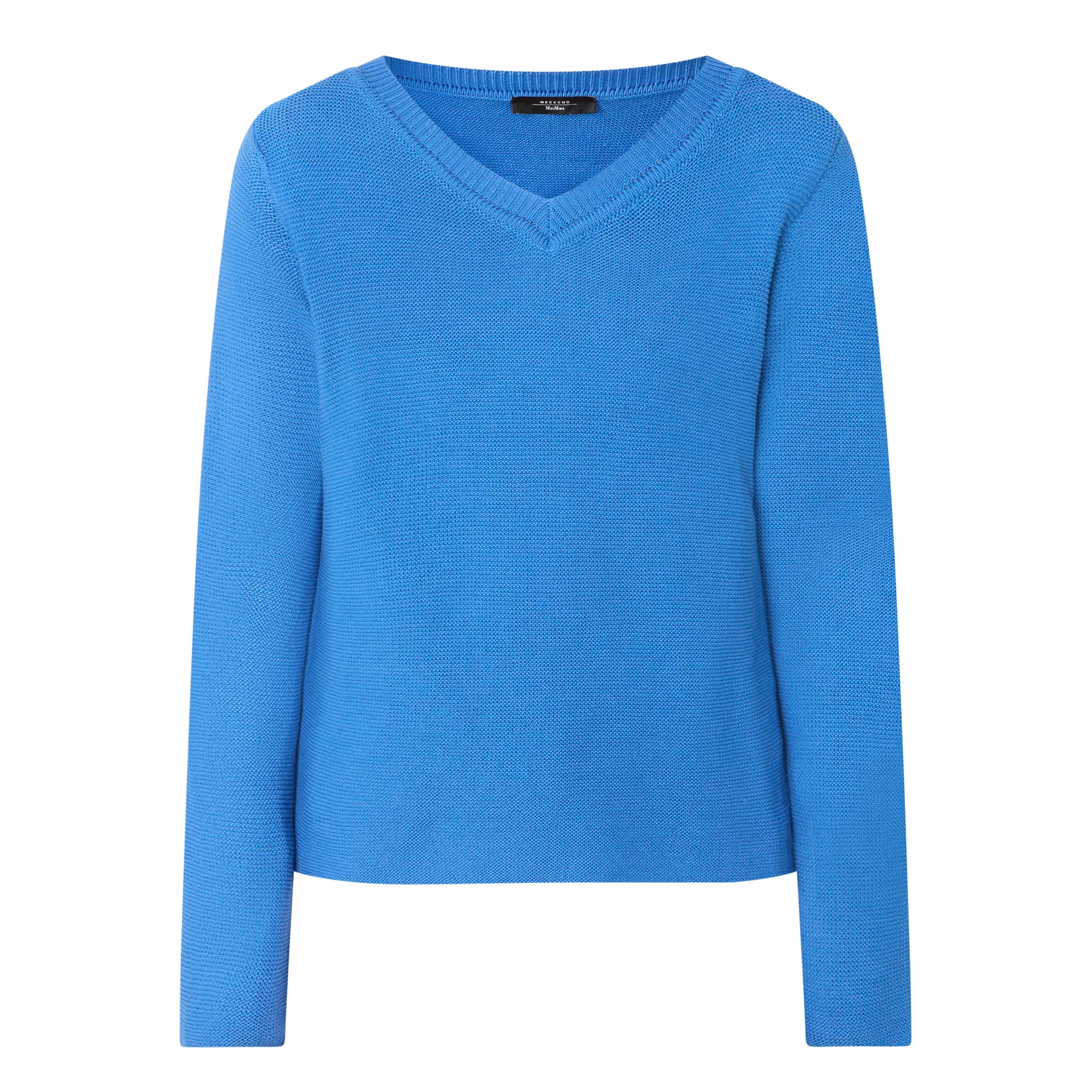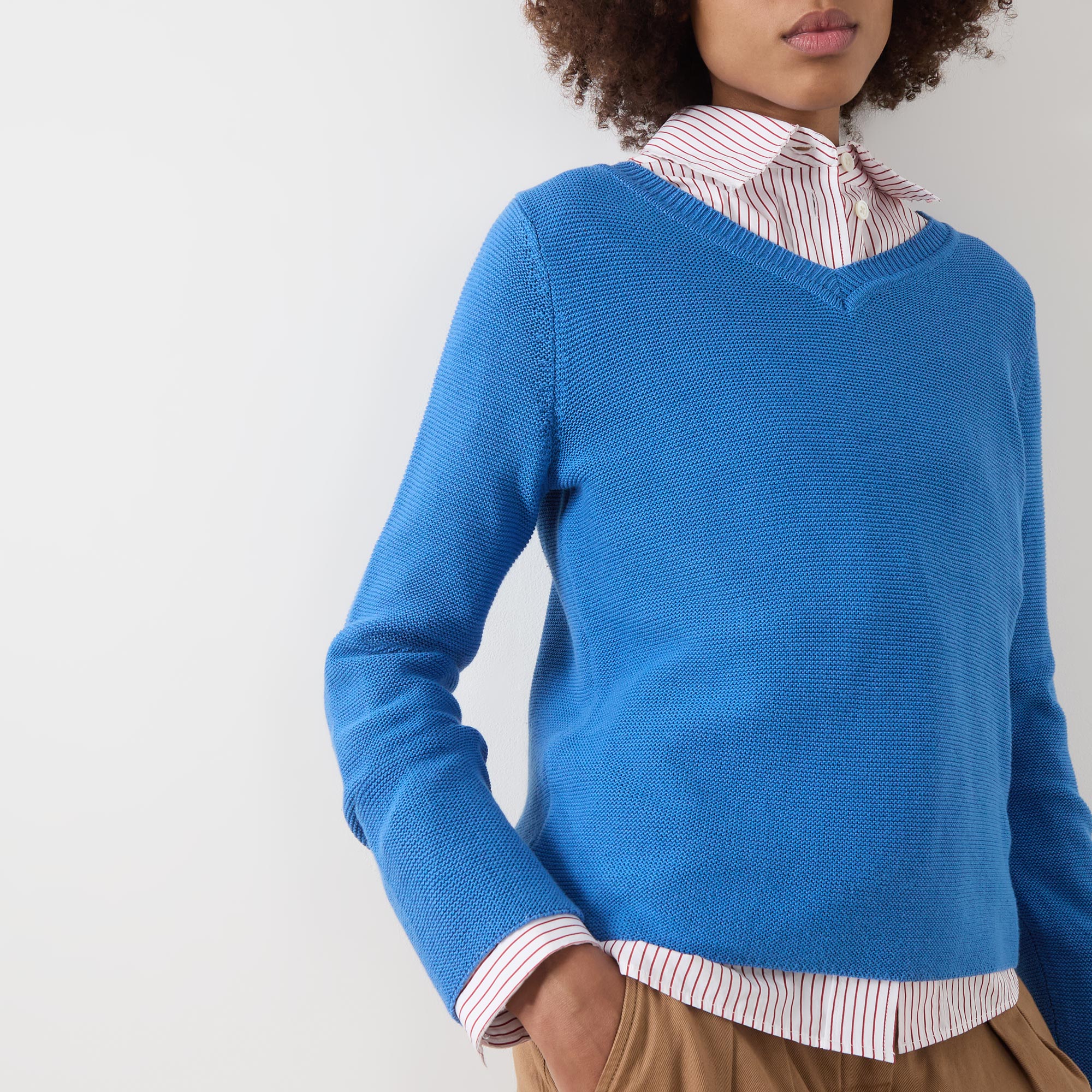 - V-neckline, long sleeves, ribbed trims, straight hemline, fine-knit finish