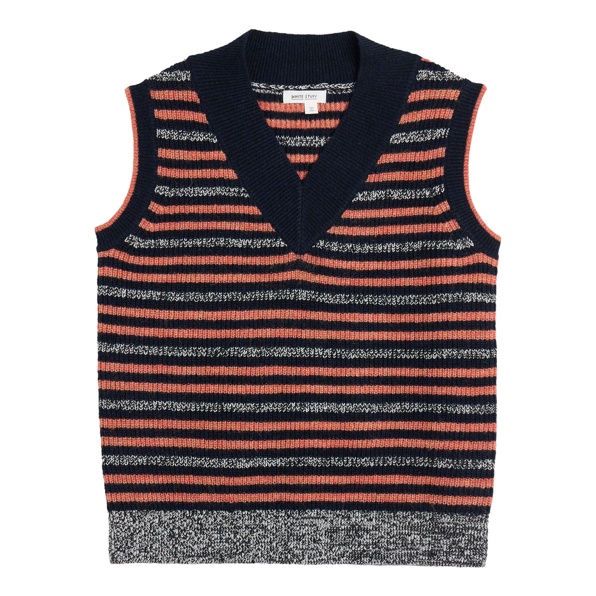 • Knitted, tank silhouette, striped design, V-neckline