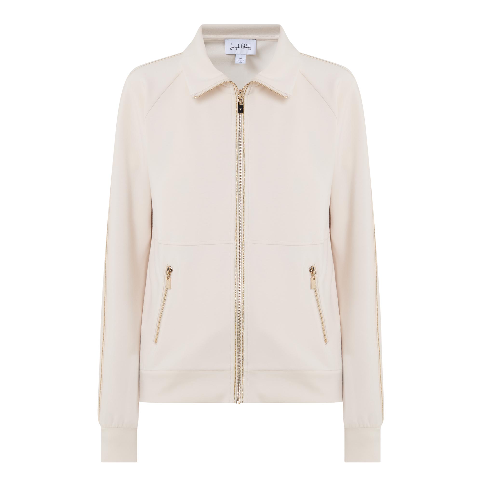 • Funnel neckline, long sleeves, elasticated cuffs, zipped side entry pockets, full zip fastening, glitter piped details