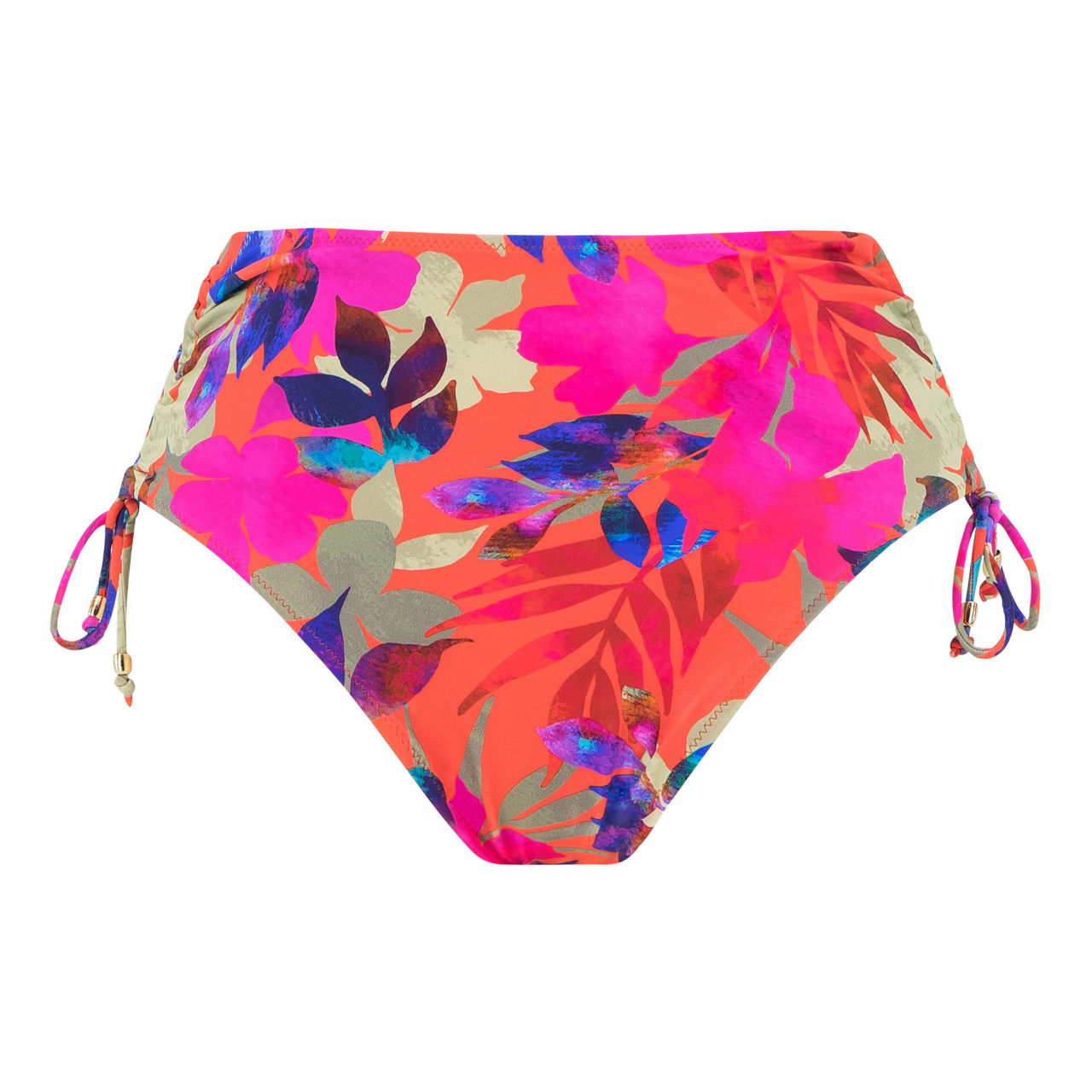 - High-rise, adjustable sides to offer variation of leg coverage, fully lined, tropical leaf print