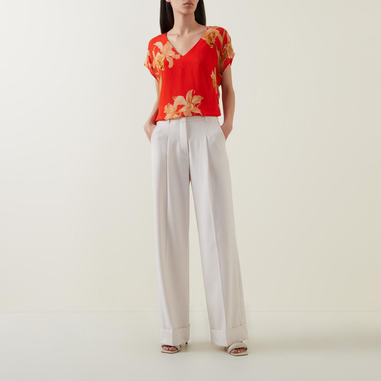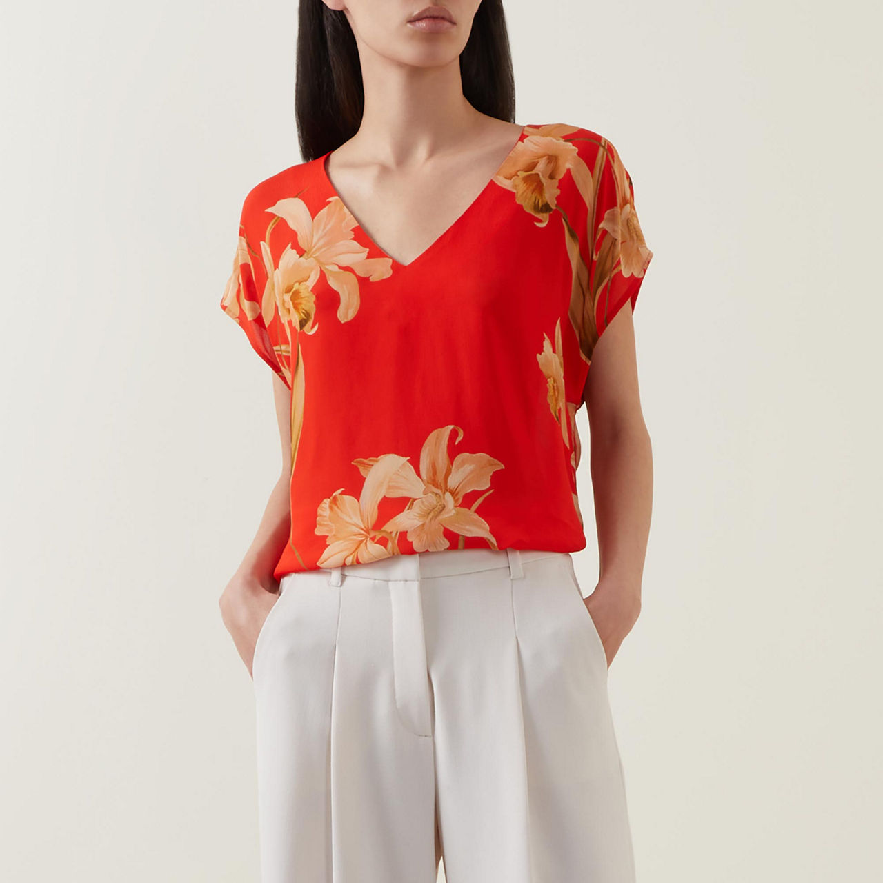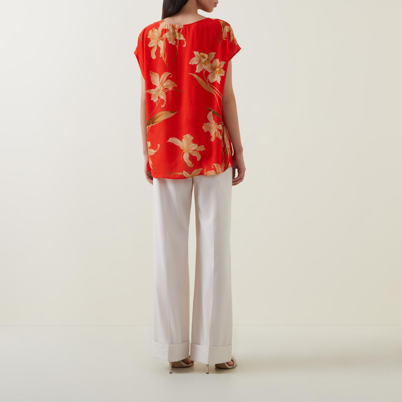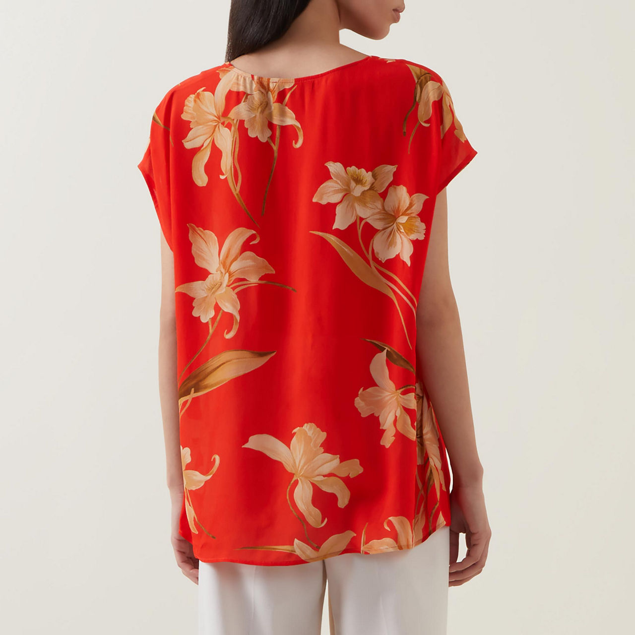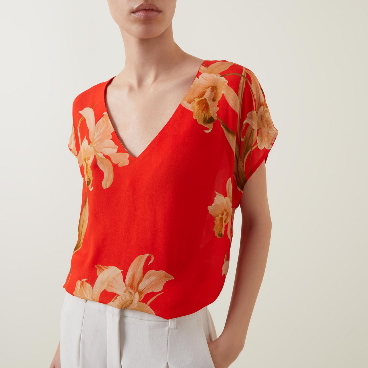 - Wide V-neckline, short cap sleeves, slightly lower hem at the back, all-over floral design, lightweight