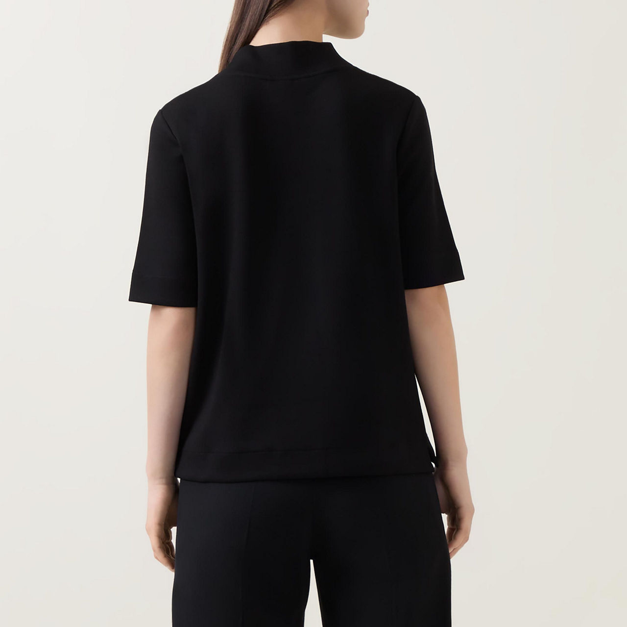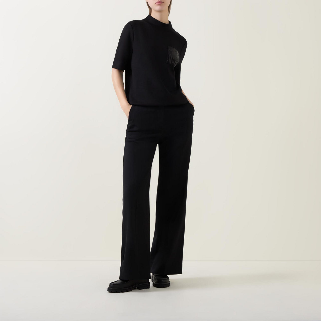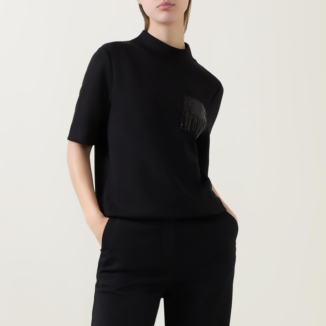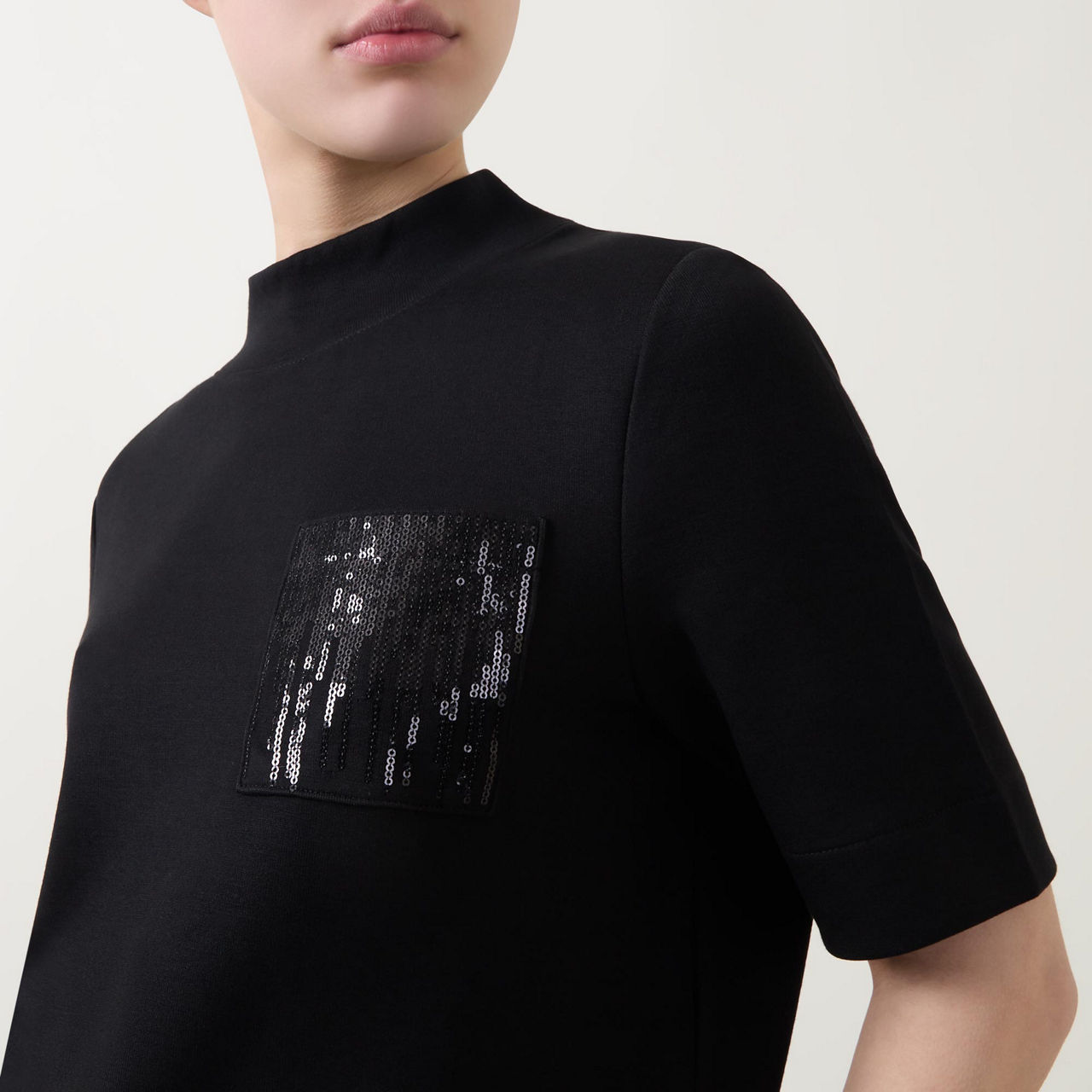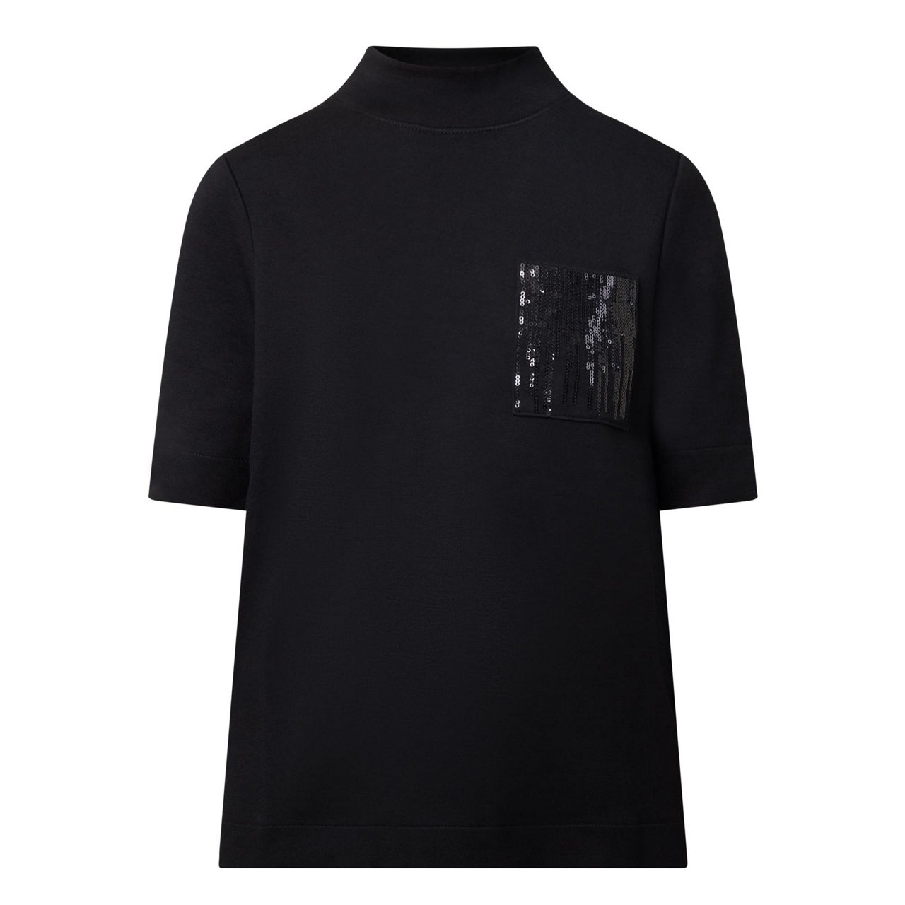 - Mock neckline, short sleeves, sequin-embellished chest pocket, tonal stitching, straight hemline, smooth fabric