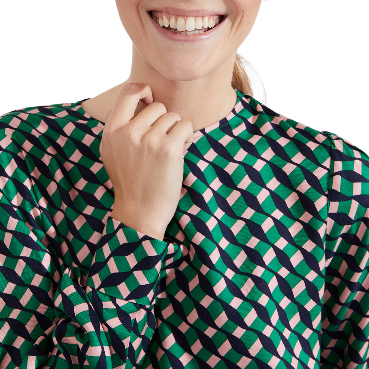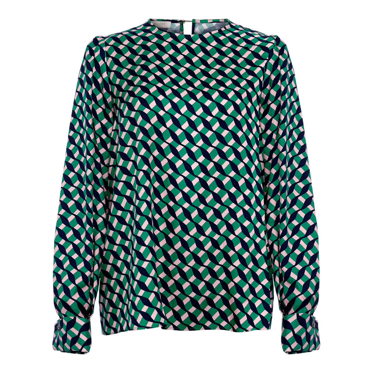 - Round neckline, keyhole fastening, pleated shoulders, long sleeves, buttoned cuffs, straight hem, all-over geometric print pattern