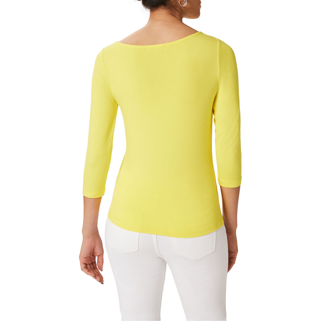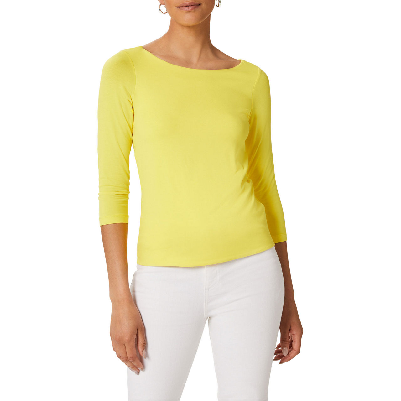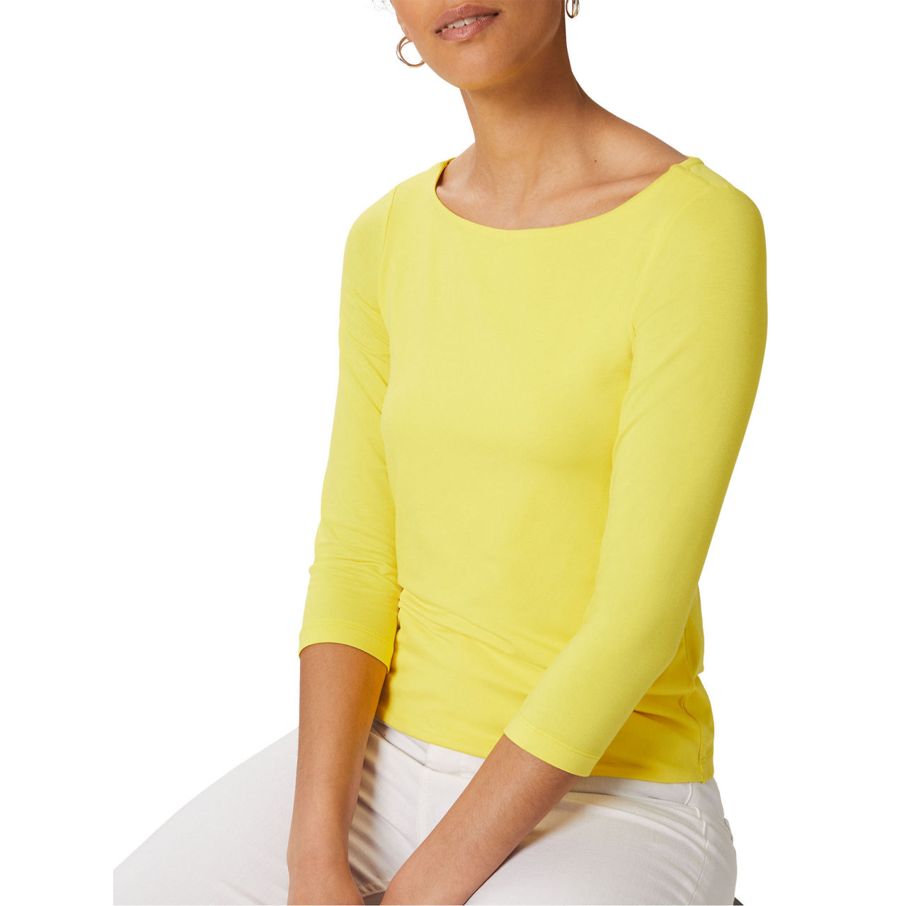 - Boat neckline, three quarter-length sleeves, fitted.