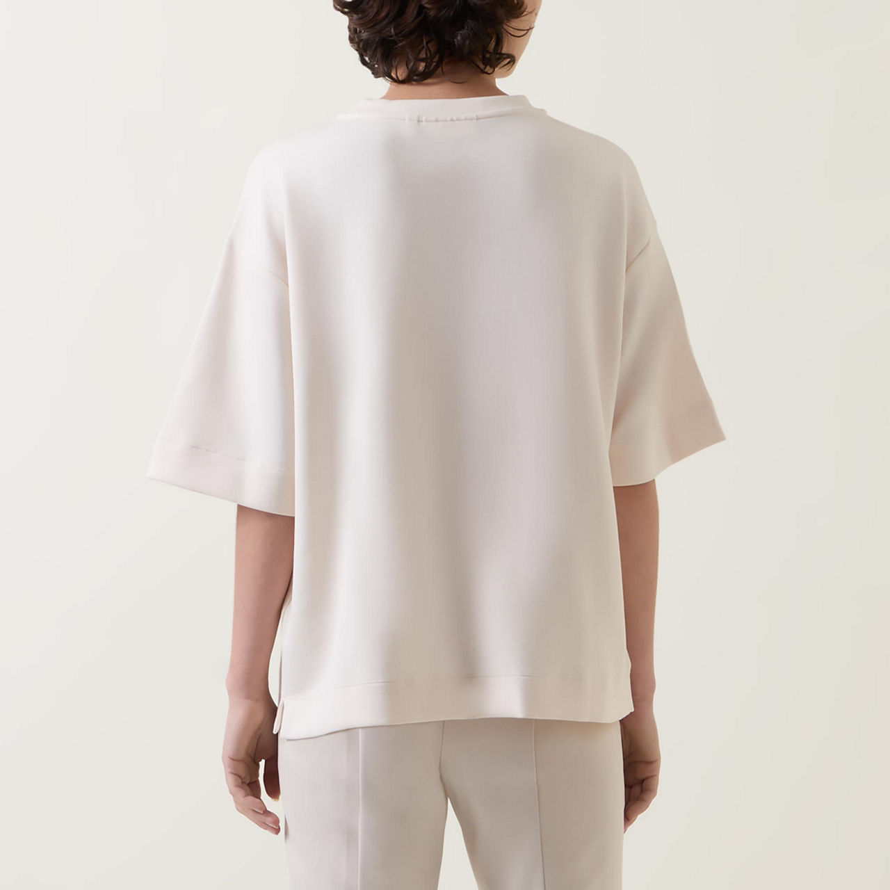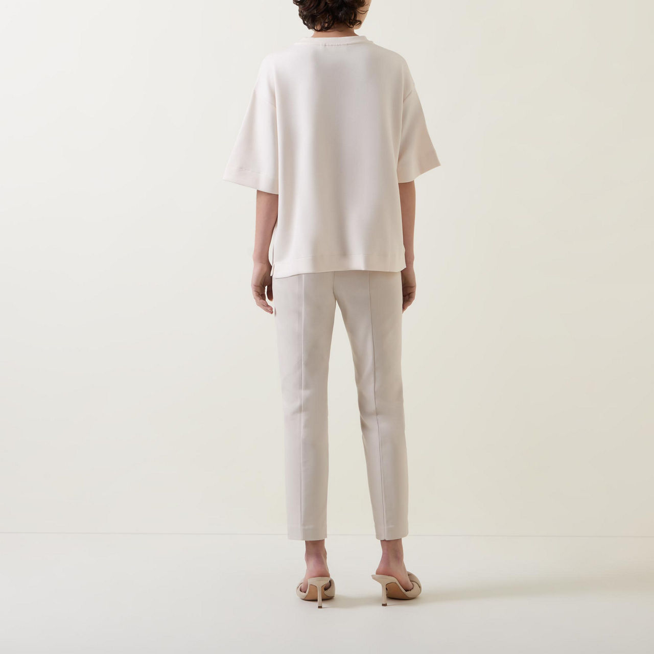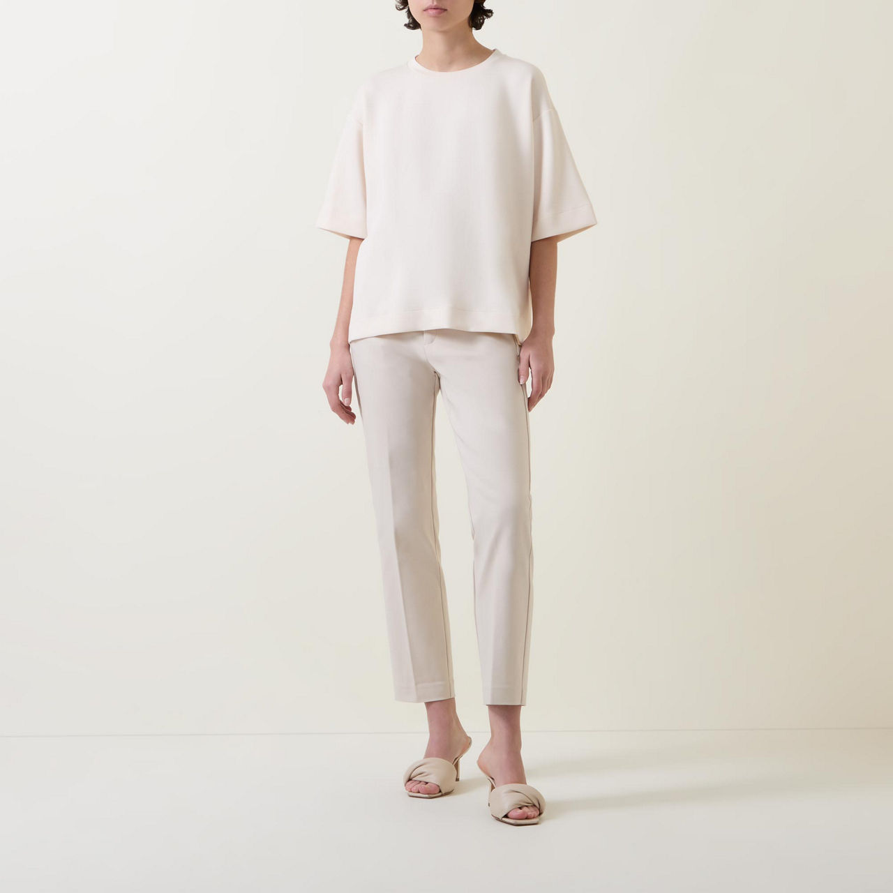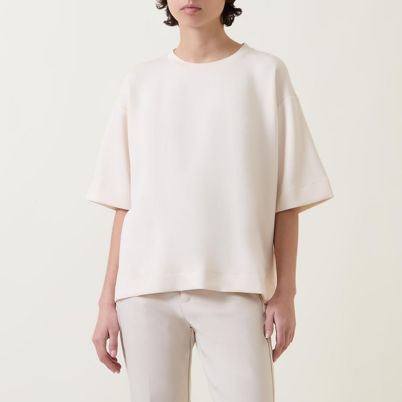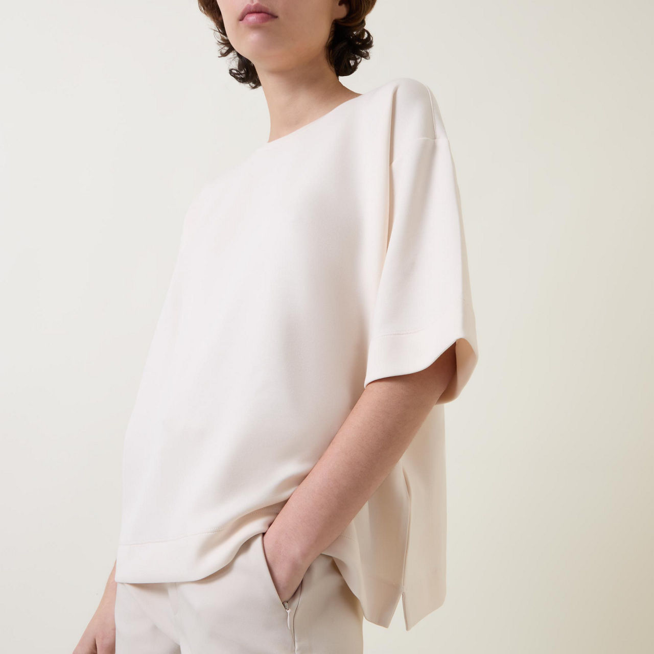 - Round neck, dropped shoulders, short wide sleeves, straight hem