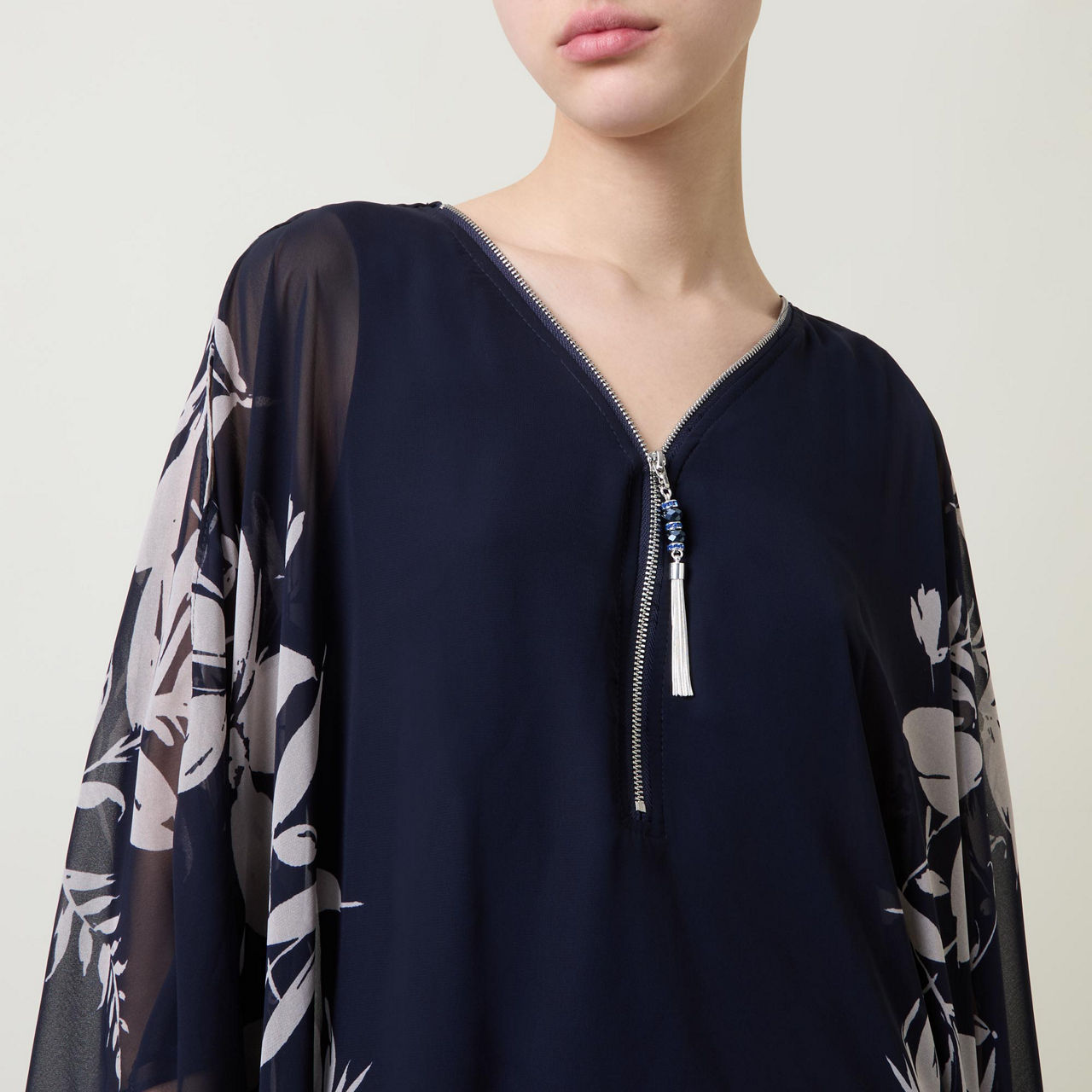 - V-neckline, zip fastening, three-quarter length waterfall sleeves featuring large keyhole openings and a floral-print design, semi-sheer finish, lined