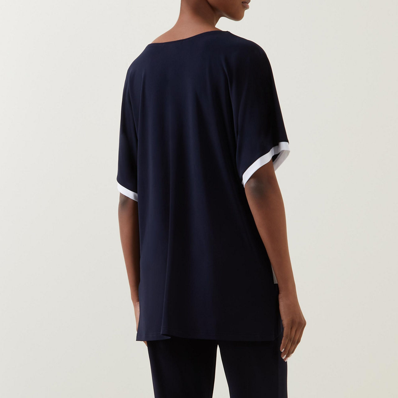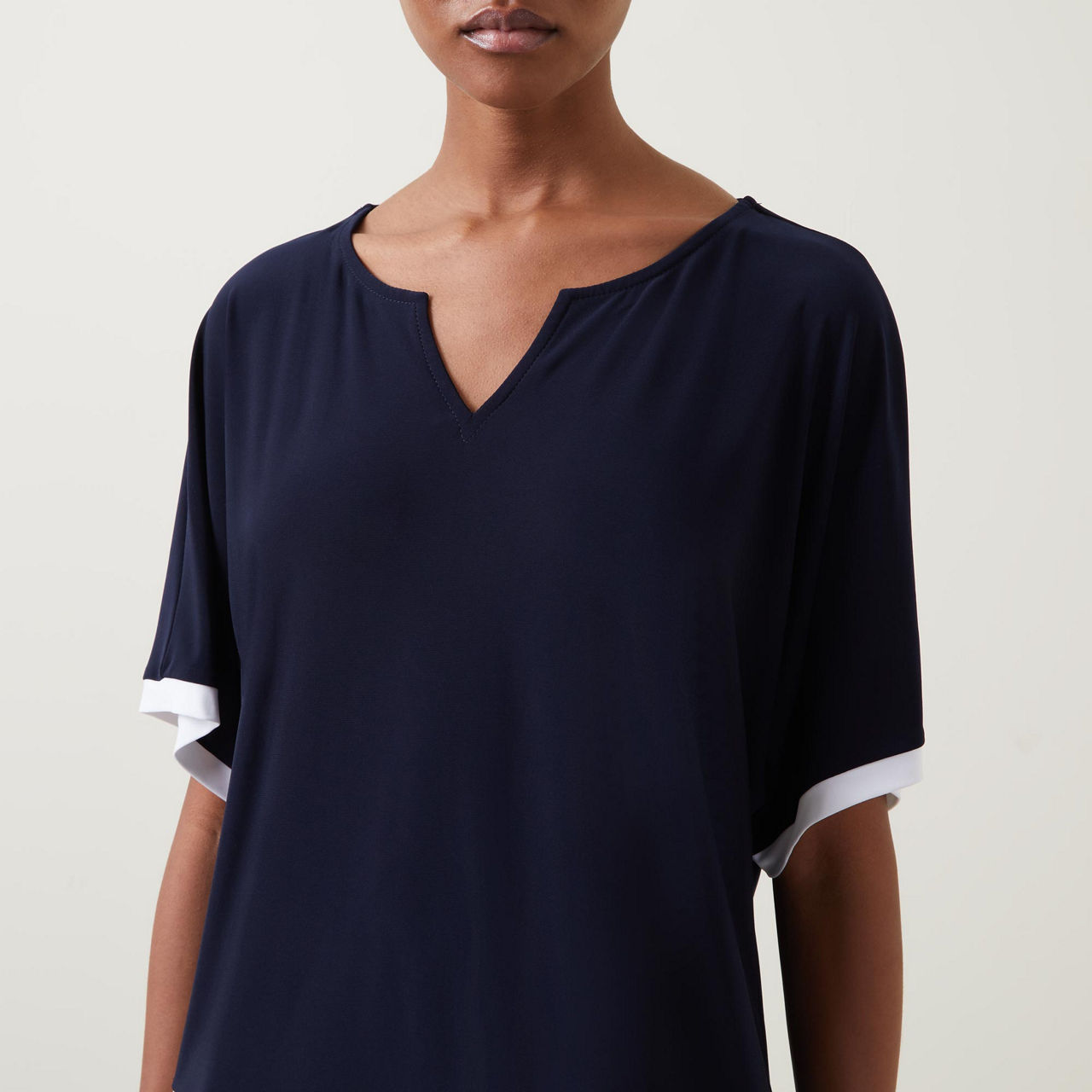 • Short sleeves, collared V-neckline, striped accenting, tonal stitching, smooth fabric