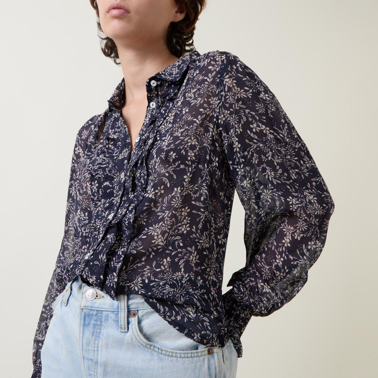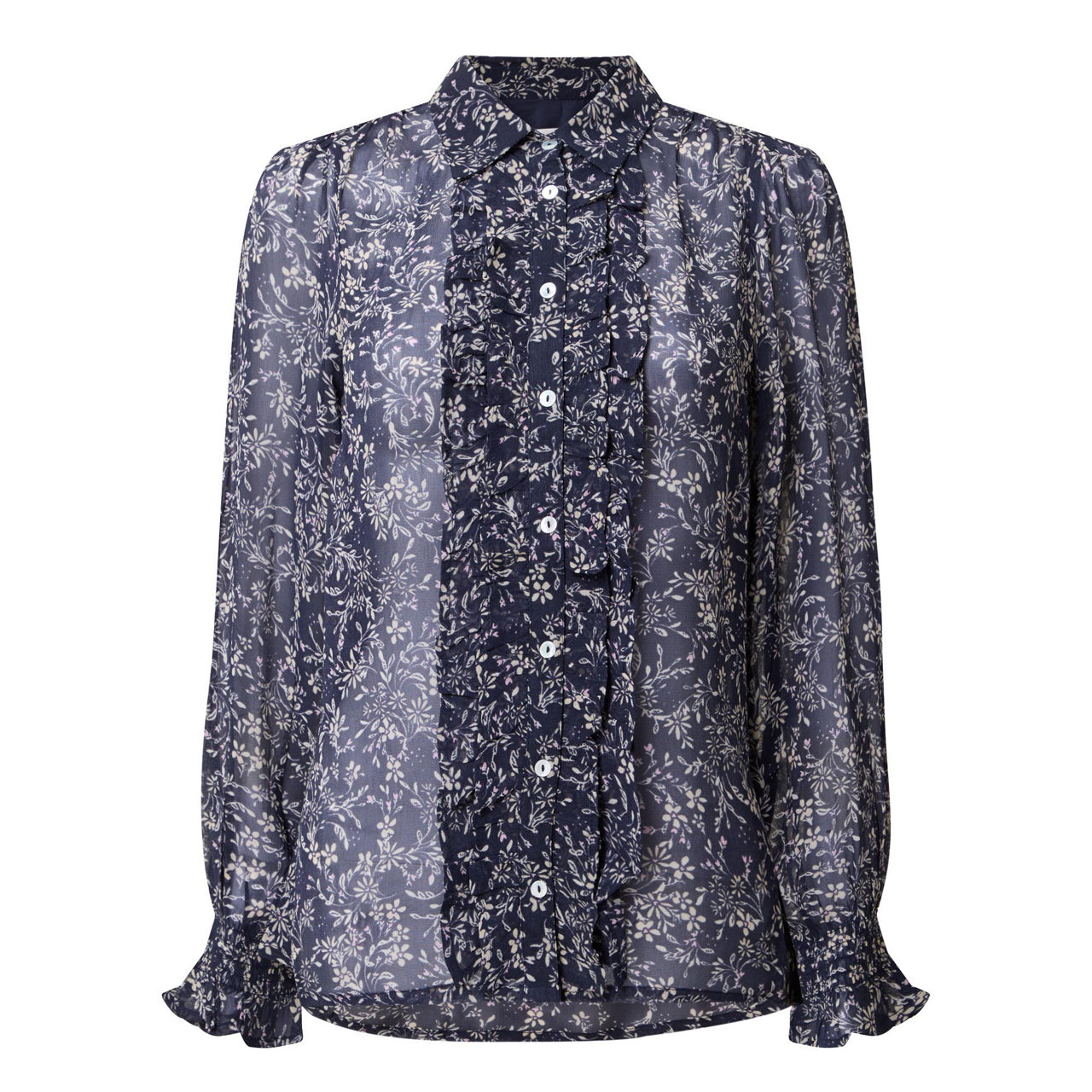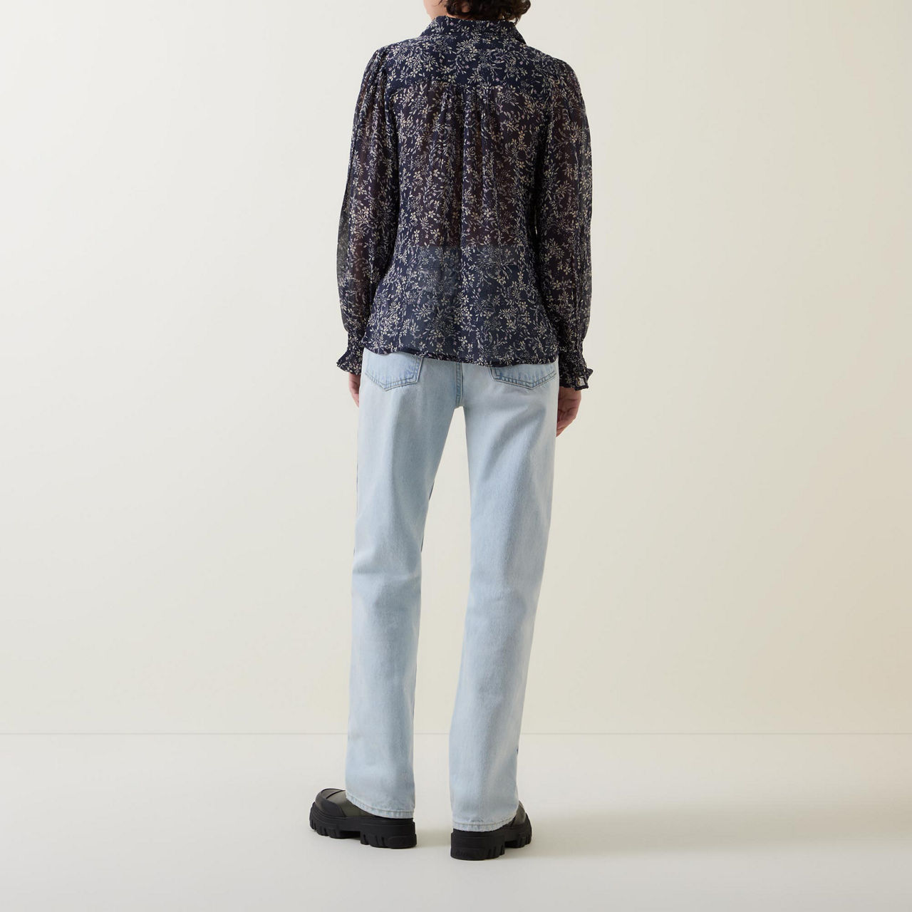- Classic collar, long blouson sleeves, shirred cuffs with ruffle trim, front button fastening with pleated ruffle design, rear gathered detailing, curved hem, all-over floral print, semi-sheer finish