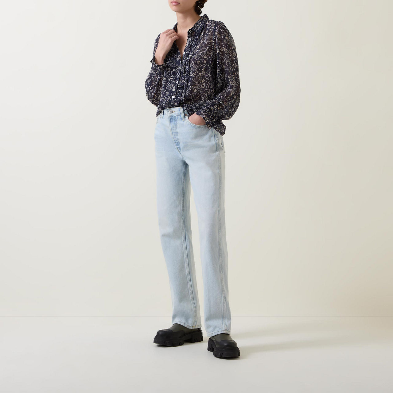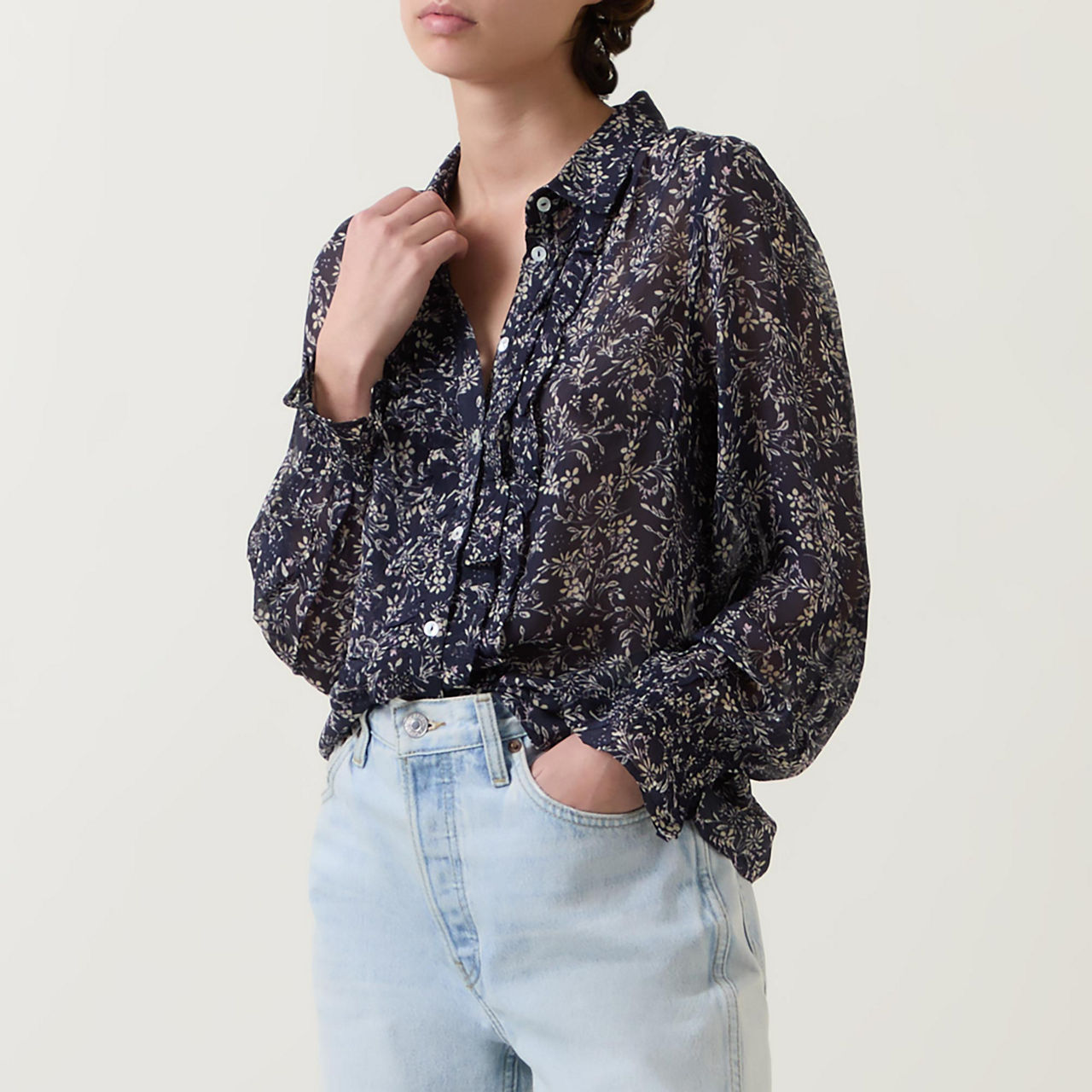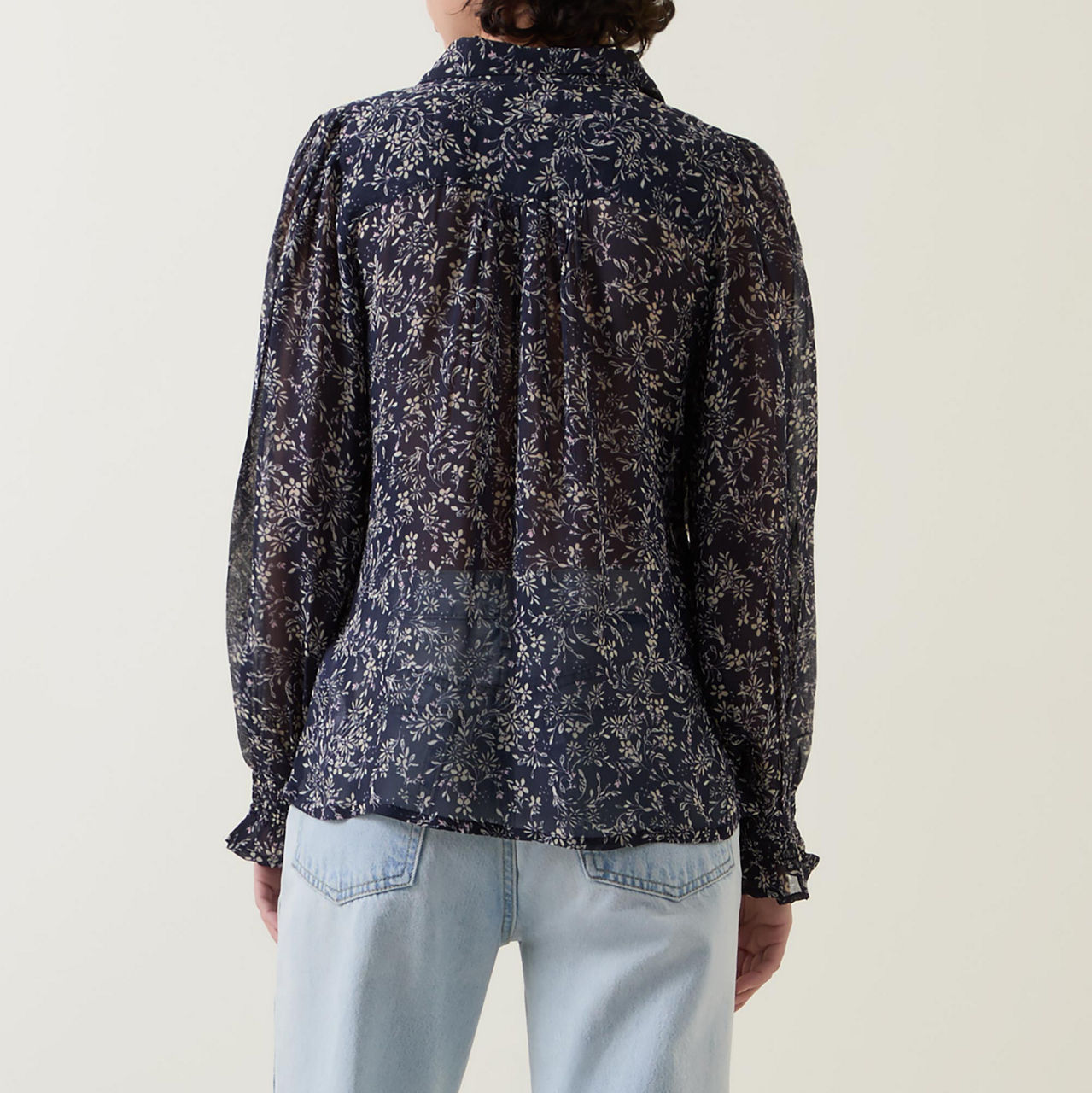 - Classic collar, long blouson sleeves, shirred cuffs with ruffle trim, front button fastening with pleated ruffle design, rear gathered detailing, curved hem, all-over floral print, semi-sheer finish
