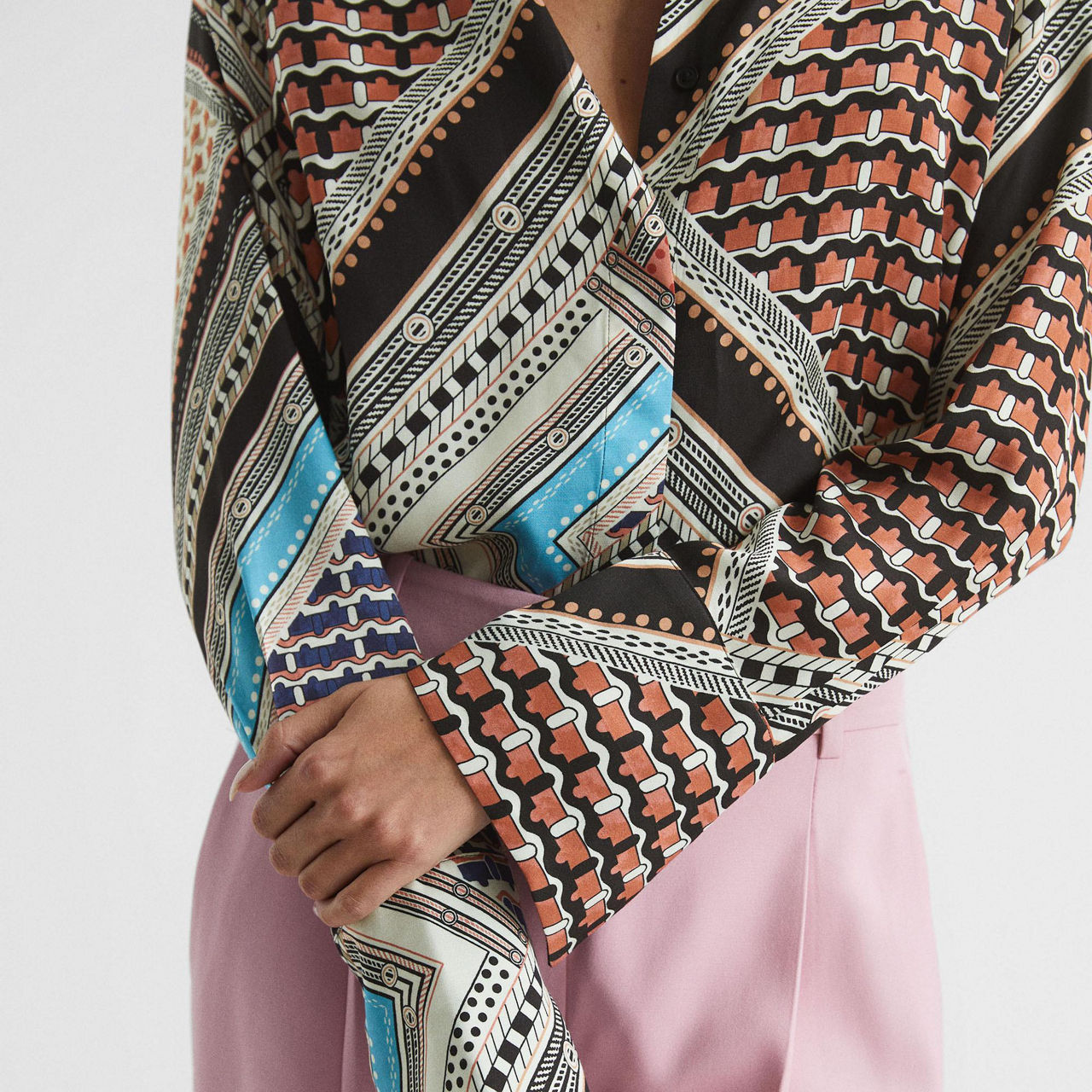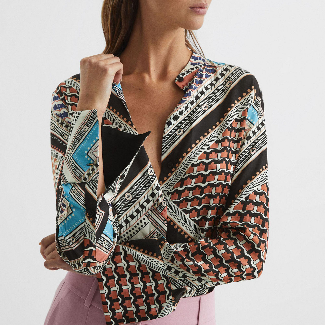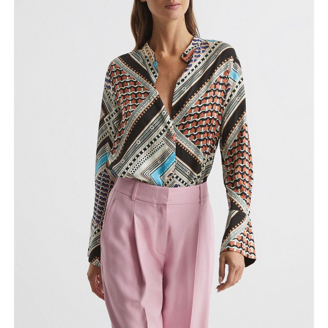 Designed with a nuanced scarf print, Reiss' Everly shirt is the perfect statement piece for your work and weekend wardrobe alike. Pair with slim-leg trousers and heels.