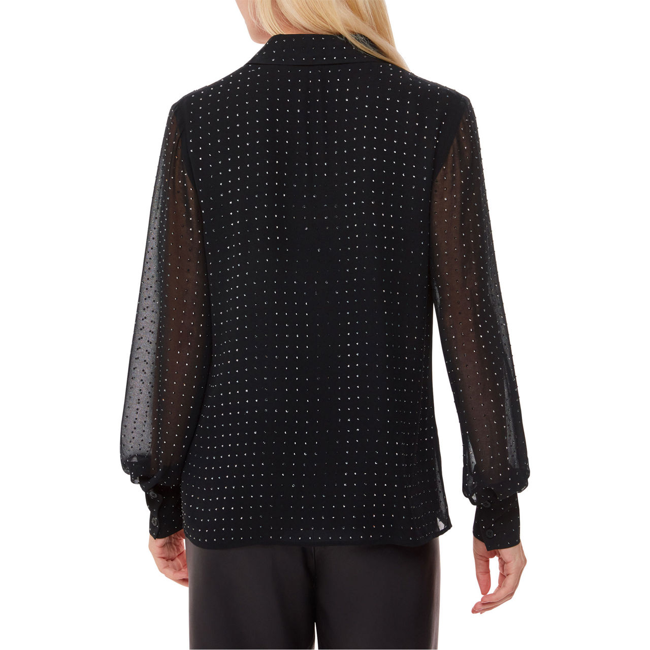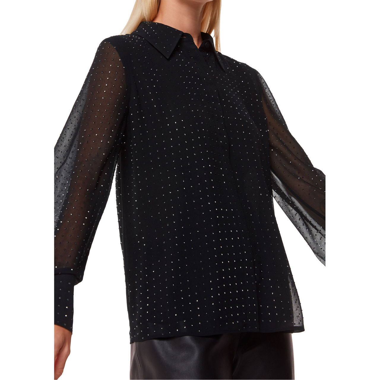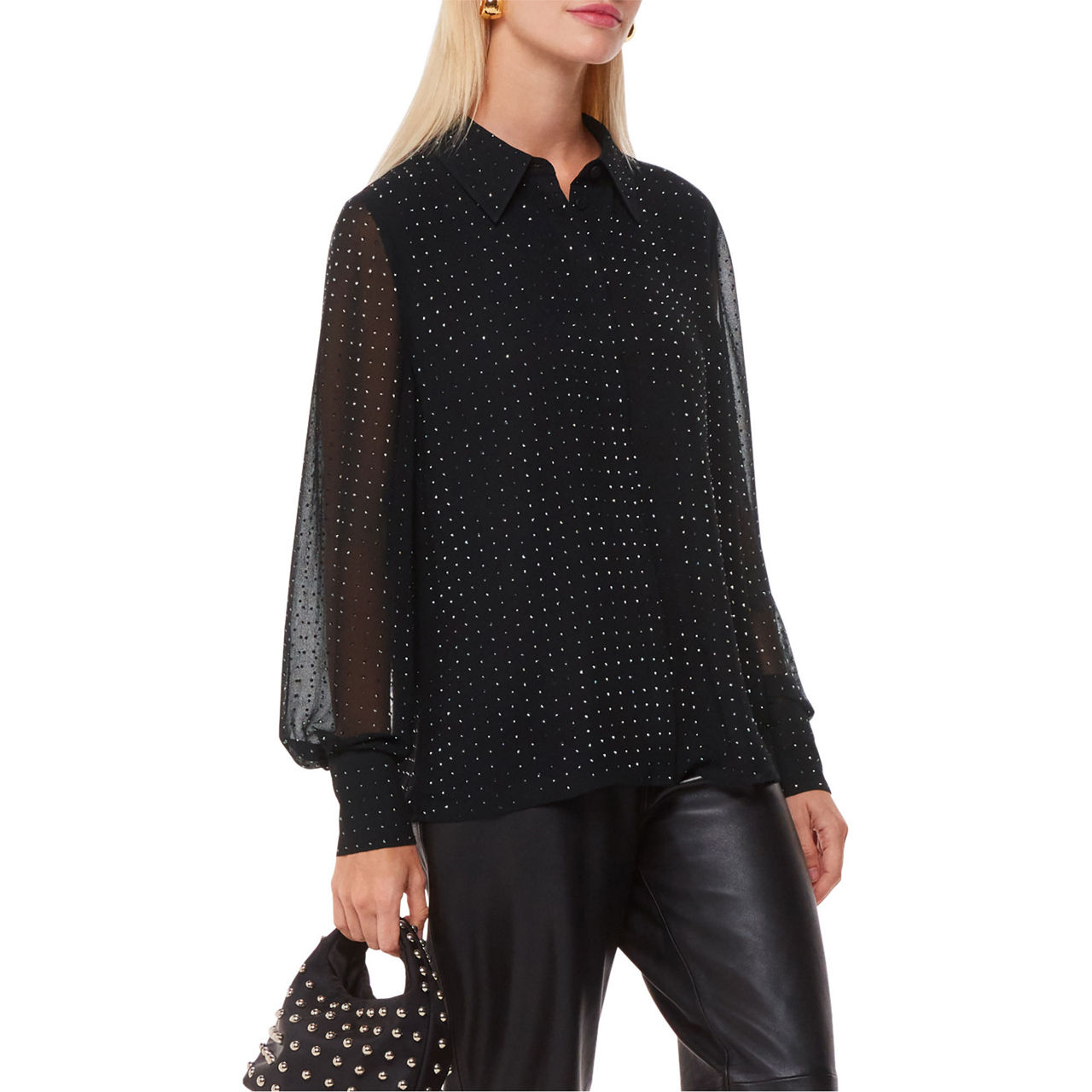 - Pointed collar, long blouson sleeves, concealed button placket, double-button cuffs, all-over crystal embellishment, semi-sheer finish