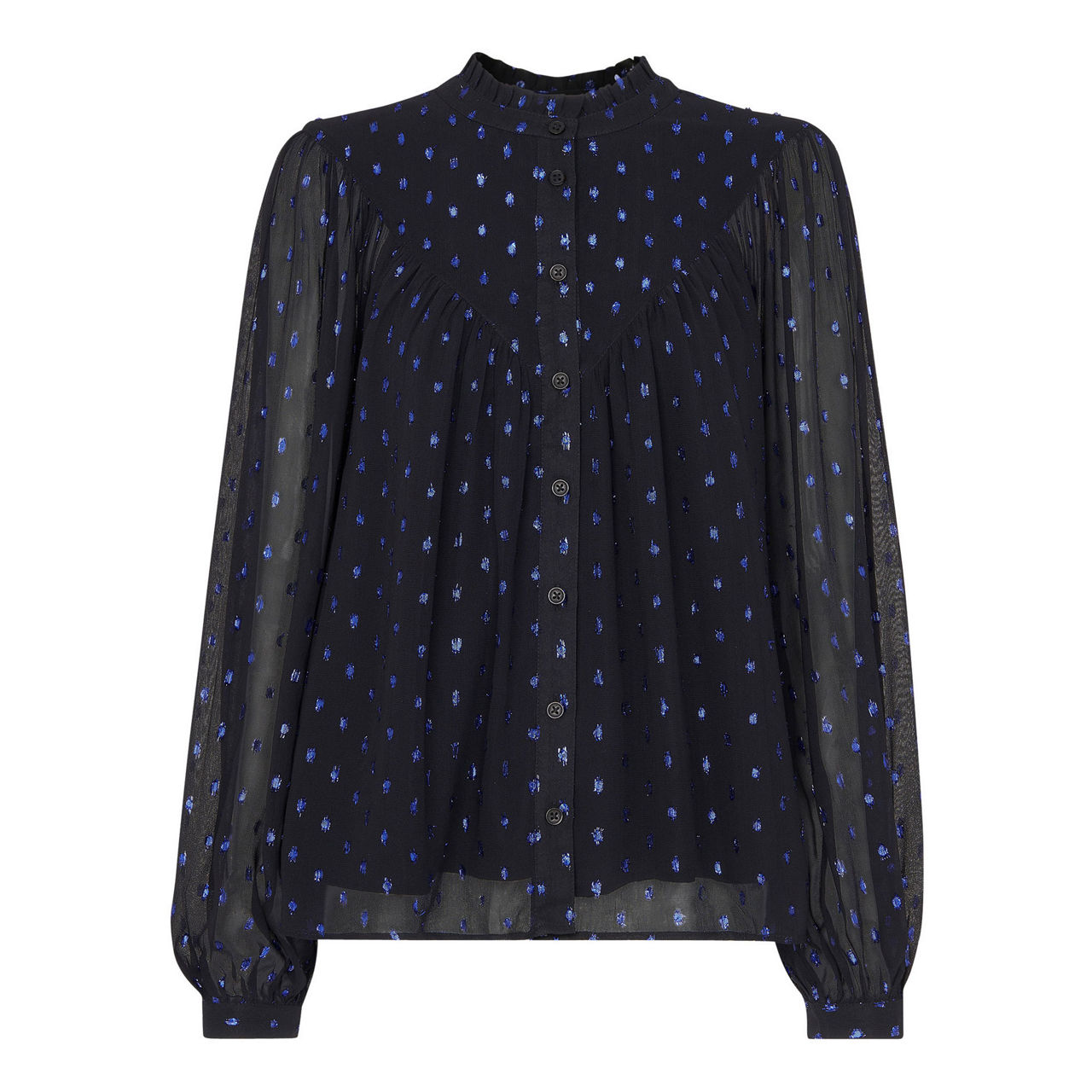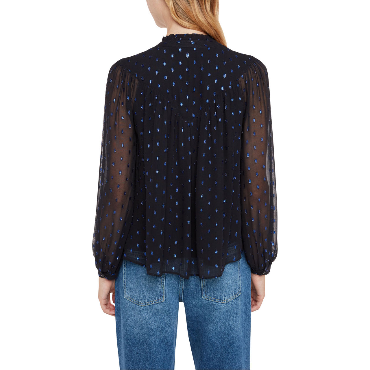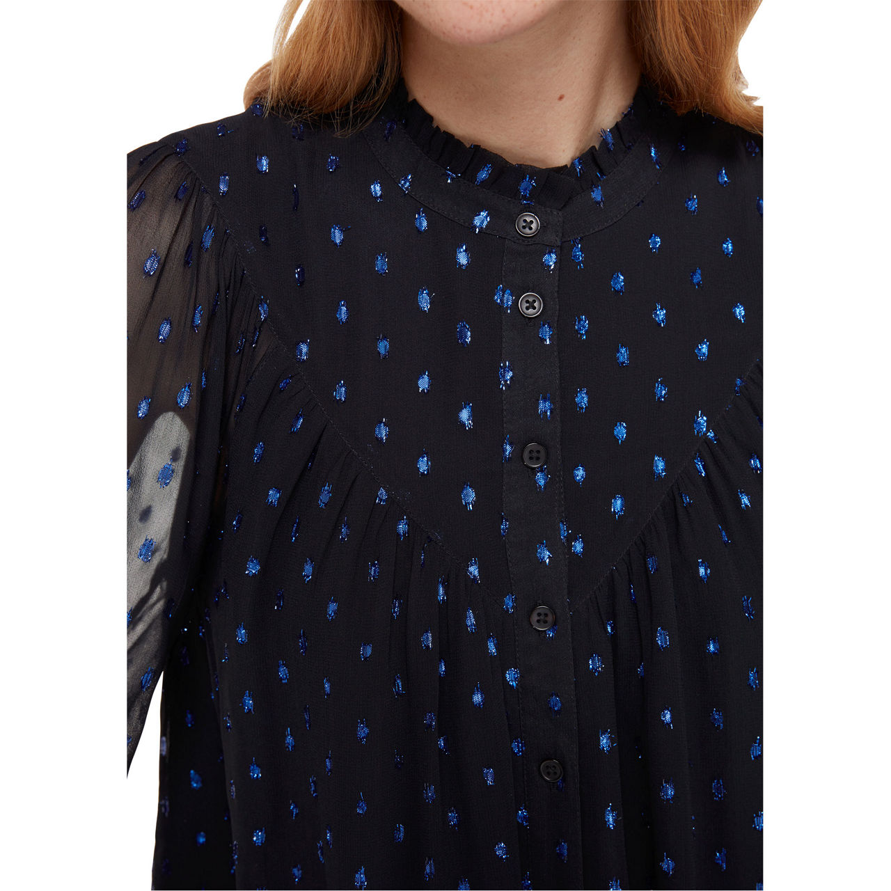 - Long blouson sleeves, round neckline, ruffled collar, button fastening, single-button cuffs, metallic print, straight hemline, smooth fabric