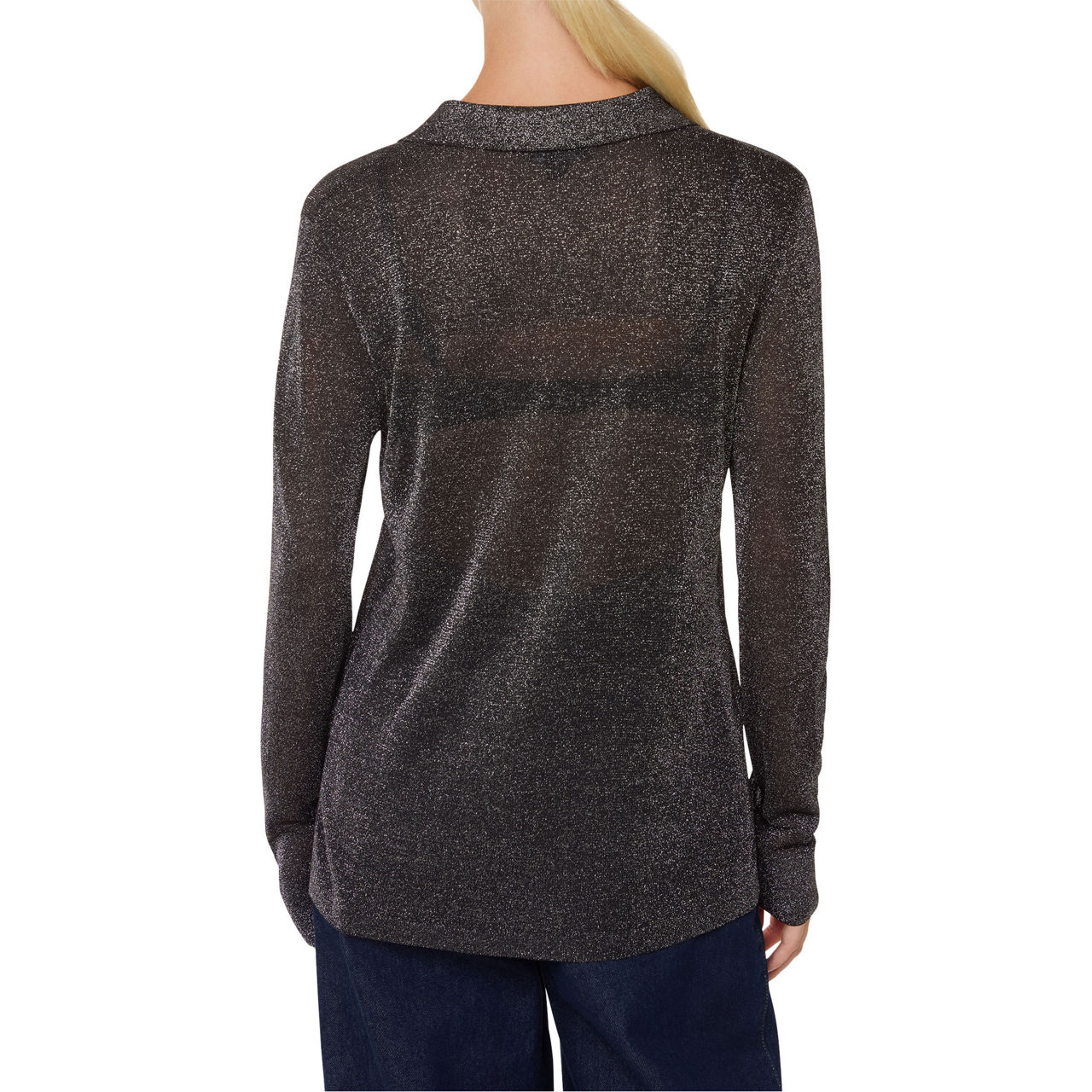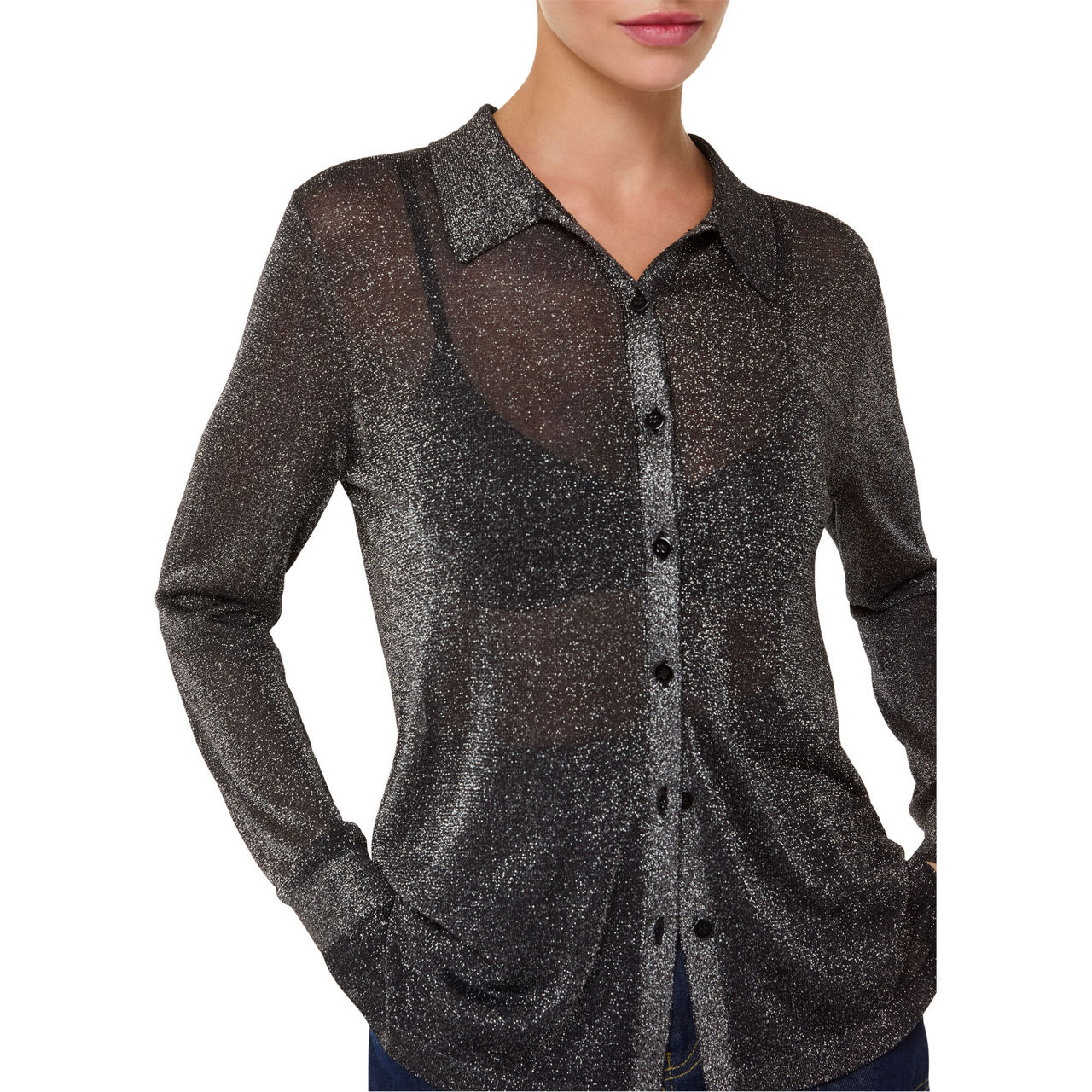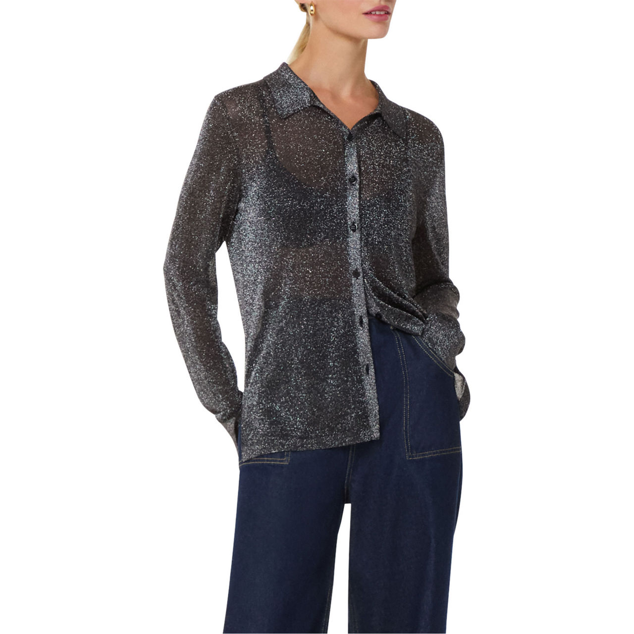 - Point collar, long sleeves, buttoned cuffs, front button fastening, straight hem, semi-sheer design, metallic thread detailing, sparkle finish