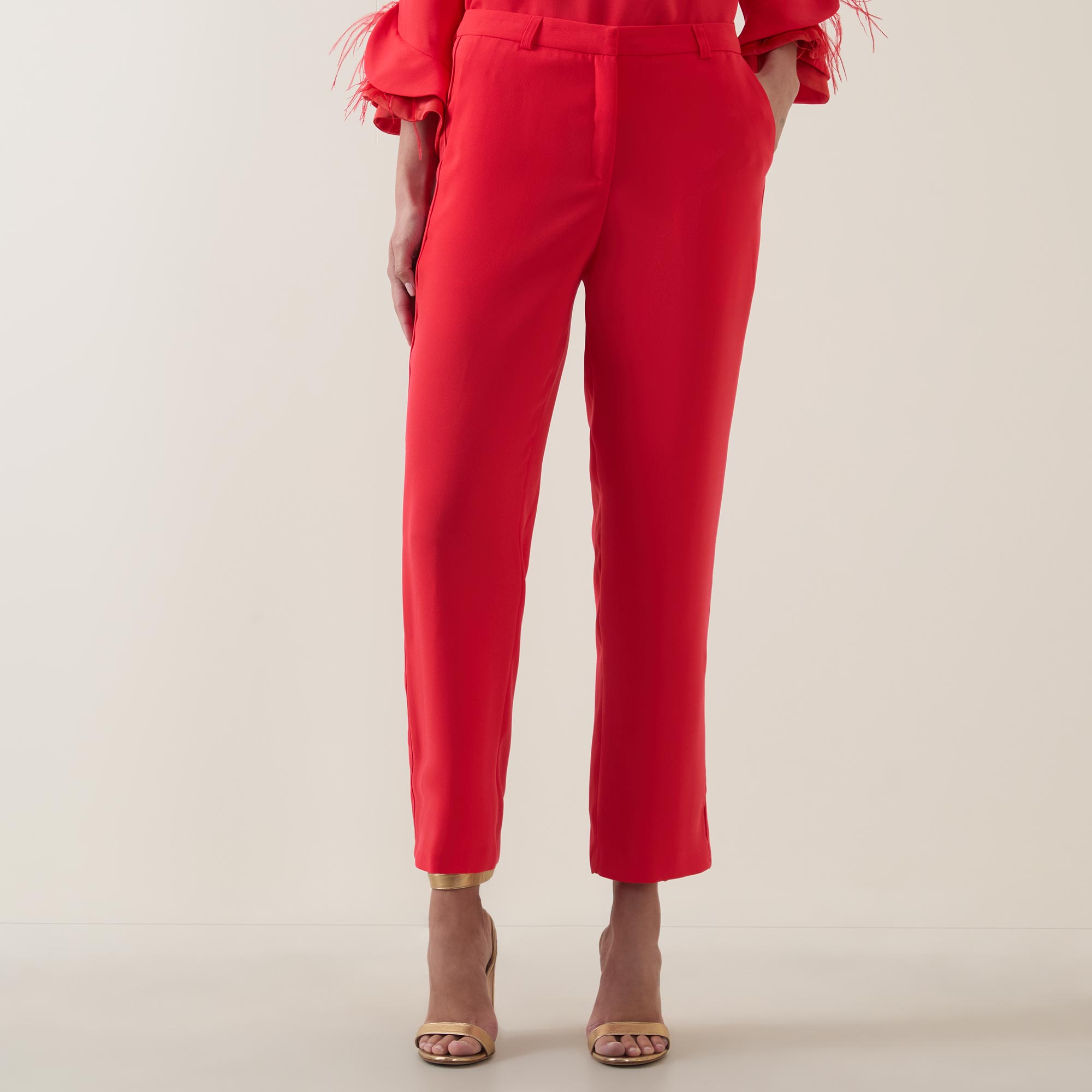 - Mid-rise, slim-leg, covered waistband, belt loops, concealed fly with hook and bar fastening, two side in seam pockets, clean hems, pressed creases, smooth finish