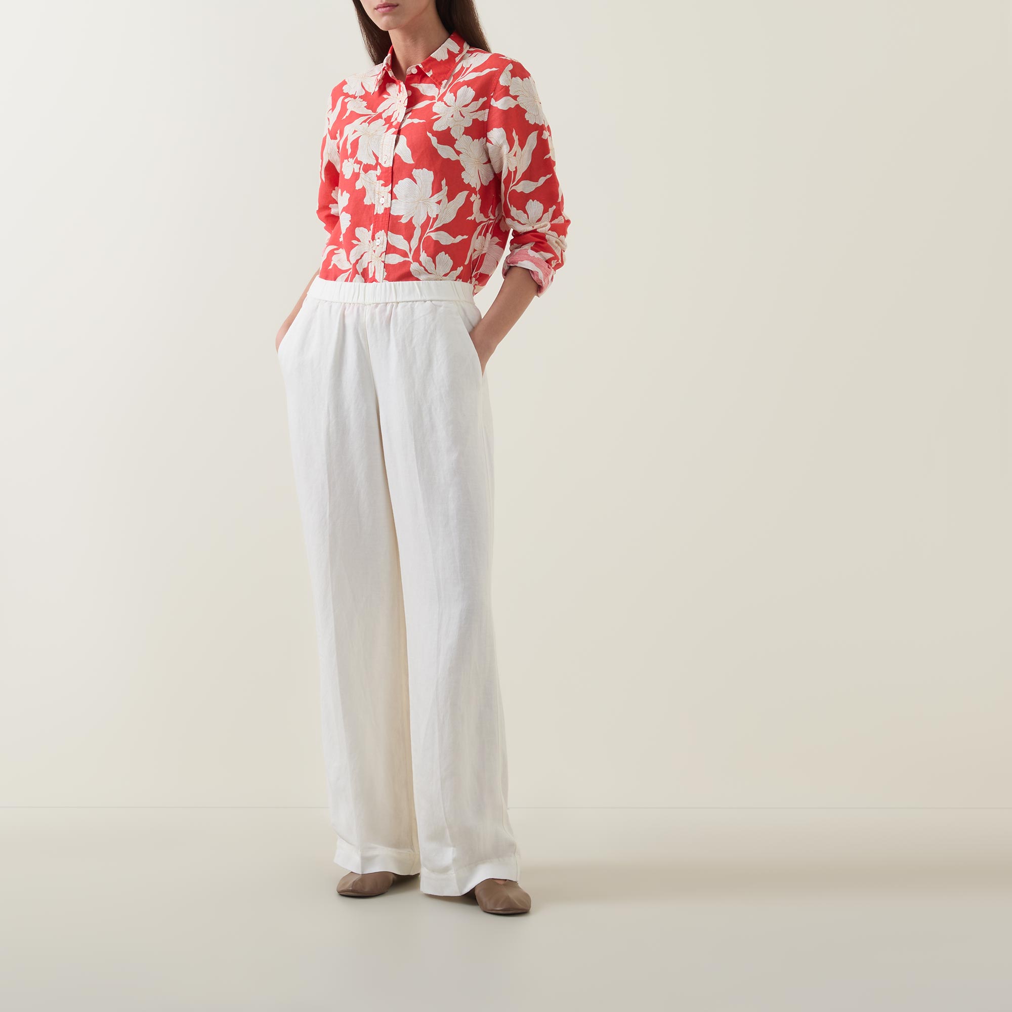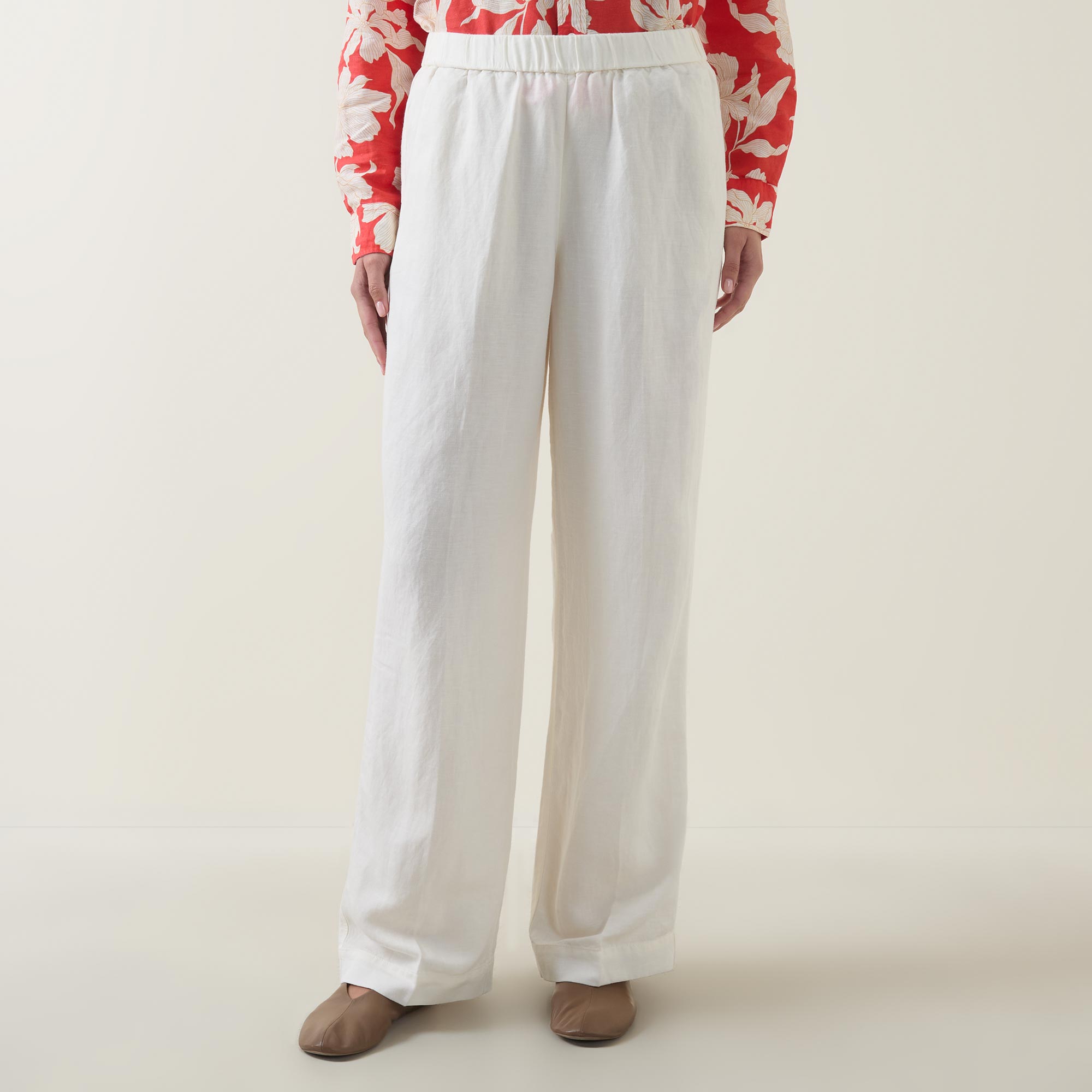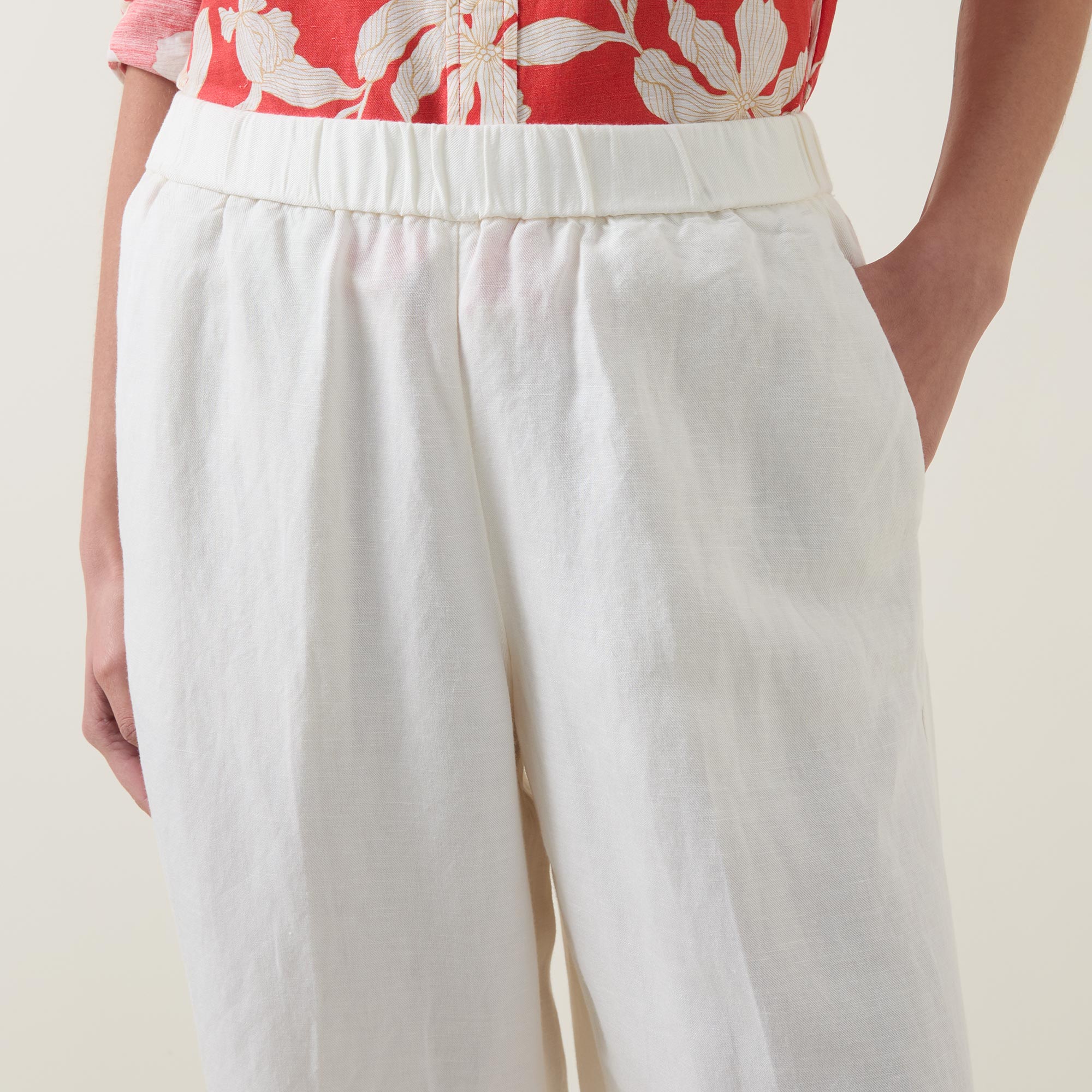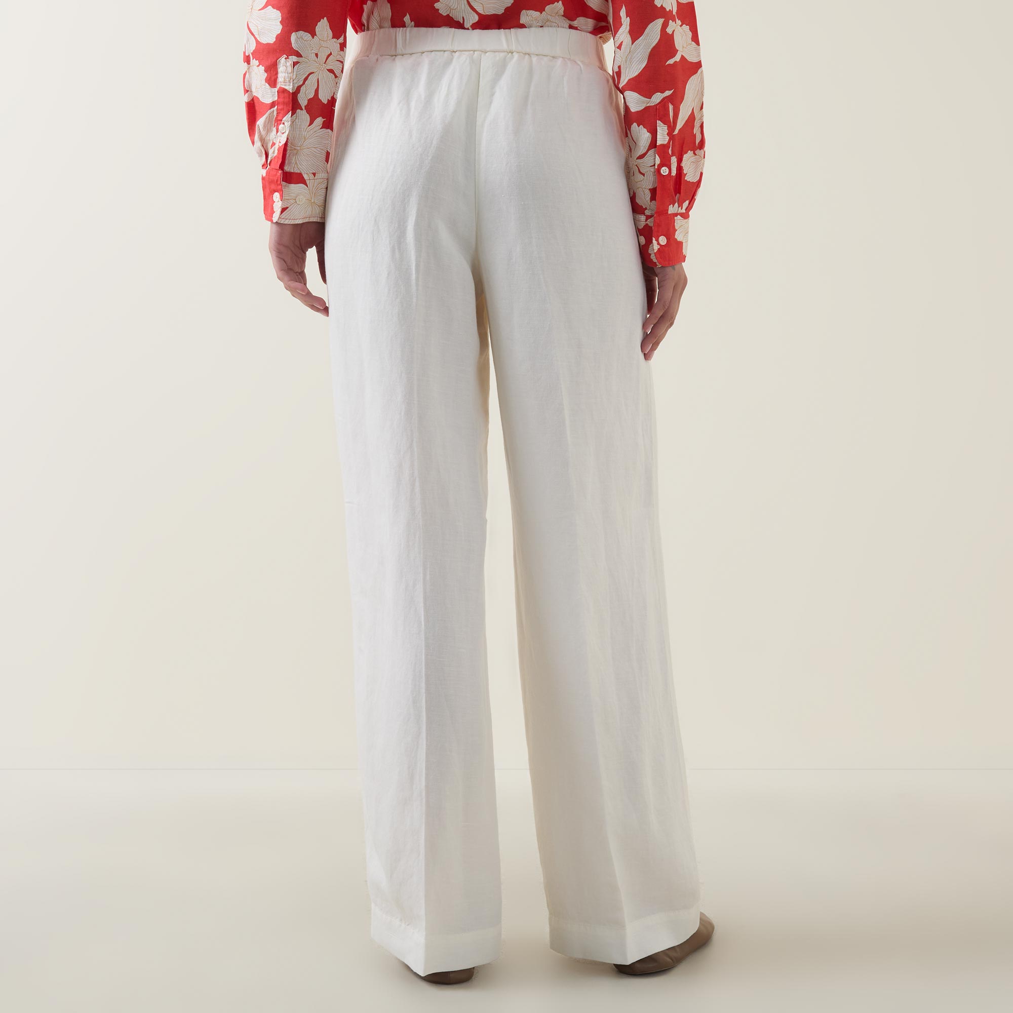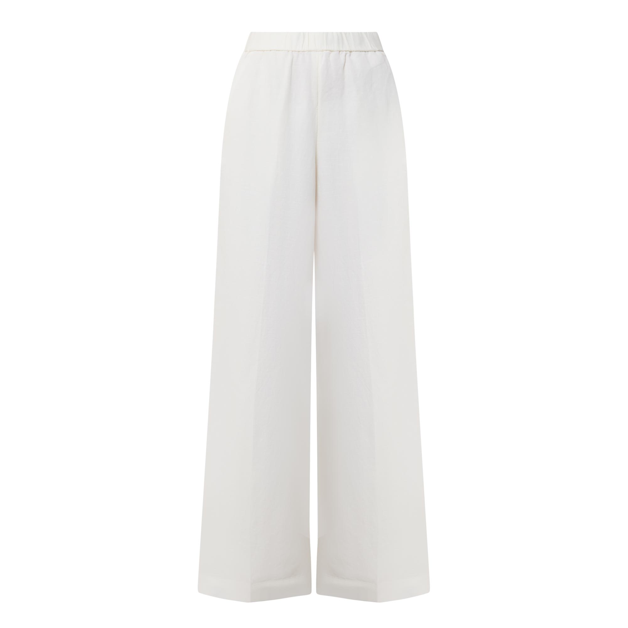 - Mid-rise, straight-leg, elasticated waistband, two side in seam pockets, clean hems, pressed creases, tonal stitching