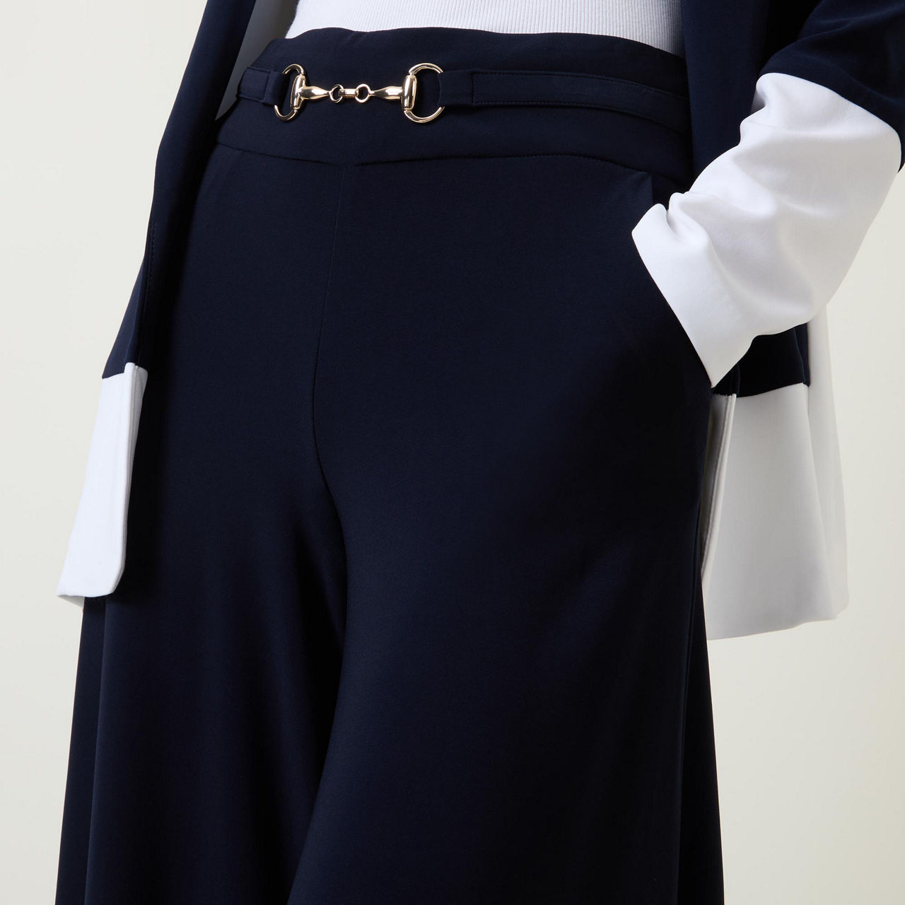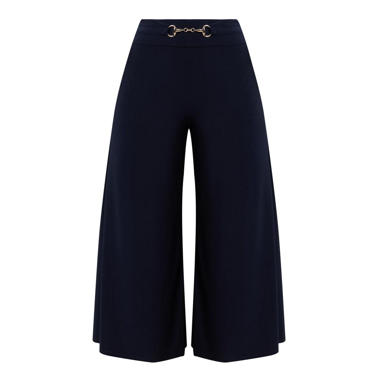 - Mid-rise, wide-leg, culotte style, silver-tone horse bit hardware, clean hems, stretch-fabric, smooth finish