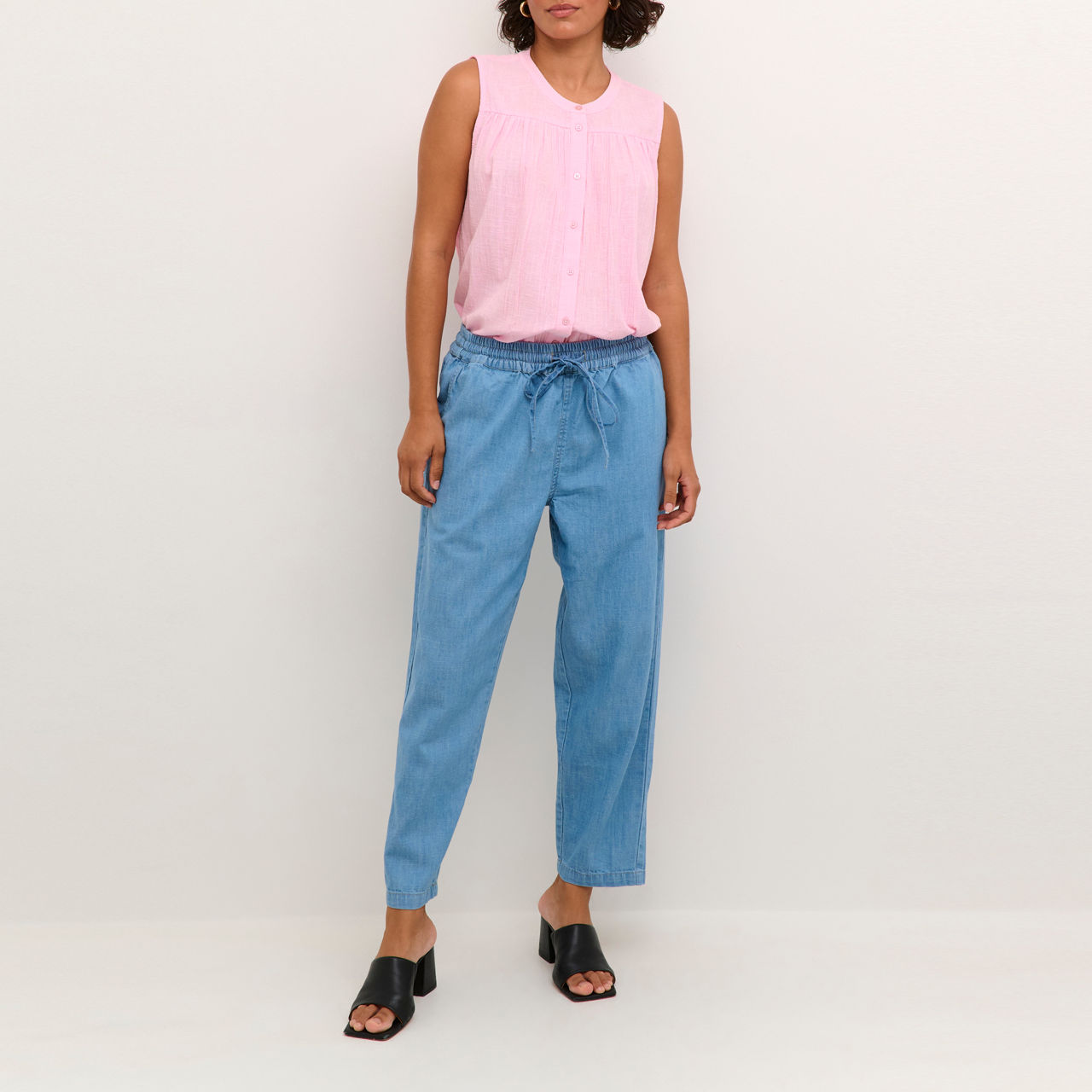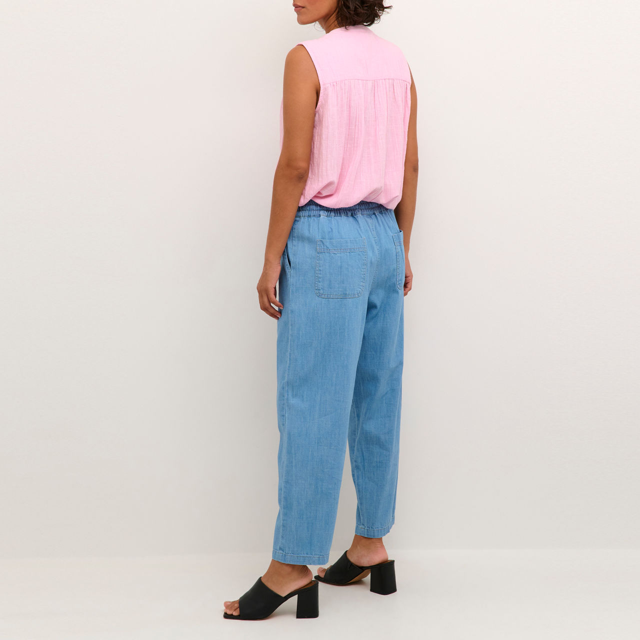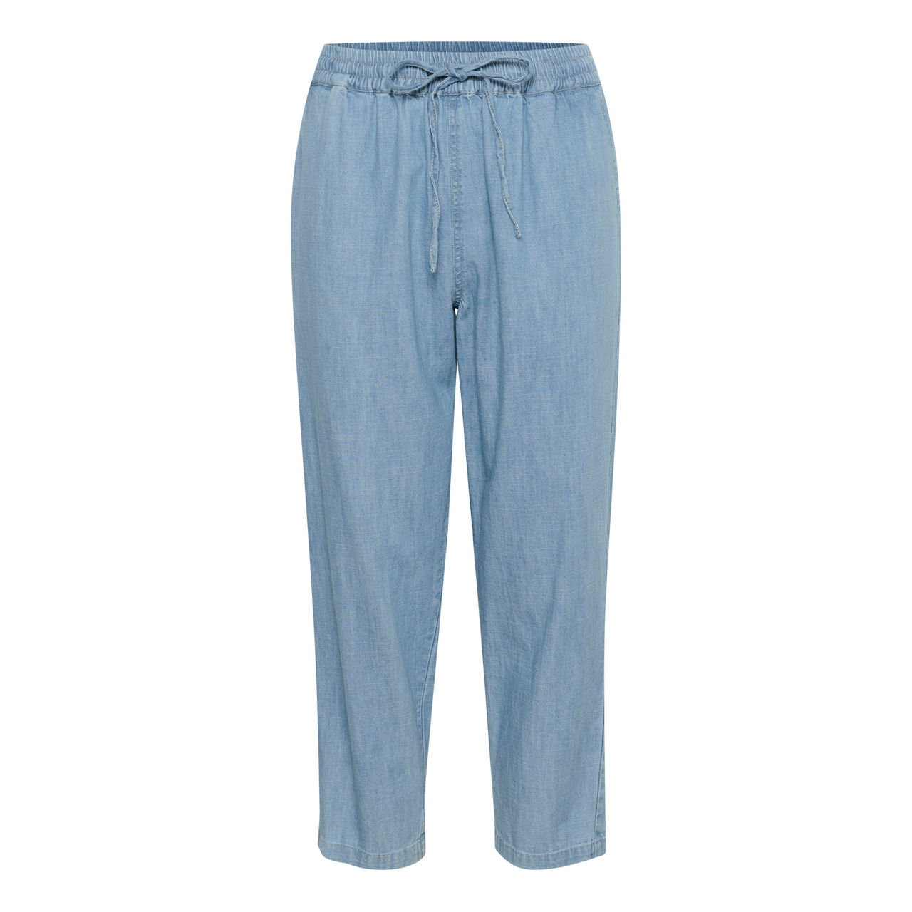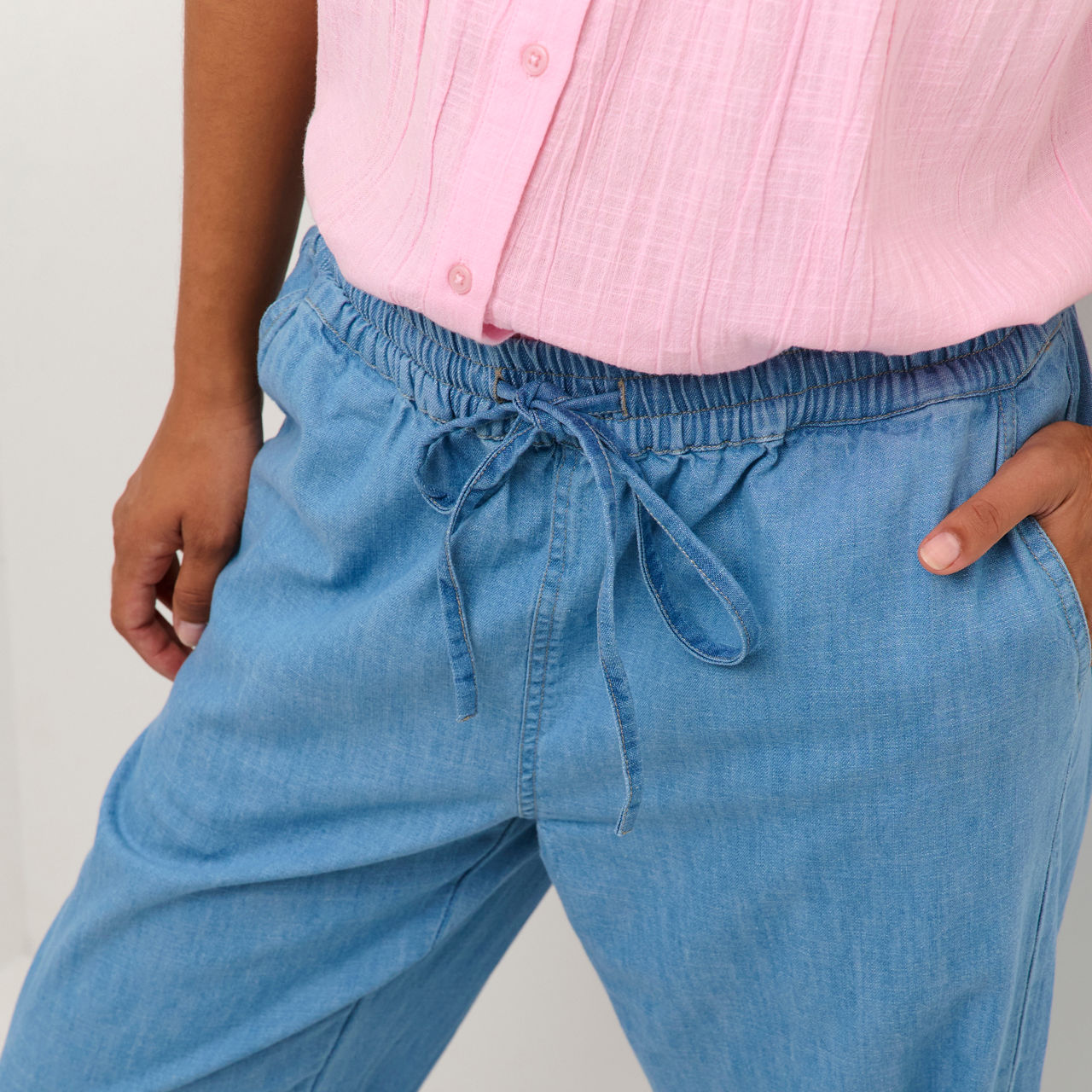 - Soft denim fabric, elasticated waistband, drawstring fastening, side pockets, rear patch pockets