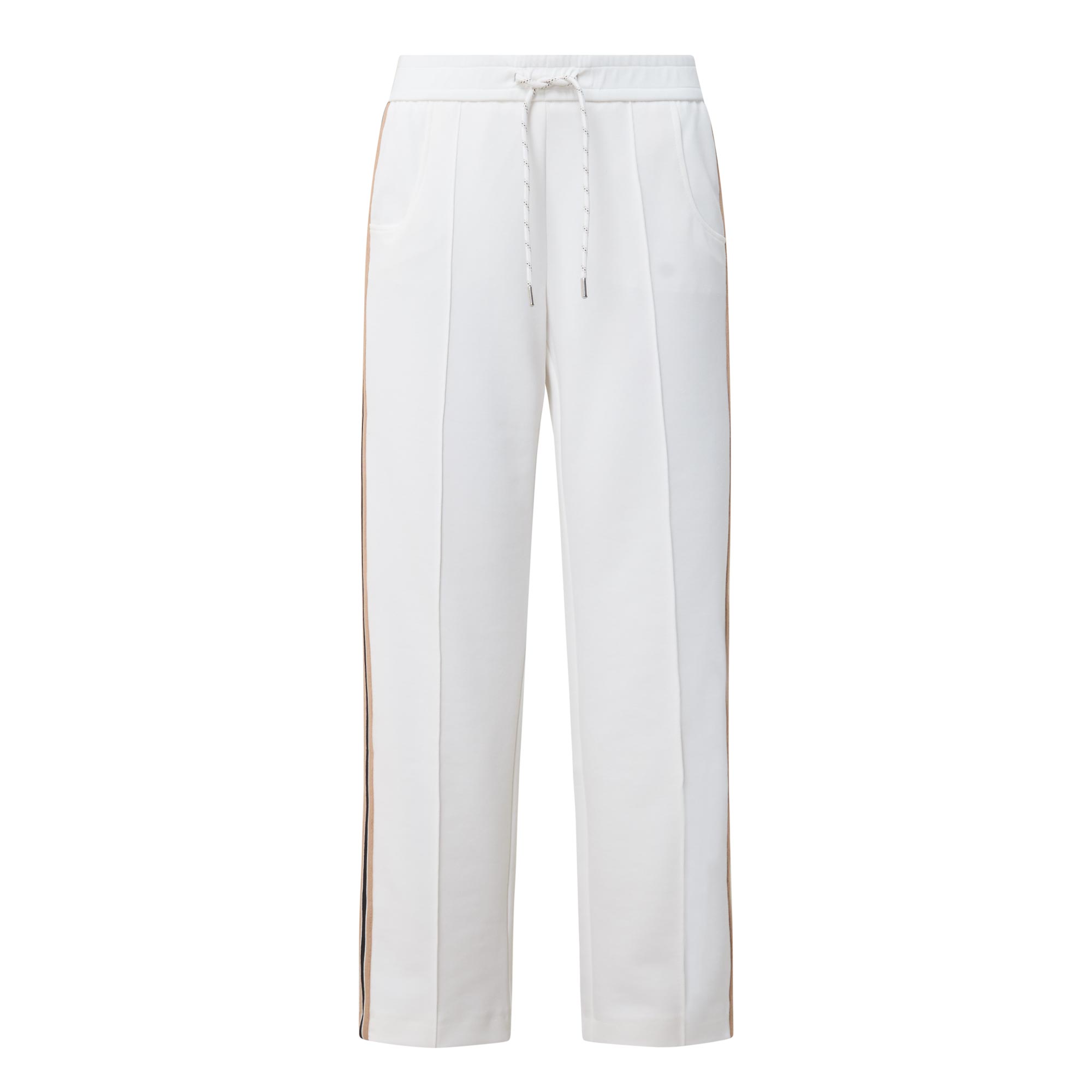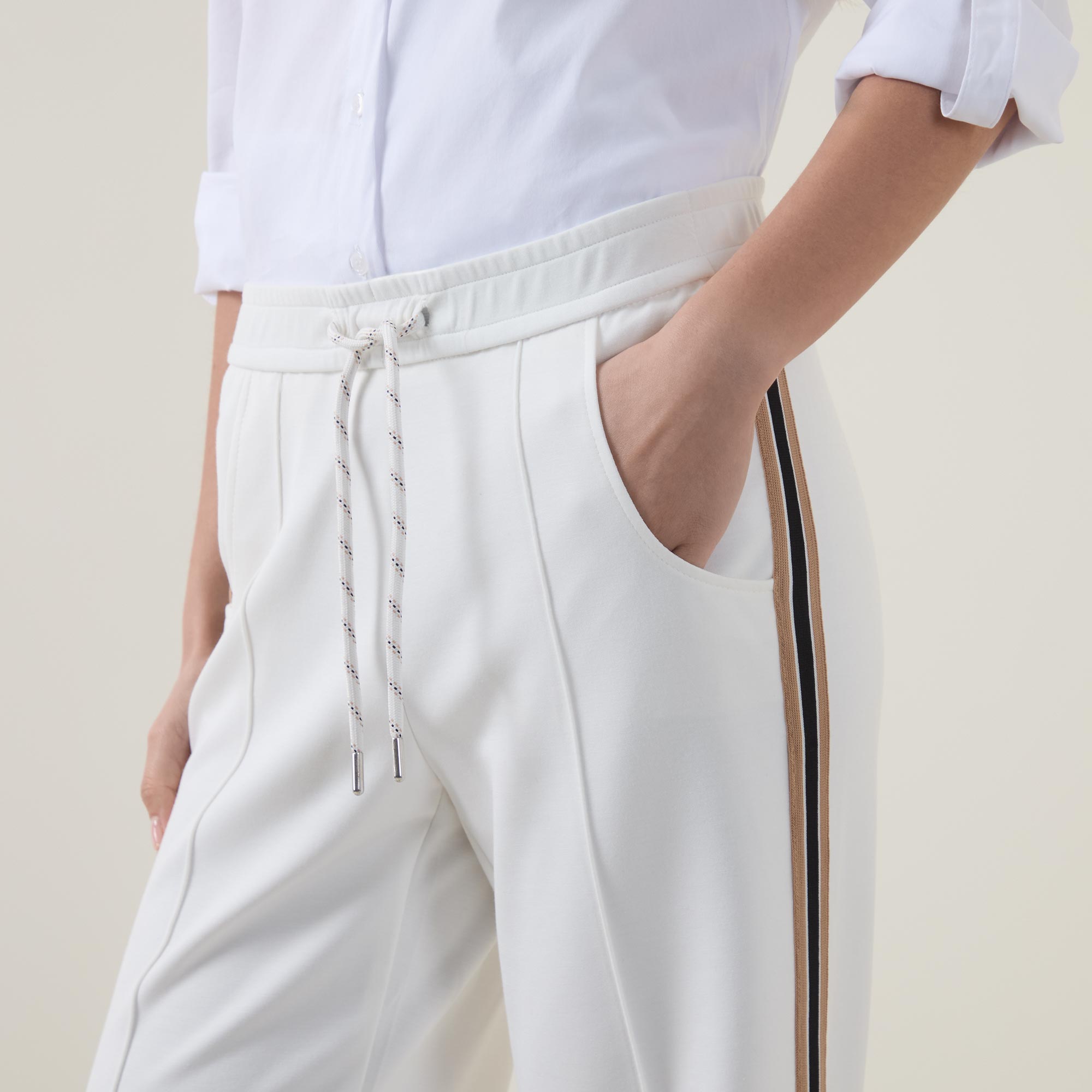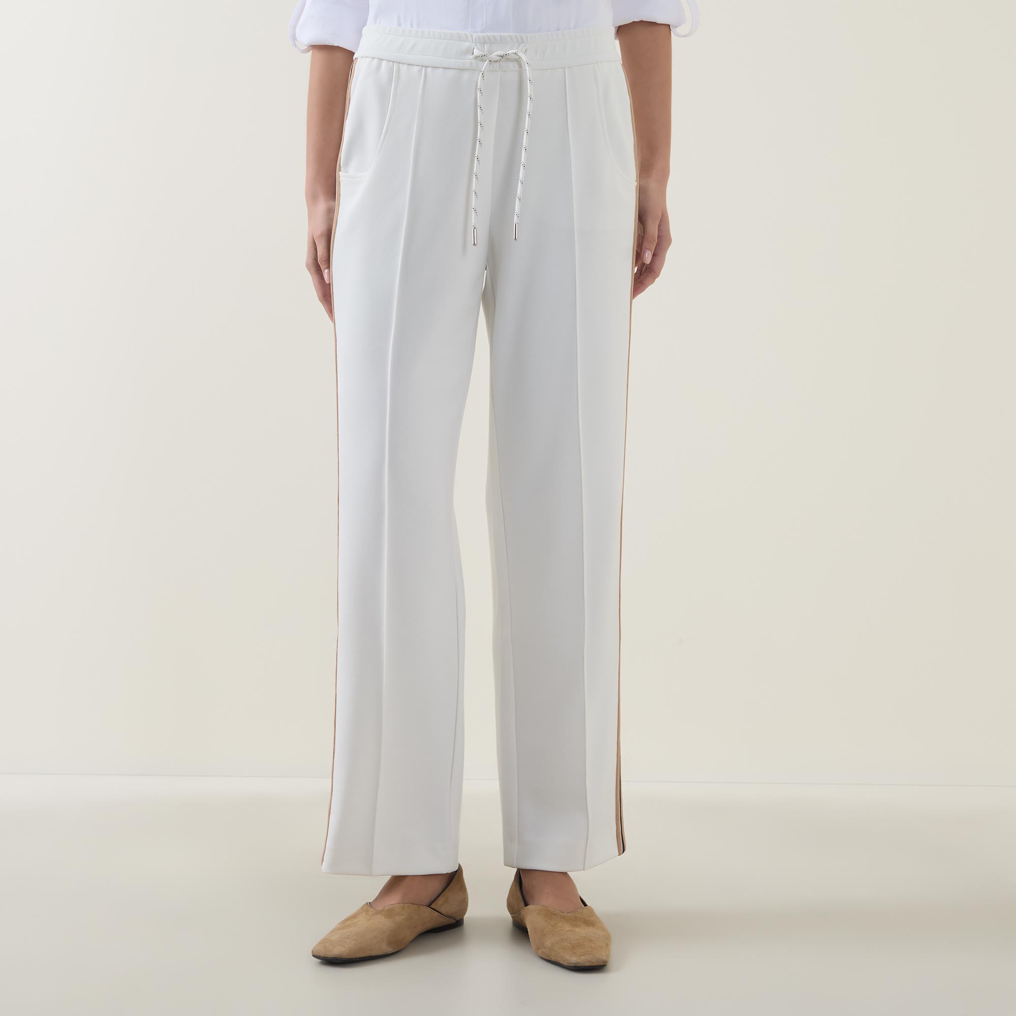 - Elasticated waistband with drawstring adjustable fit, side entry pockets, stripe pattern at side seam, wide-cut legs