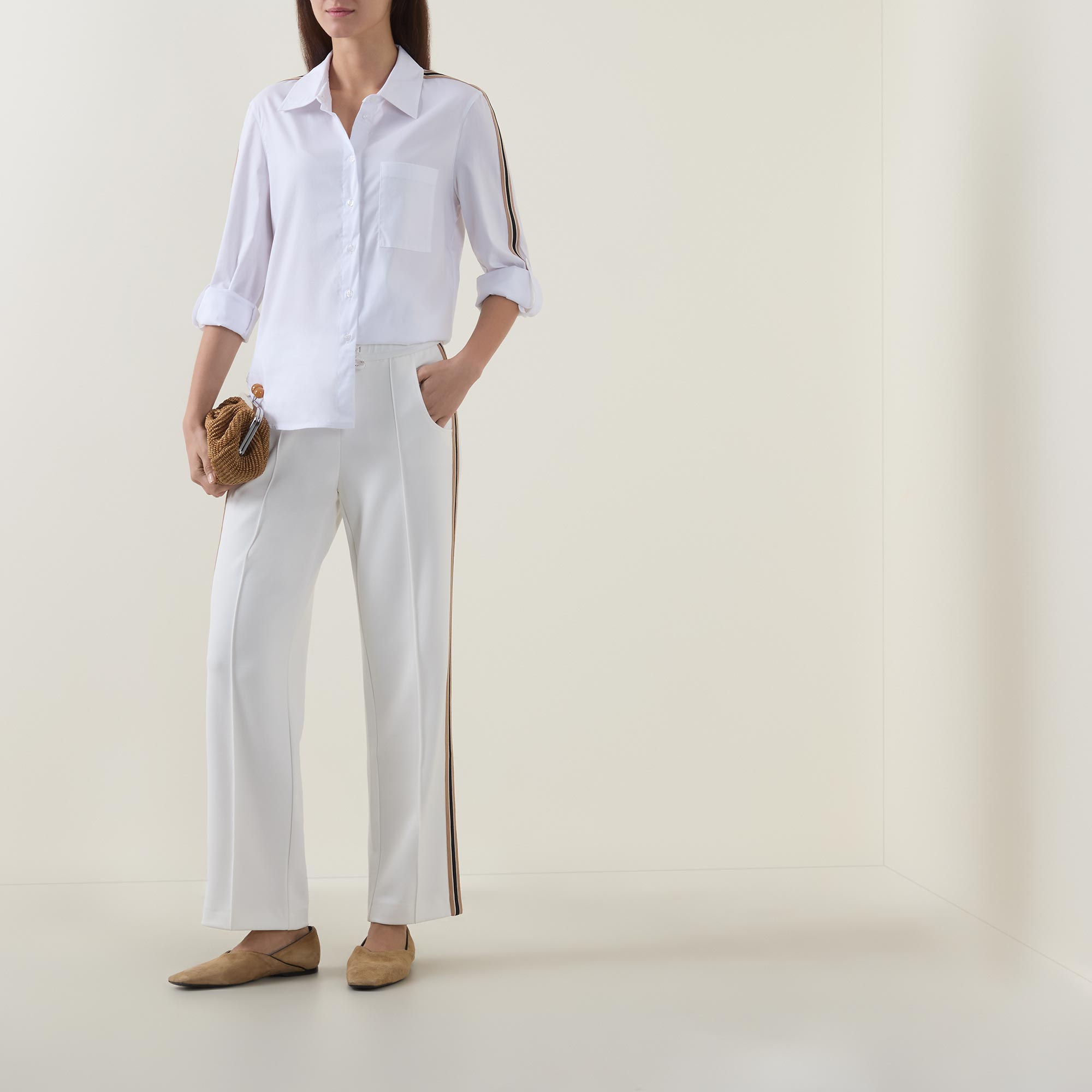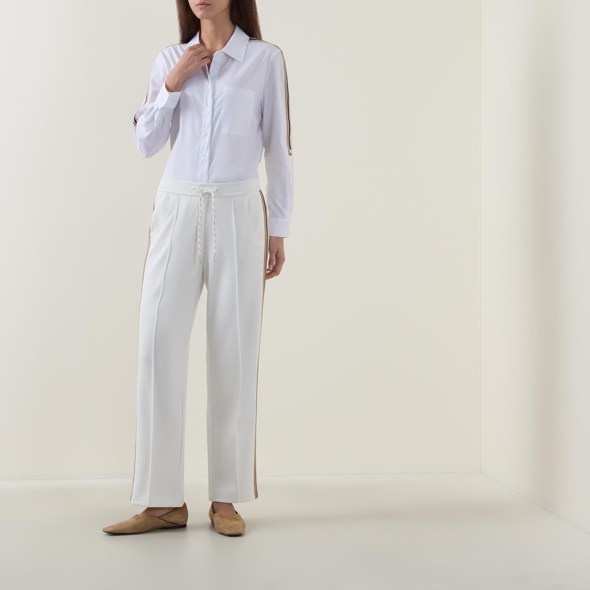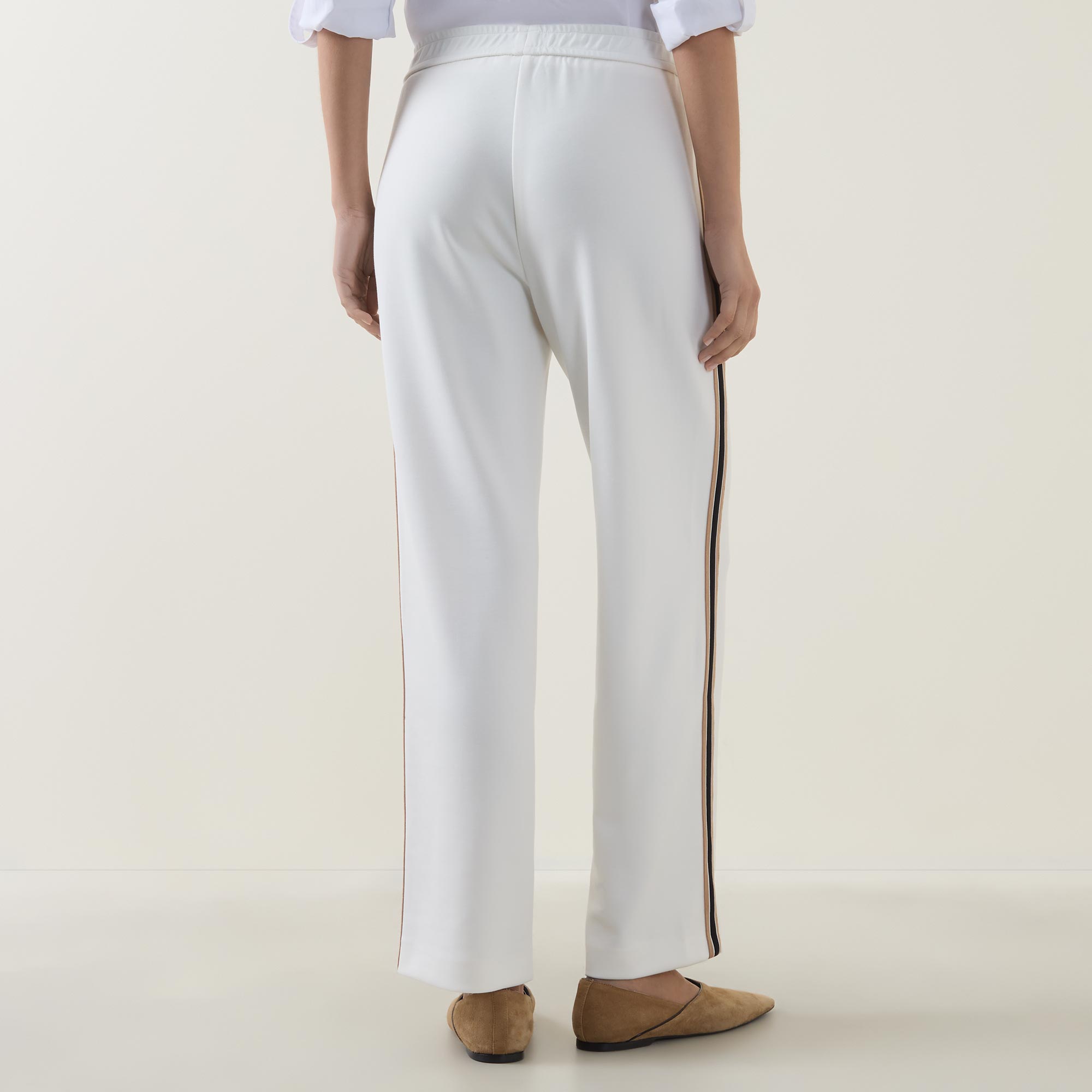 - Elasticated waistband with drawstring adjustable fit, side entry pockets, stripe pattern at side seam, wide-cut legs