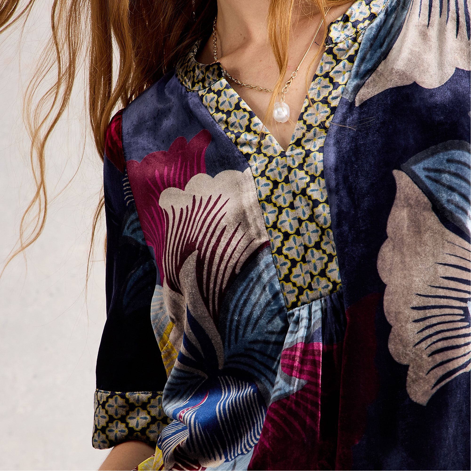 - Velvet fabric, floral print, notch neckline, contrast trim, short sleeves