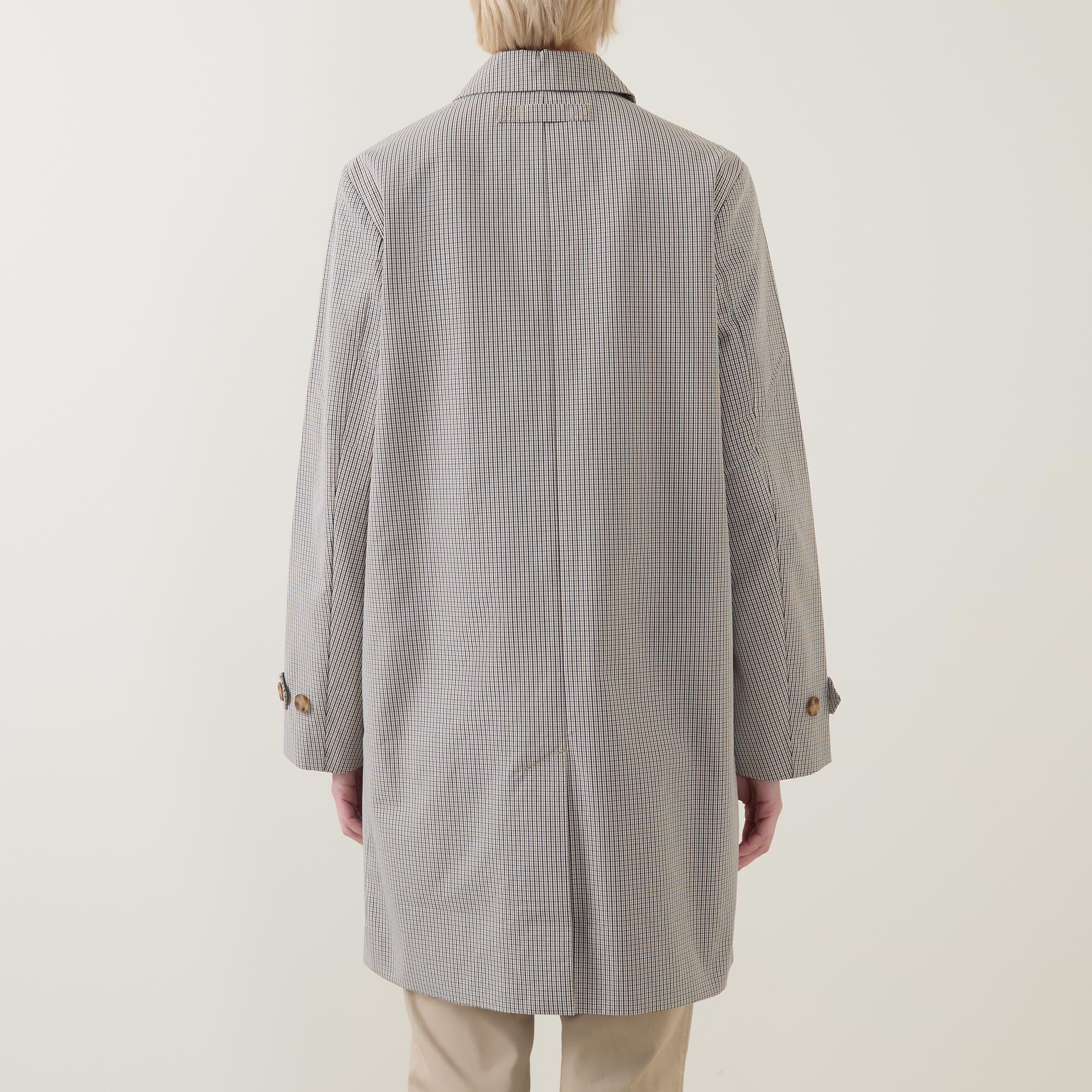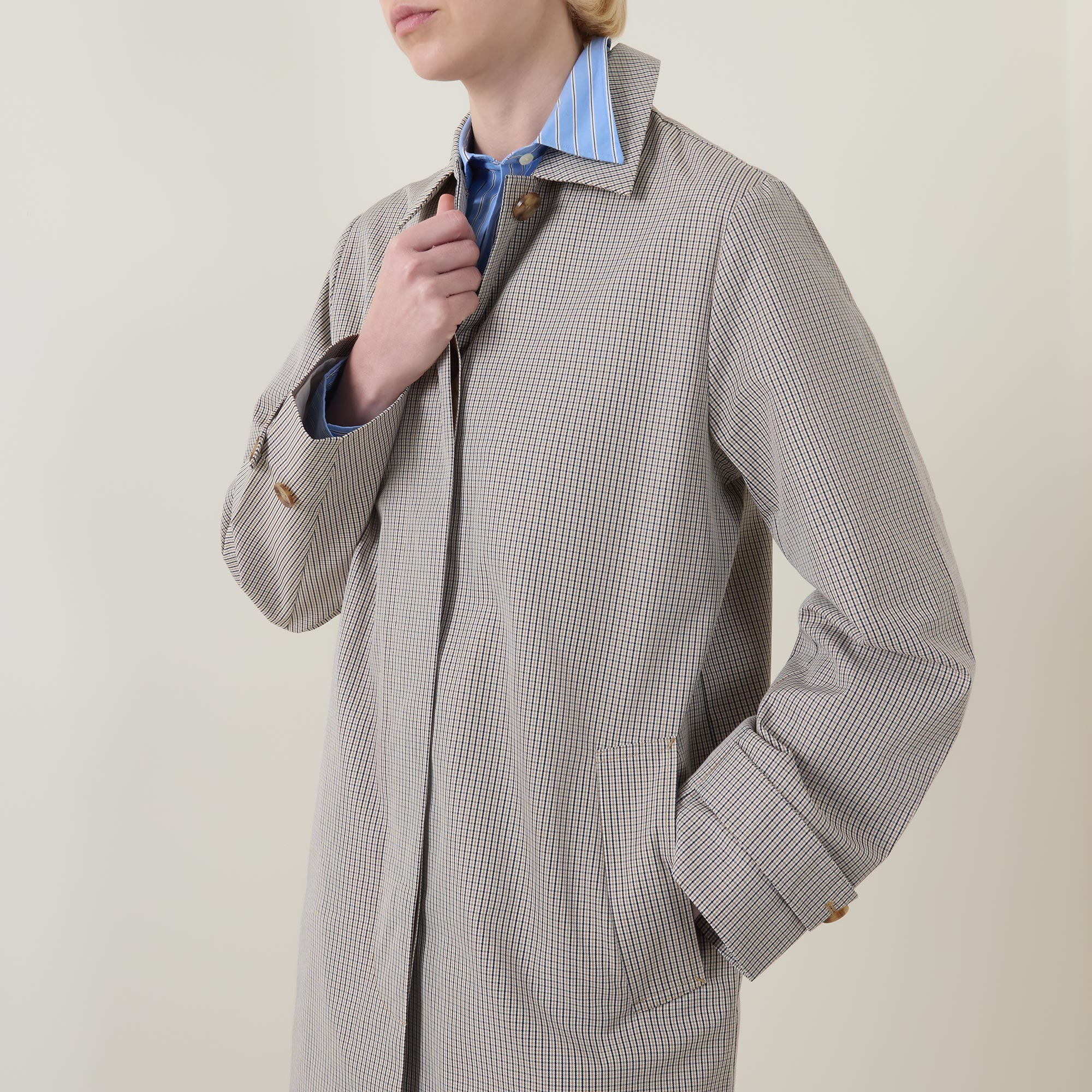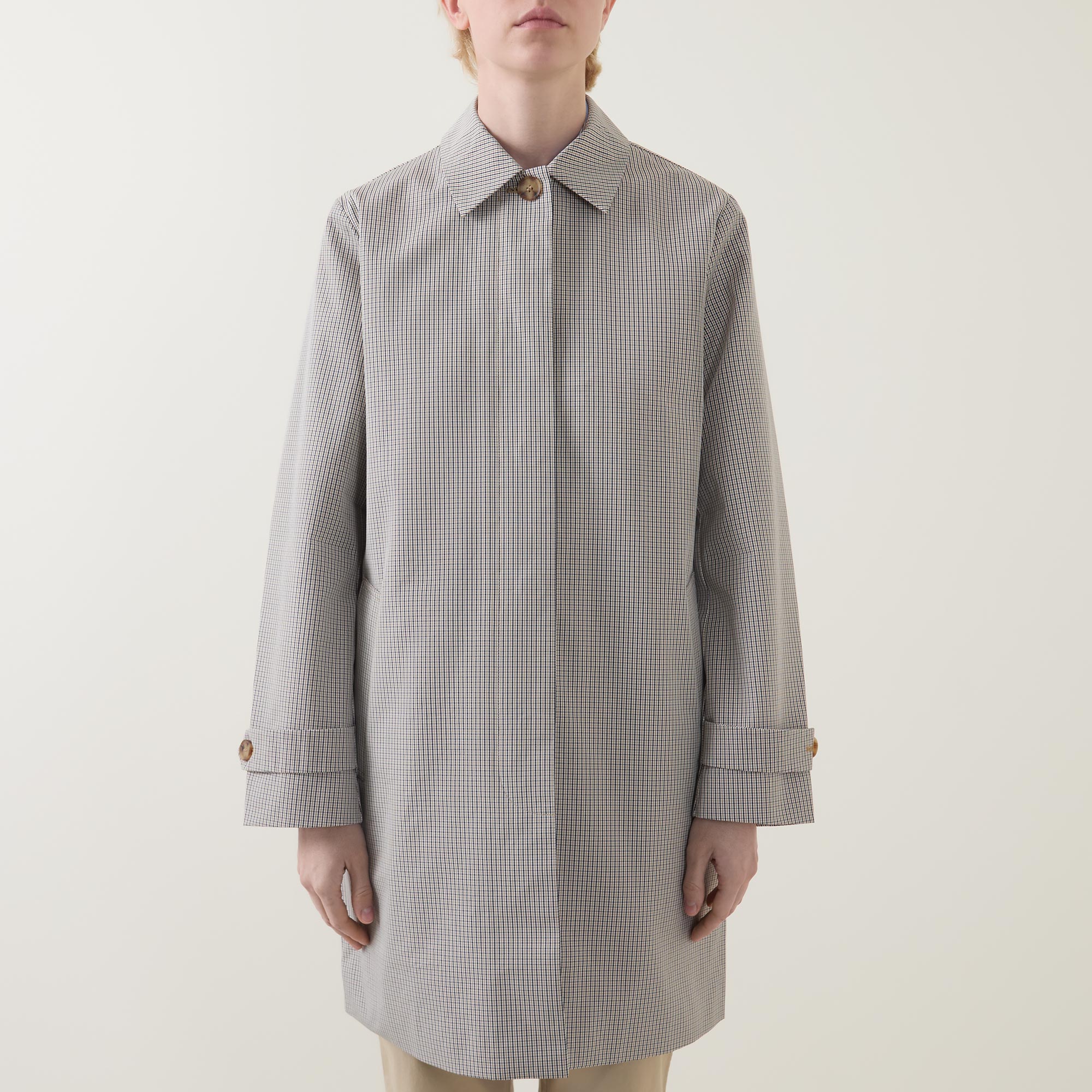 - Point collar, dropped shoulders, long sleeves, tabbed cuffs with button fastenings, concealed front placket with visible top button, two side welt pockets, straight hem, rear vent, hanging loop, check print, lined