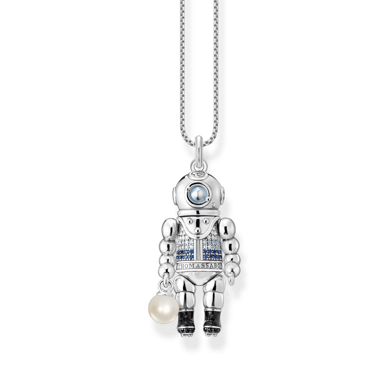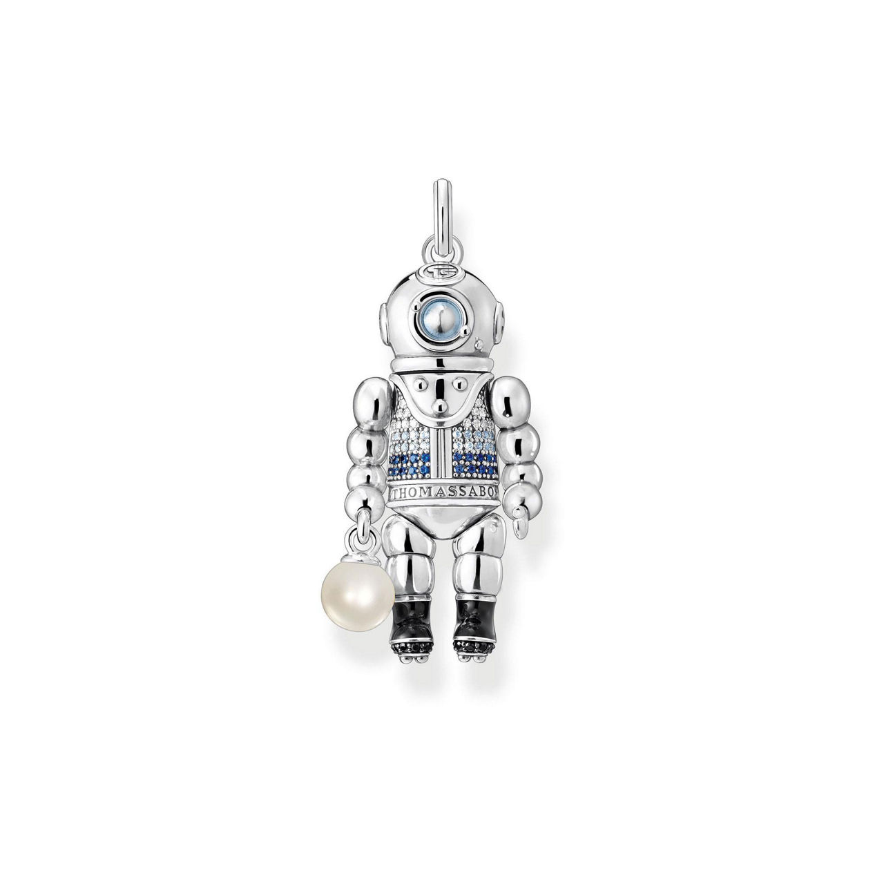 Just dive in. This playful and richly detailed movable diver pendant is perfect for adding to your existing Thomas Sabo silver chains. Complete with a pearl diving bell, it features hand-set gemstones in a colour gradient from white to aquamarine to intense dark blue that skilfully accentuate the diving suit.