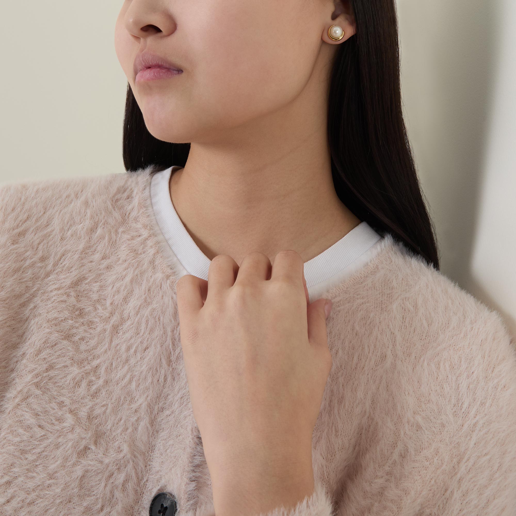 - Pearl detail, gold-toned hardware, stud fastenings