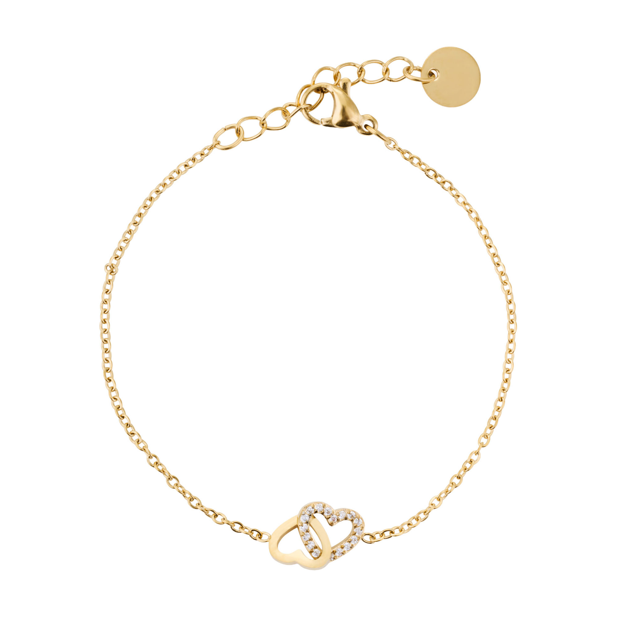 - Infinity design, intertwined heart detailing, stainless steel base, thick 18kt gold-plating, tarnish-resistant, water-resistant