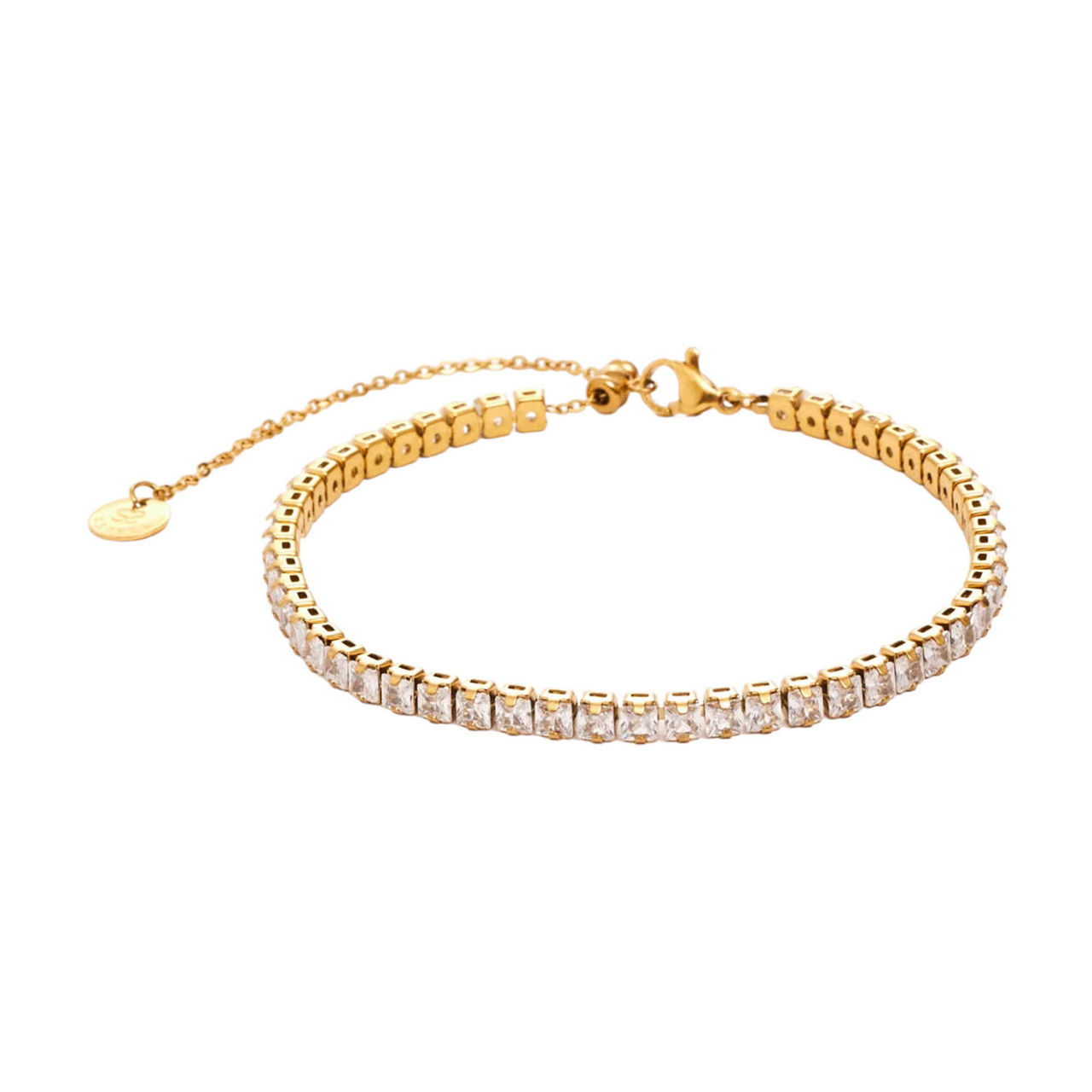 • Stone embellishment, tennis bracelet style, lobster clasp fastening, adjustable fit, gold-plated, tarnish and water resistant, hypoallergenic, presented in a gift box