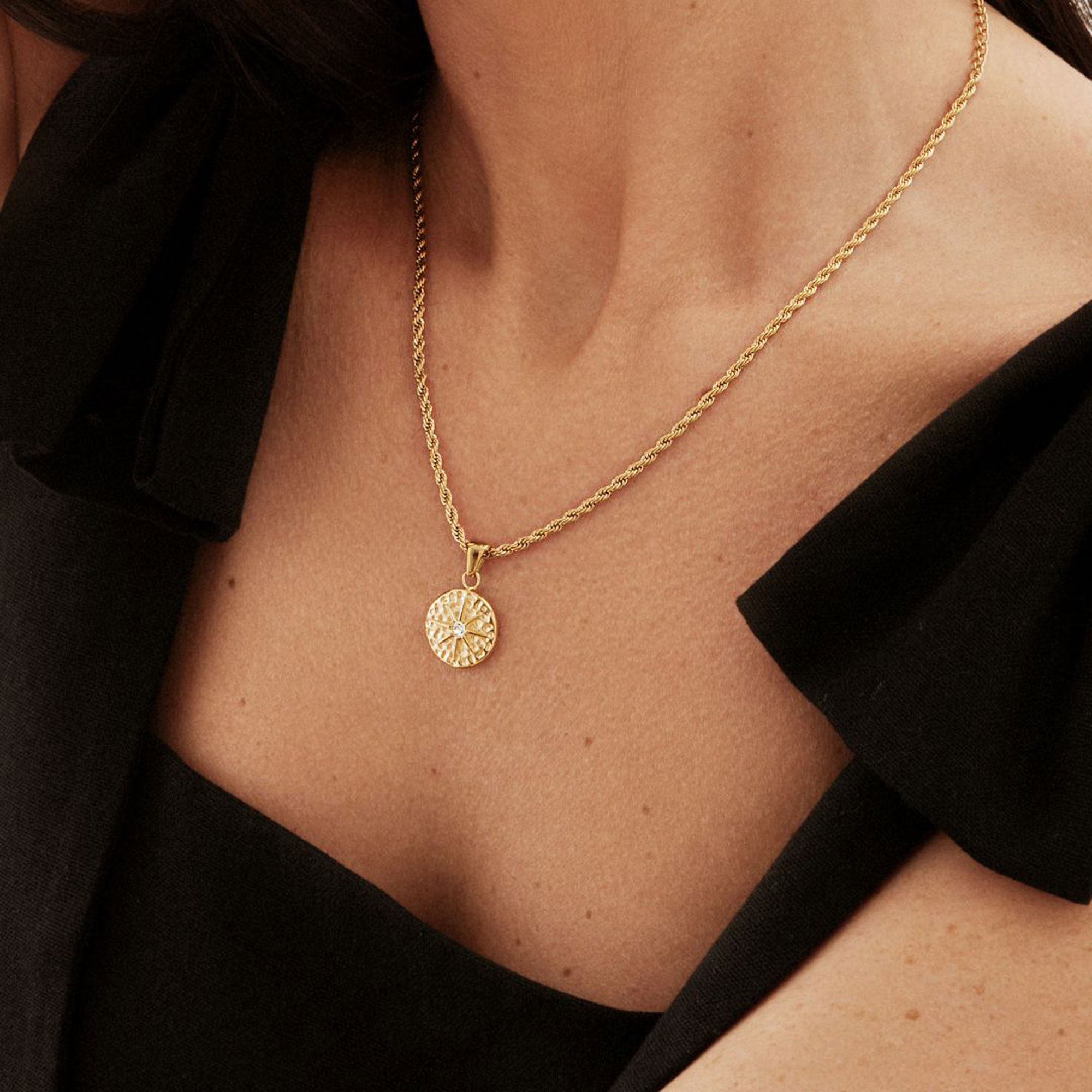 - Hammered round pendant, raised star motif, centre stone, rope chain, PVD coating, water-resistant finish, tarnish-resistant finish, 18kt gold-plating