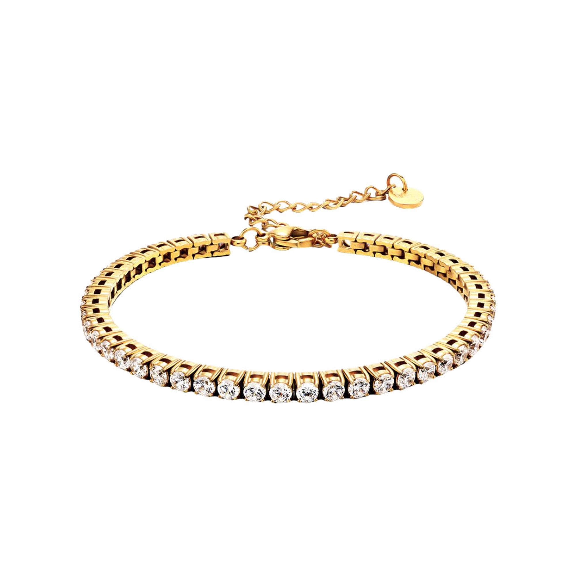 - Tennis style, stone embellishment, symmetrical design, lobster clasp fastening, adjustable length, brand logo detail, water and tarnish resistant