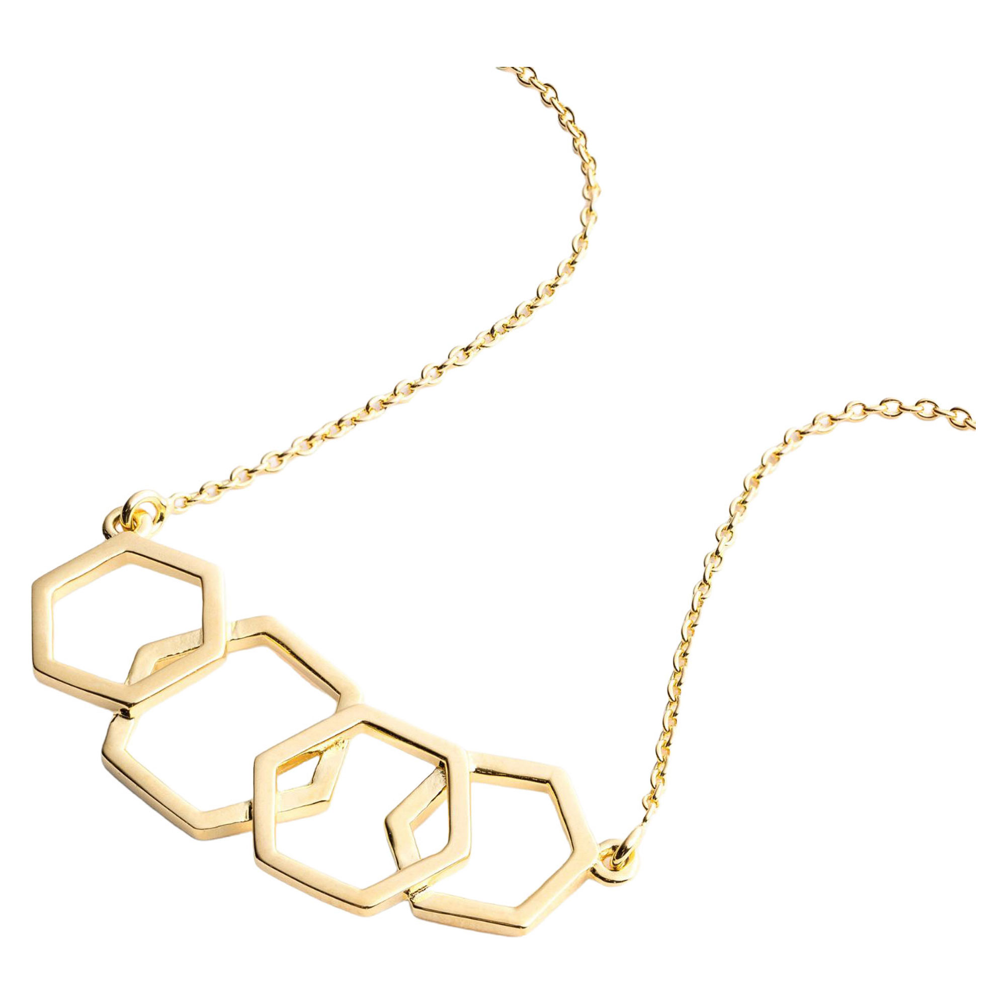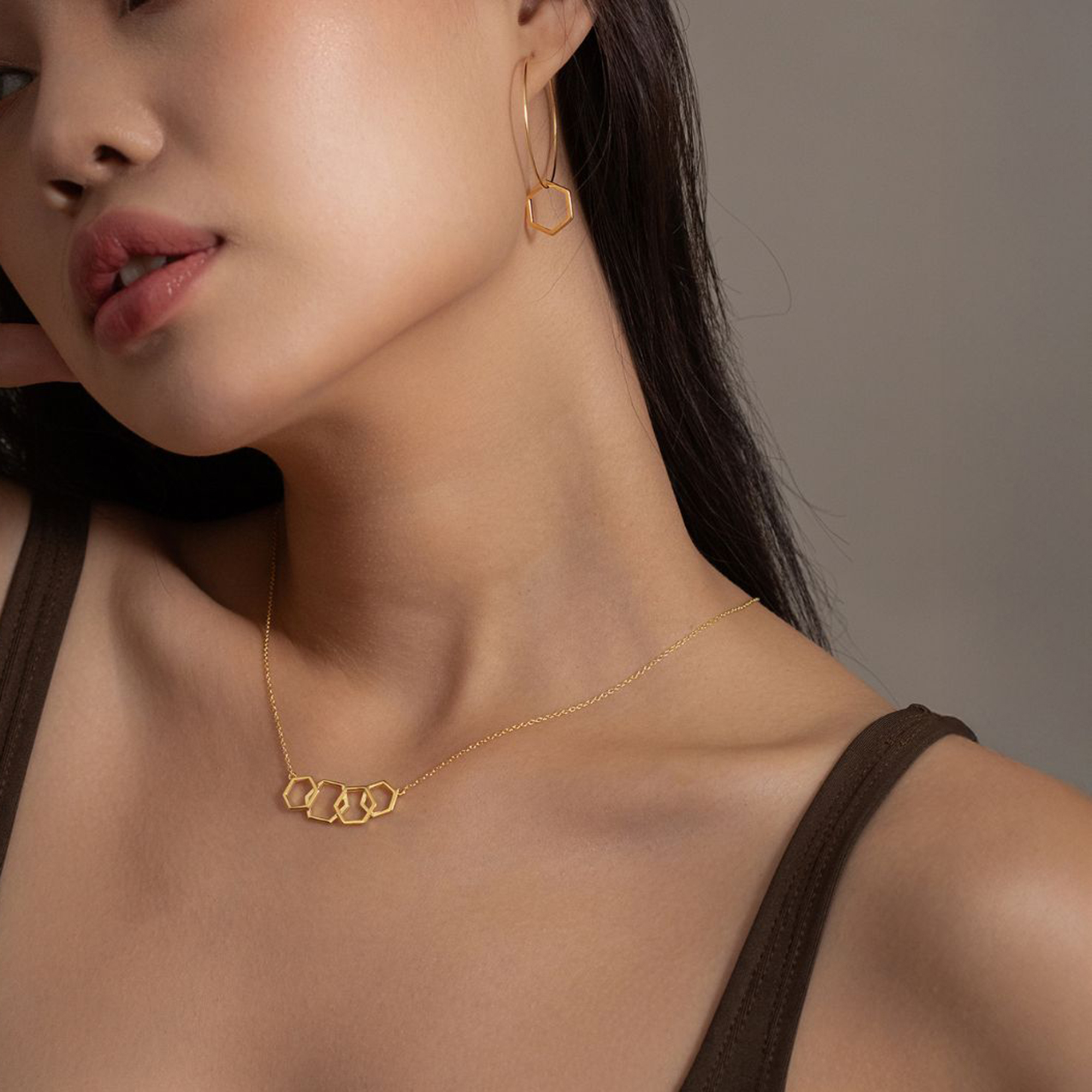 • Four fixed polished hexagons sit horizontally on a twinkling chain