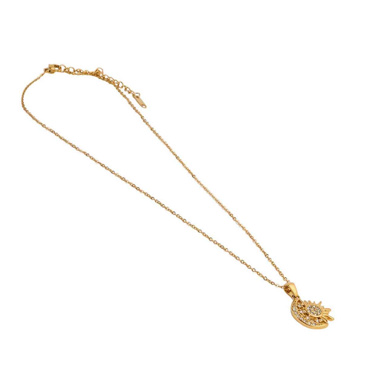 - Fine chain link, half moon and star charm, stone embellishment, lobster clasp fastening, adjustable fit, presented in a gift box