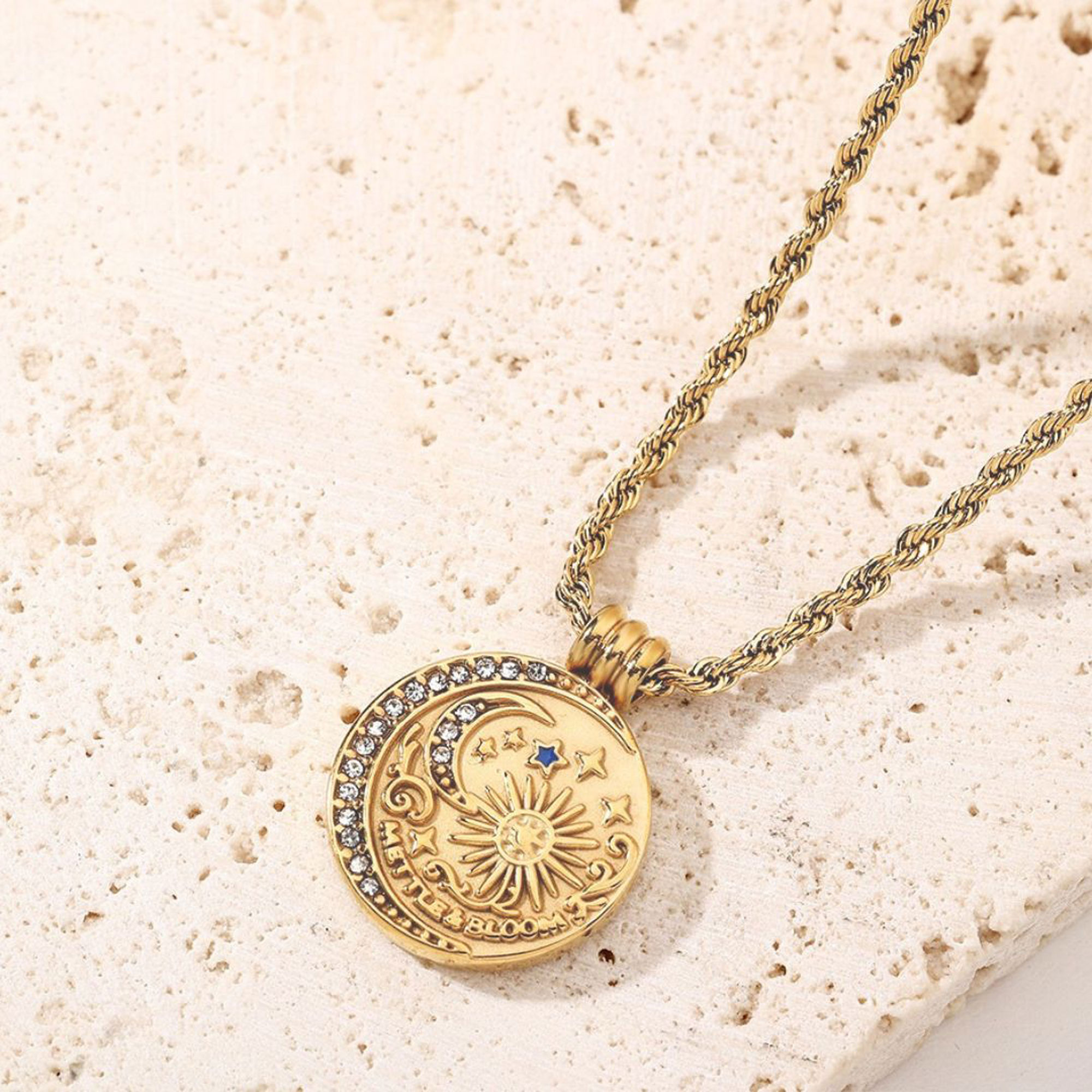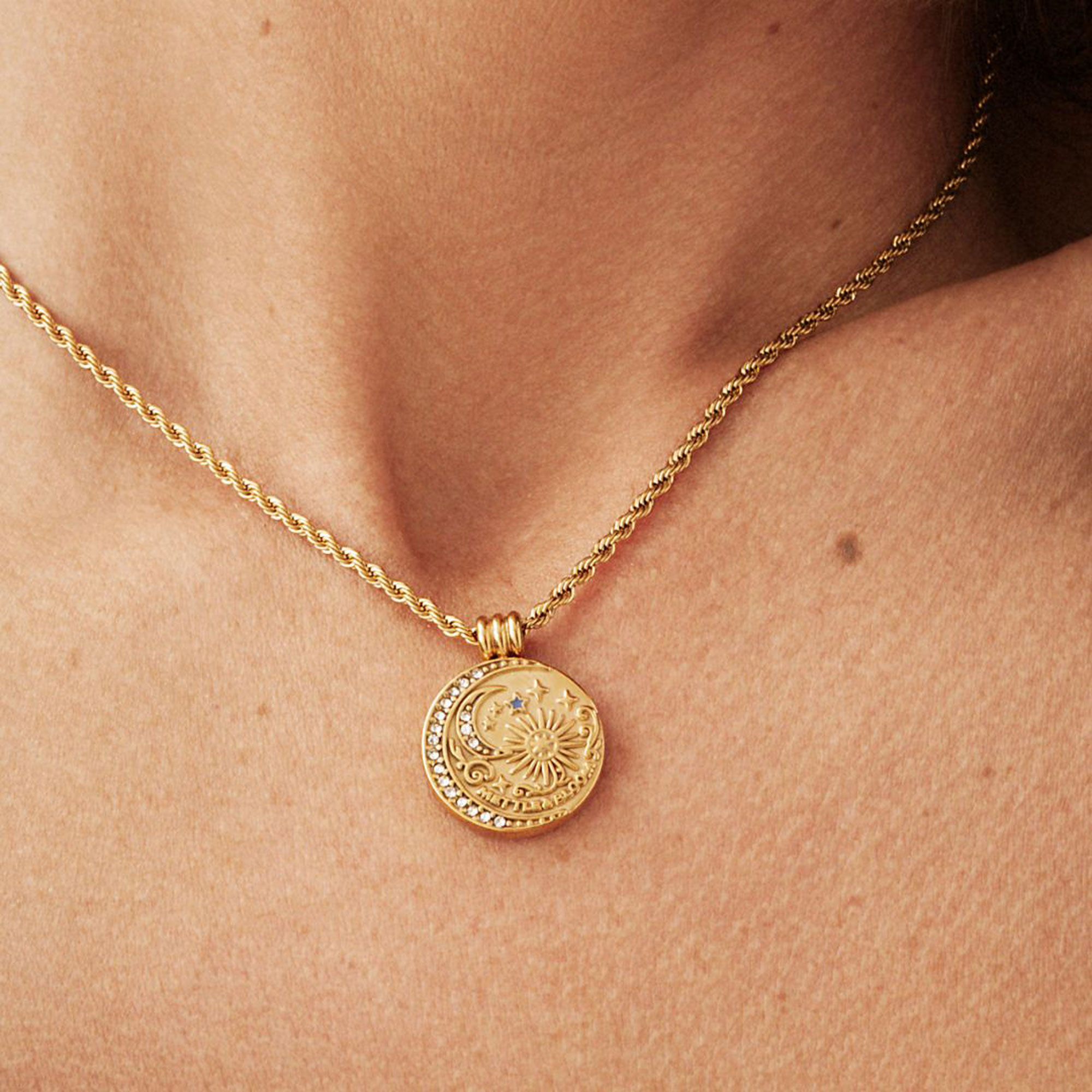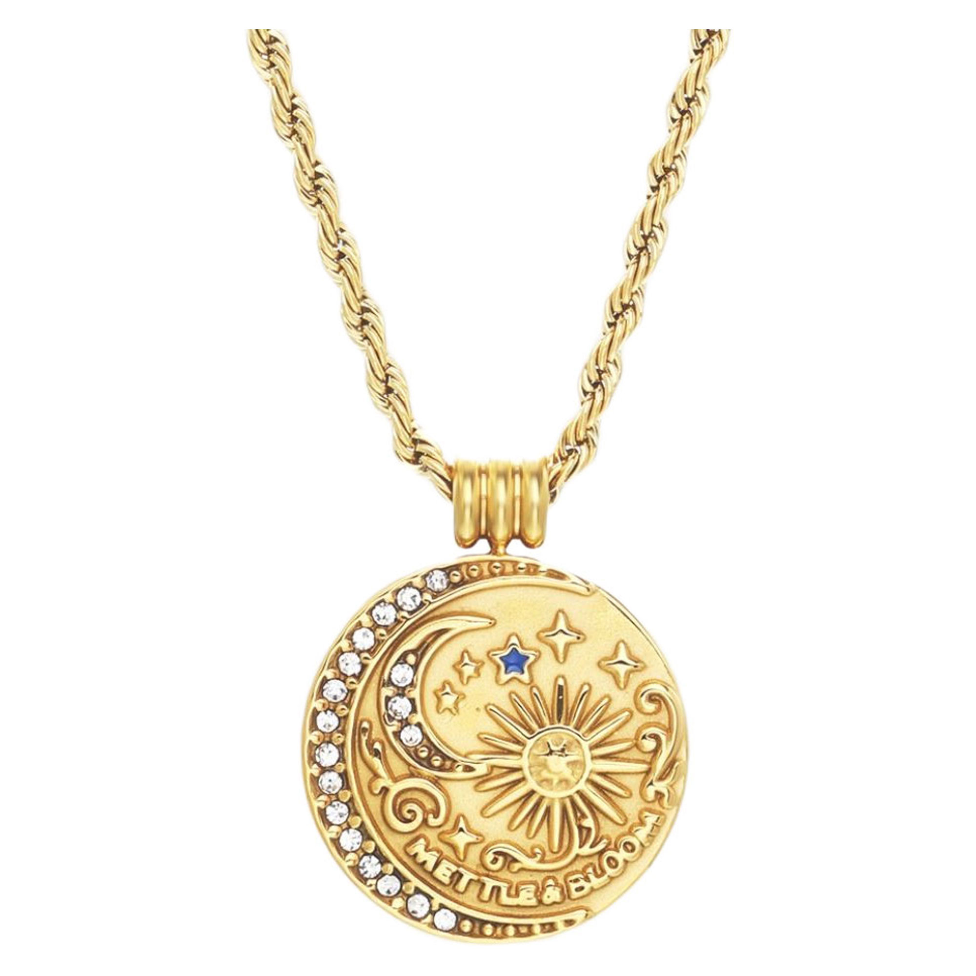 - Circular pendant, sun detailing, crescent moon detailing, stone embellishment, celestial motifs, twisted rope chain, water and tarnish resistant, suede pouch, story card enclosed