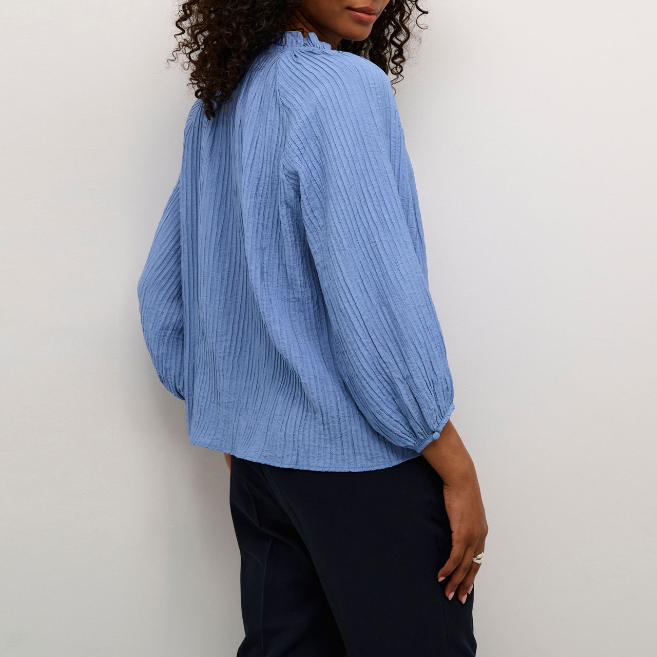 - V-notch neckline, front button fastenings, frilled collar with tie-fastening, three-quarter-length raglan sleeves, elasticated cuffs with button fastening