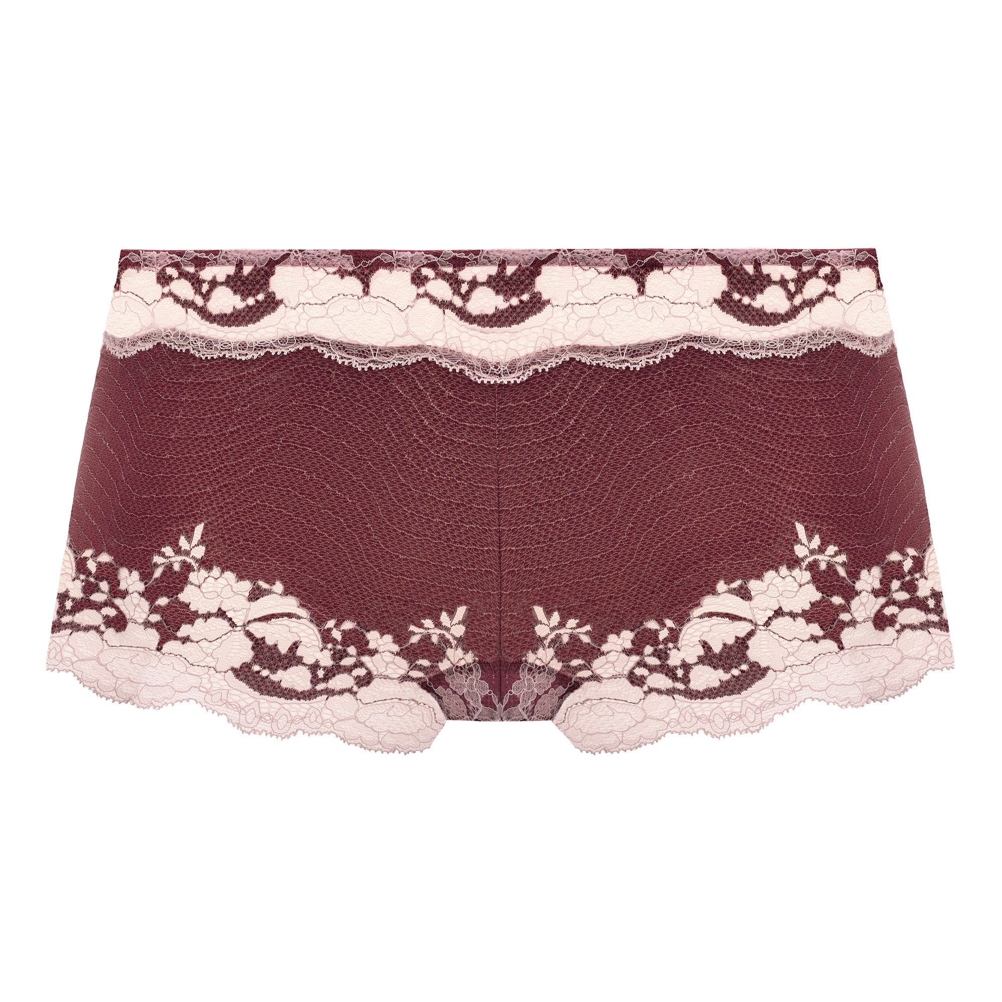 - Floral lace front and back, scalloped hem at leg, cotton gusset