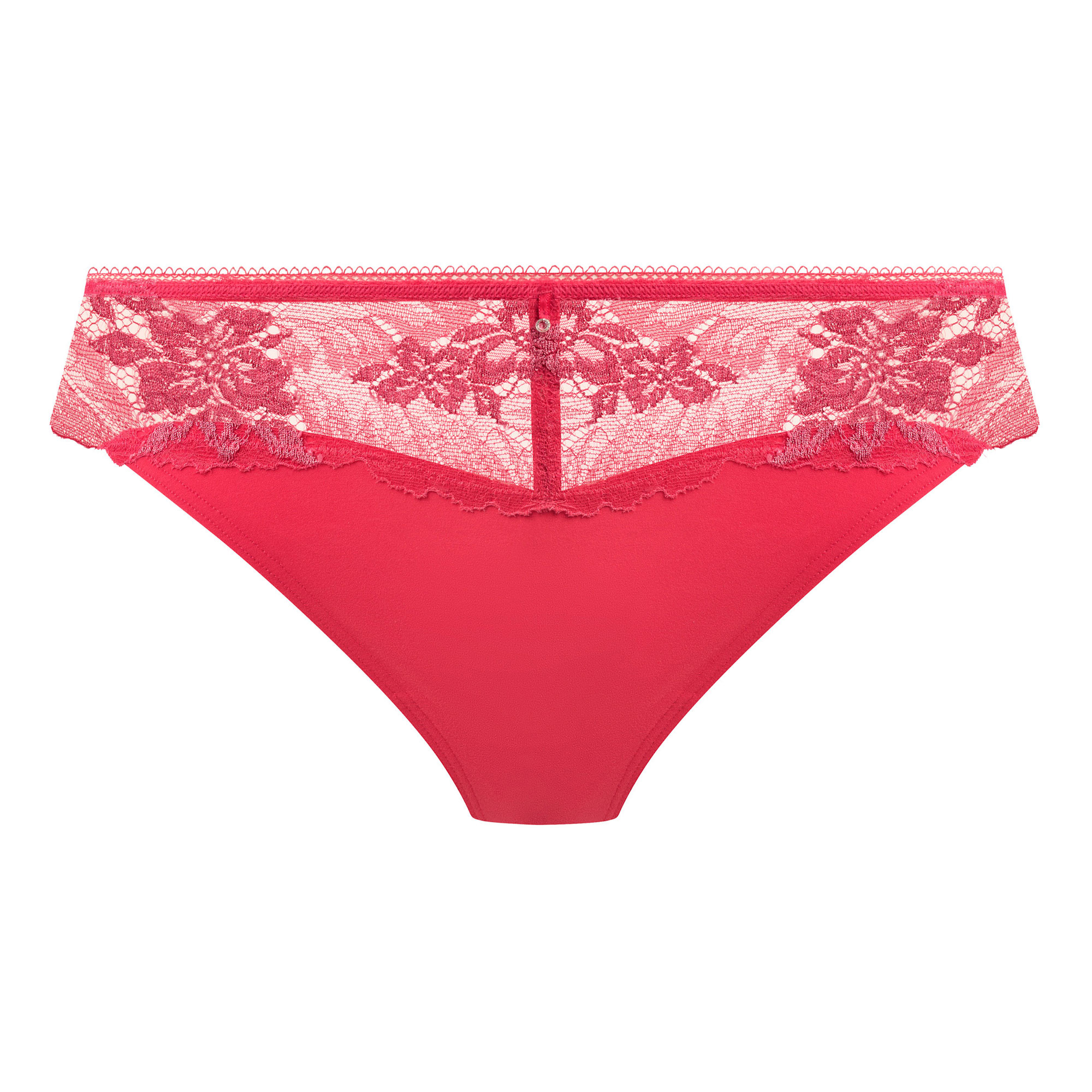 - Low-rise waist, minimal back coverage, stretch lace front insert panels with flower detailing, soft stretch microfibre lower front, all-stretch lace back with scalloped leg edge, narrow mesh waist elastic, concealed front leg elastic, diamanté charm at centre front waist