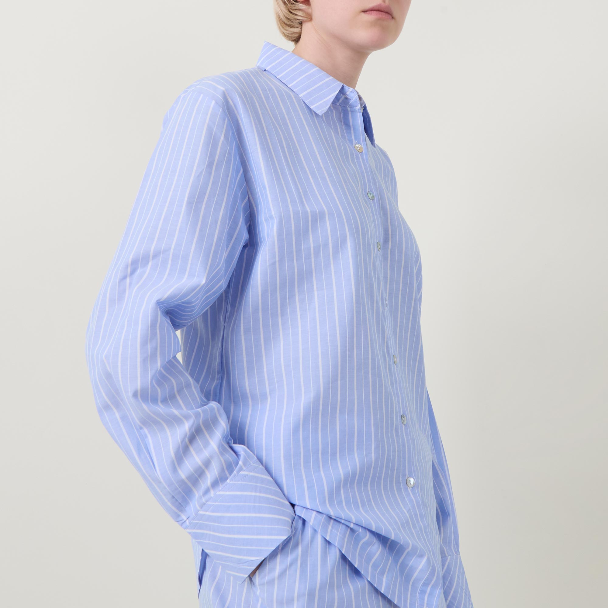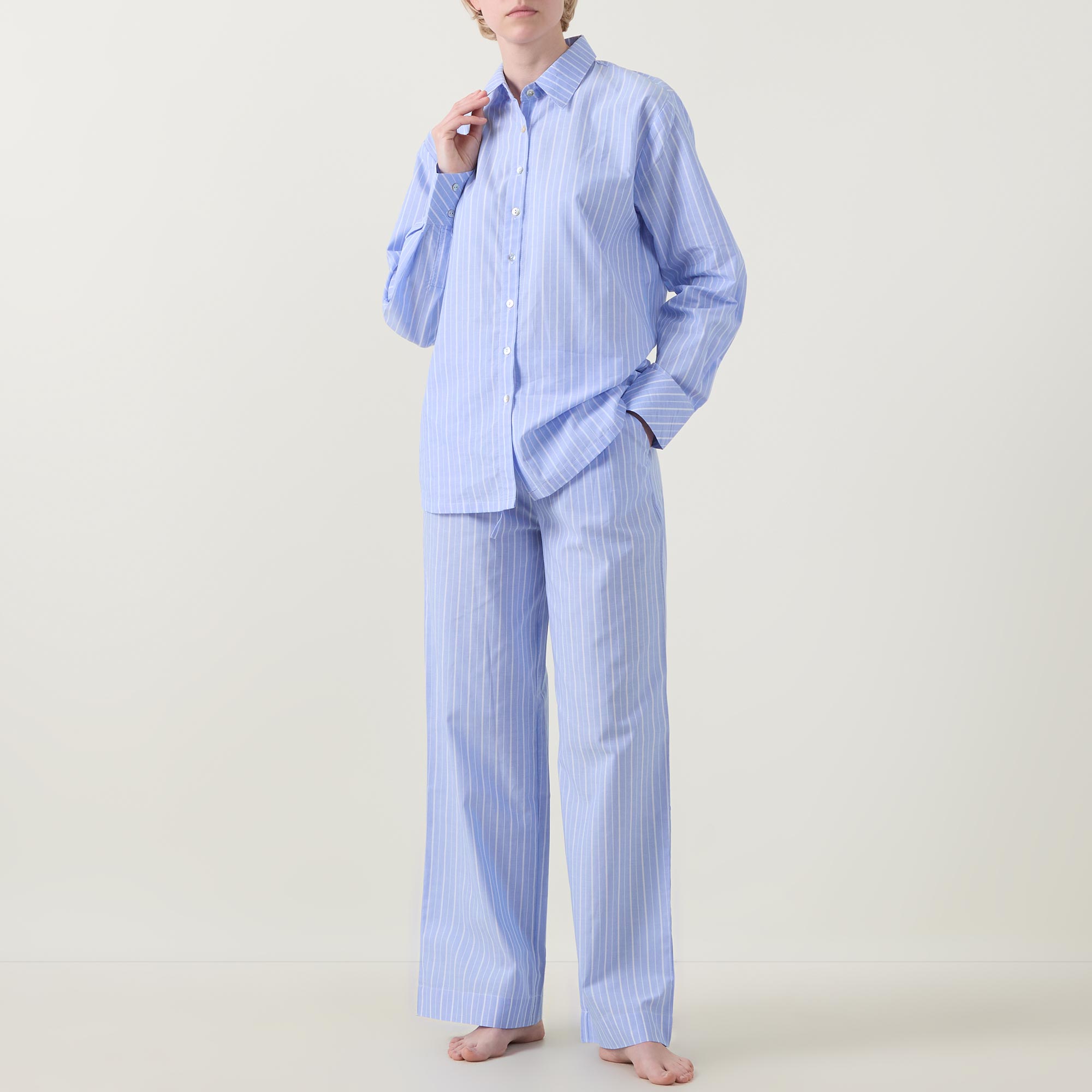 - Two-piece set: Top: Shirt collar, dropped shoulders, long sleeves, buttoned cuffs, front button placket, curved hem, chalk stripe pattern; Bottoms: Mid-rise, straight-leg, elasticated waistband, adjustable drawstring fastening, two side in seam pockets, clean hems, chalk stripe pattern