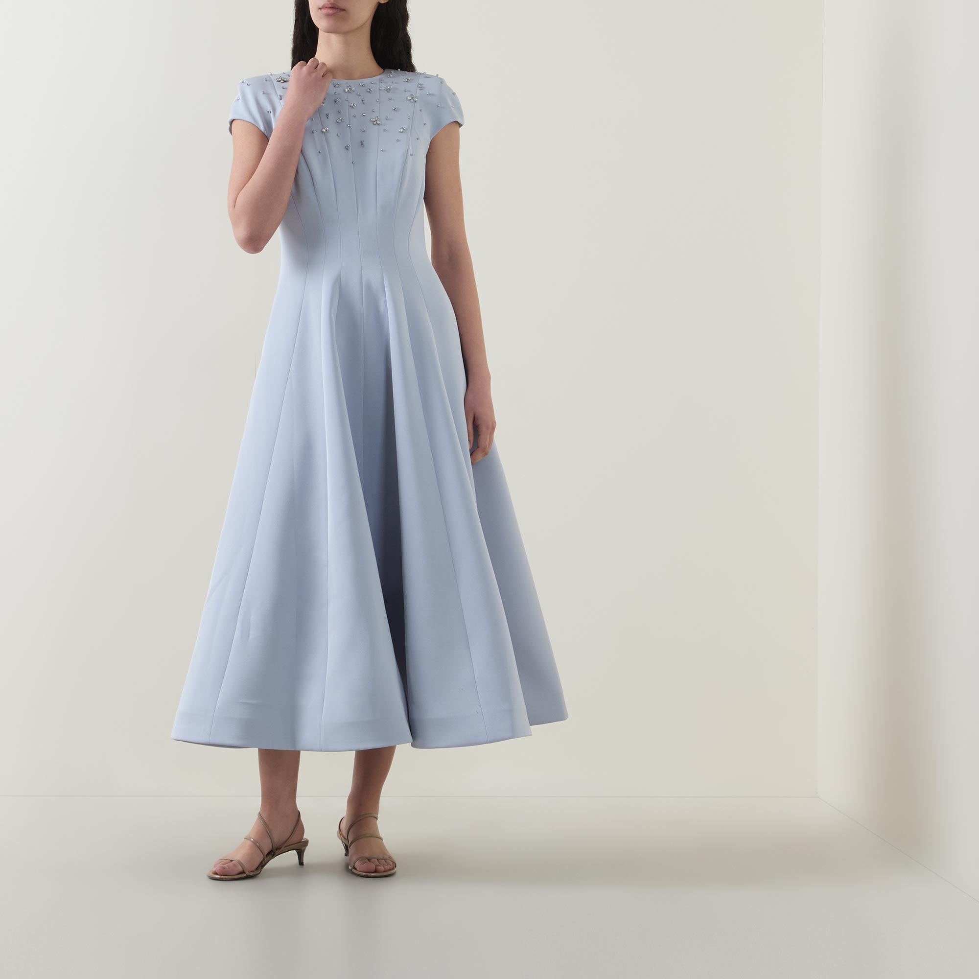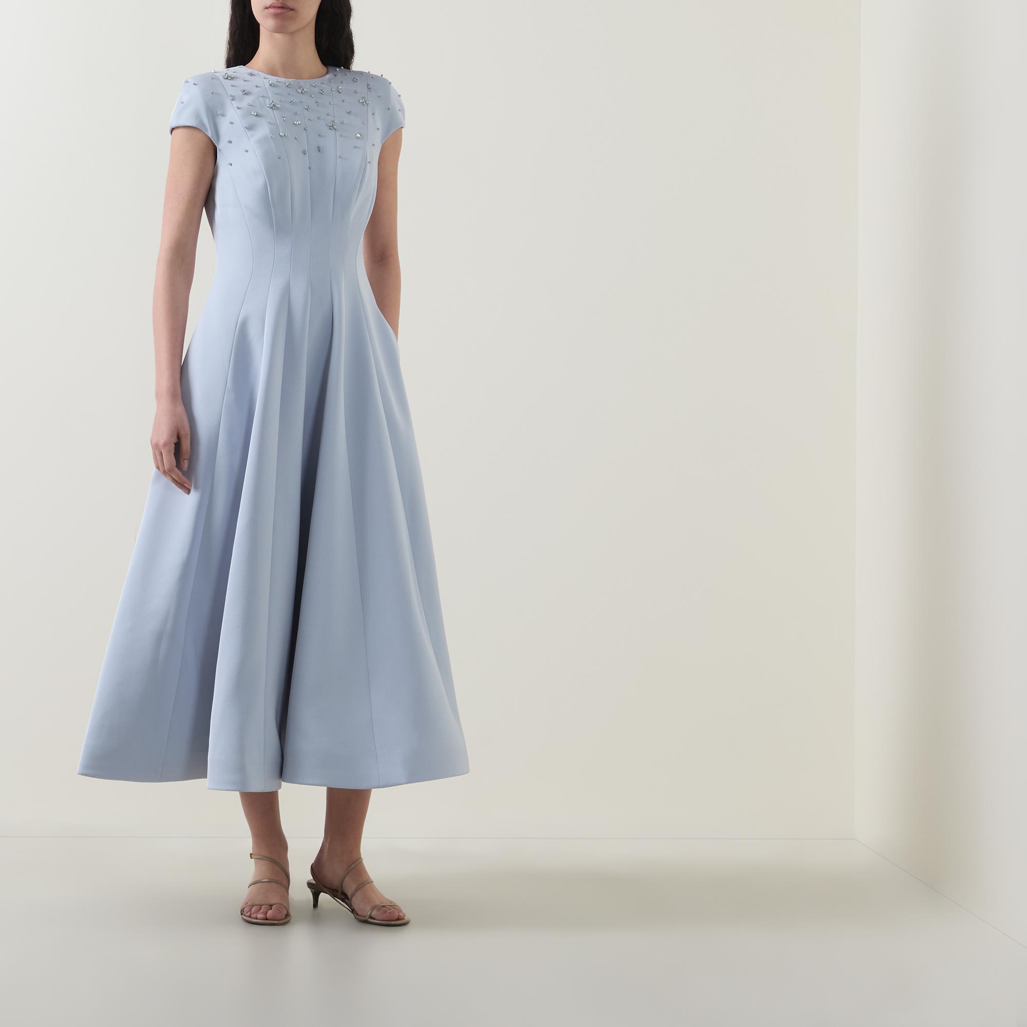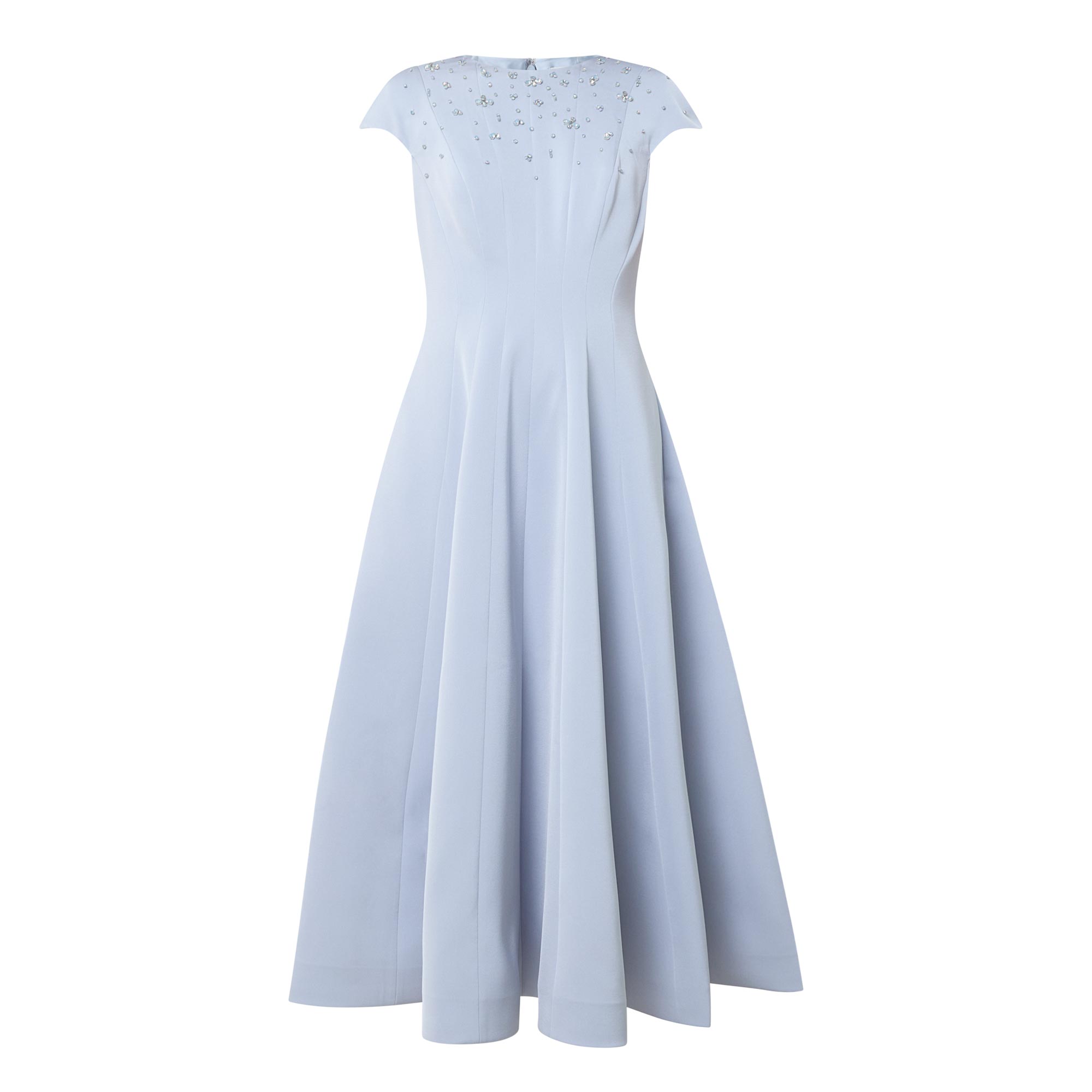 - Round neckline, short cap sleeves, rear zip fastening, dart detailing, fitted through the waist, flared skirt, straight hem, embellished bodice, midi length