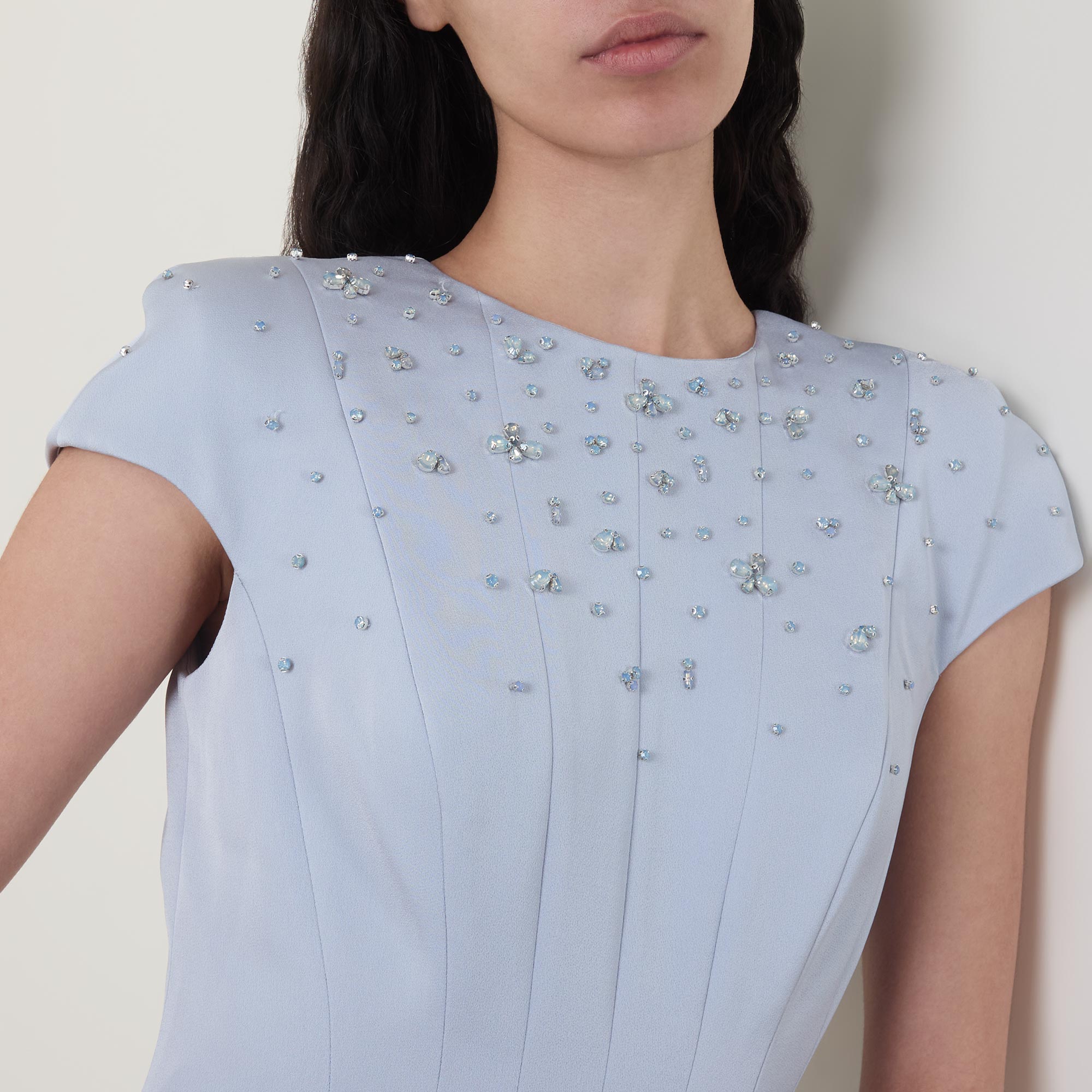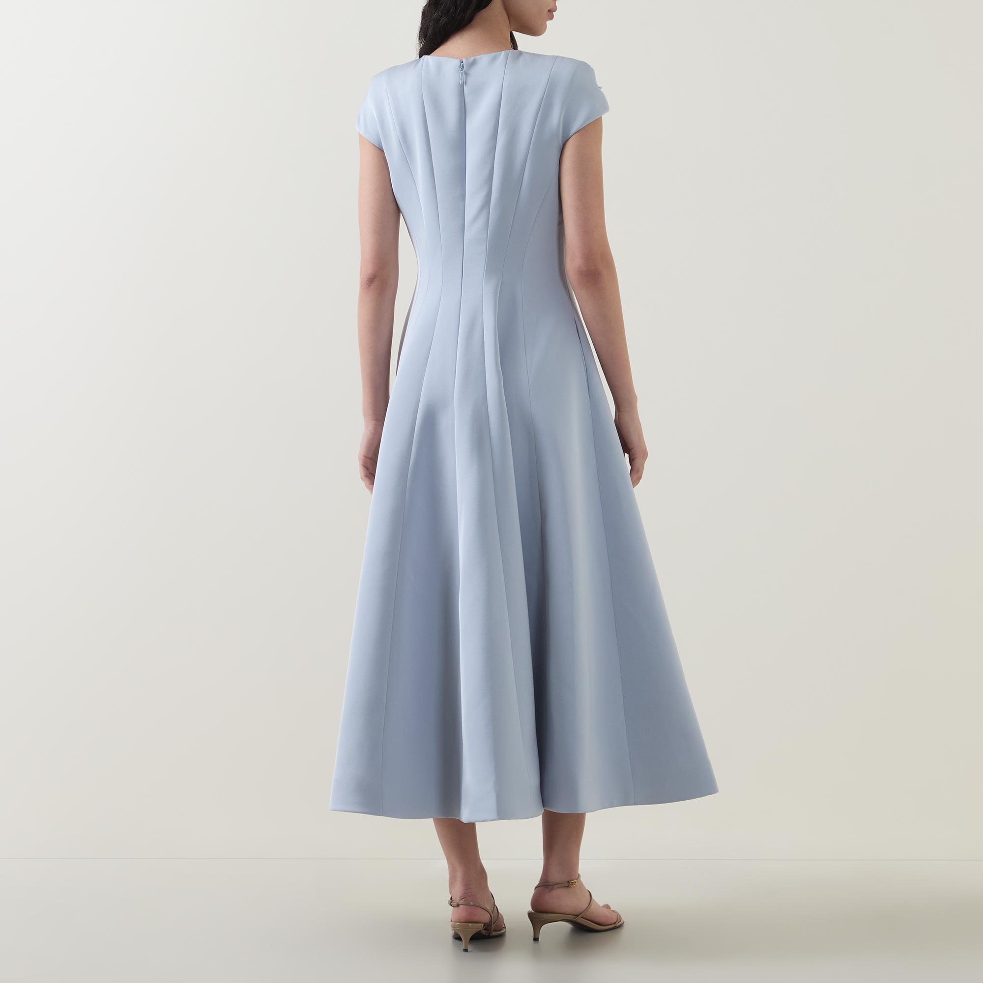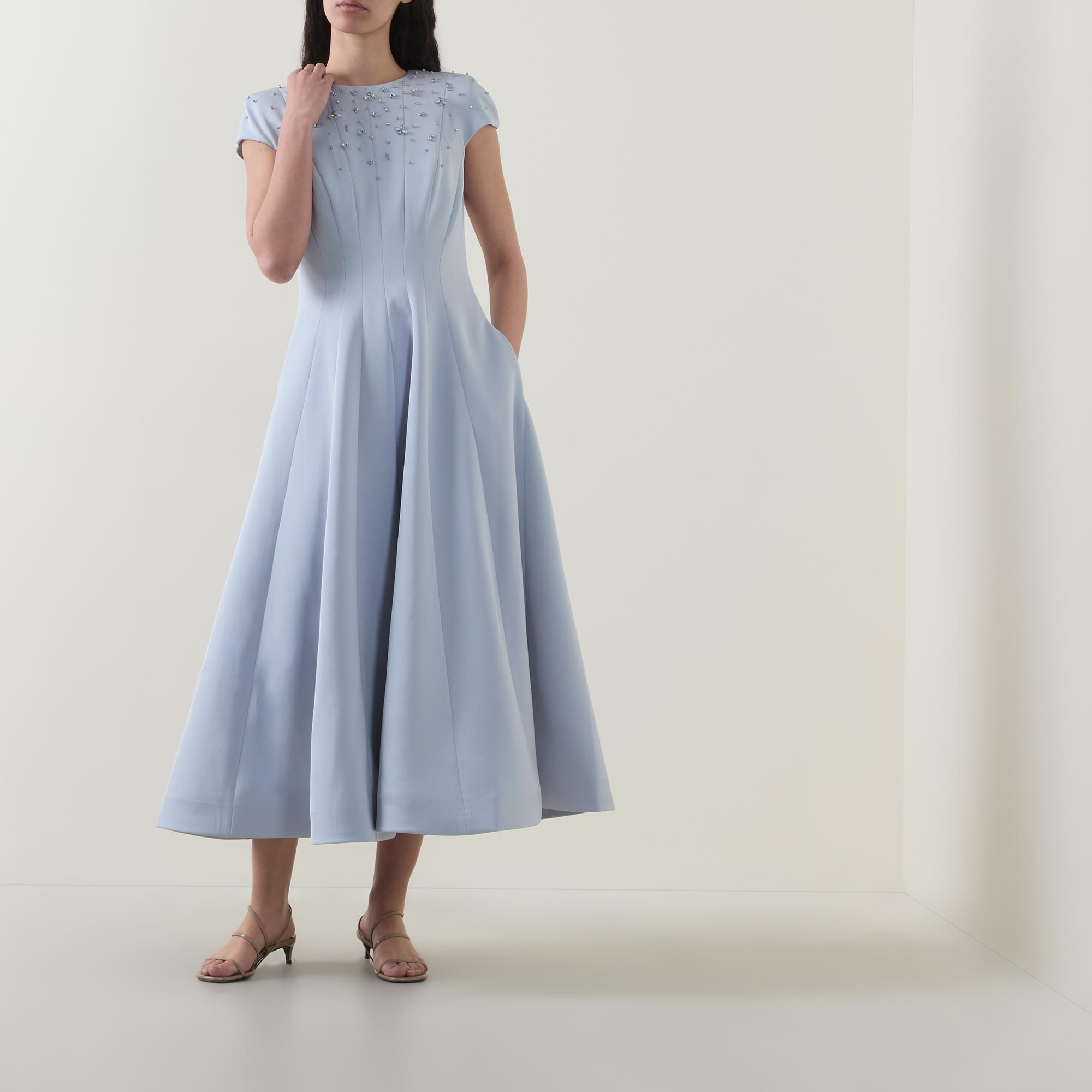 - Round neckline, short cap sleeves, rear zip fastening, dart detailing, fitted through the waist, flared skirt, straight hem, embellished bodice, midi length