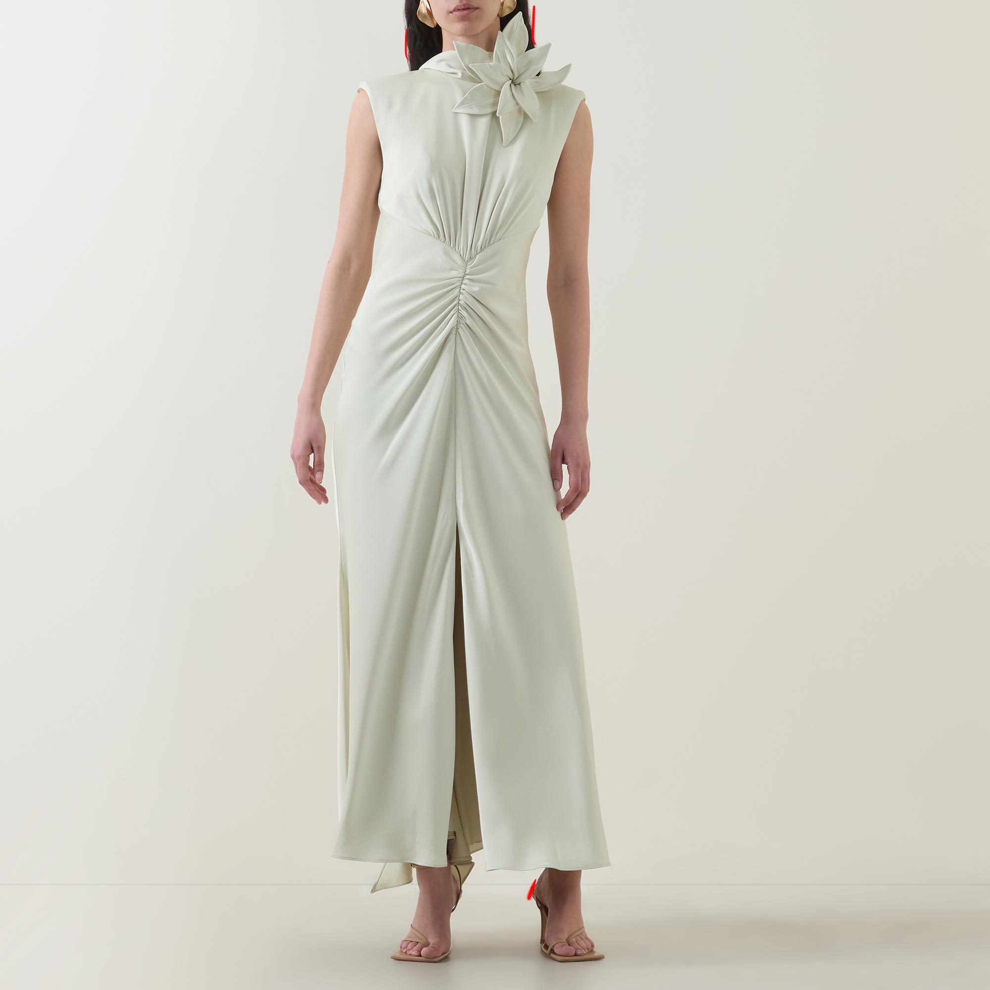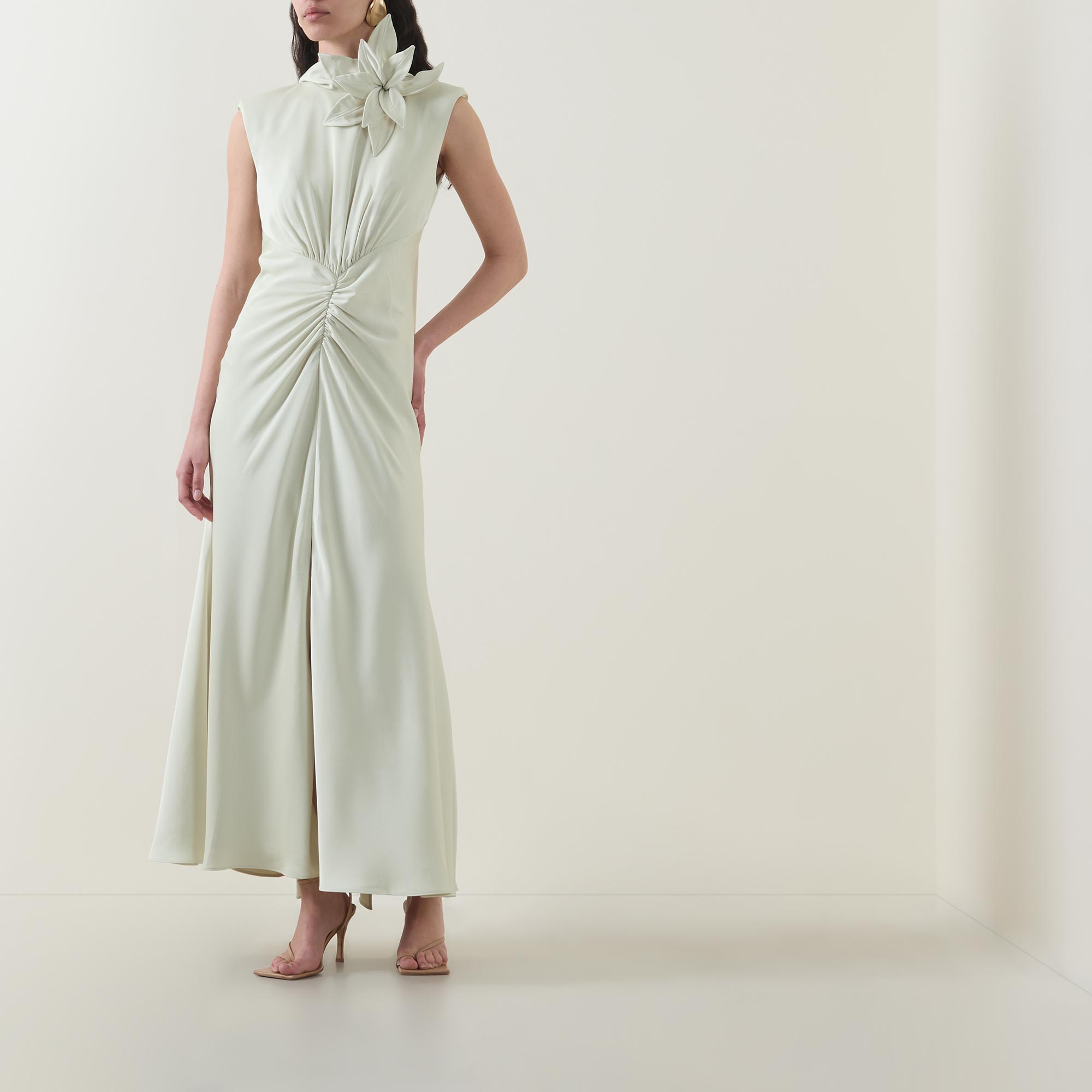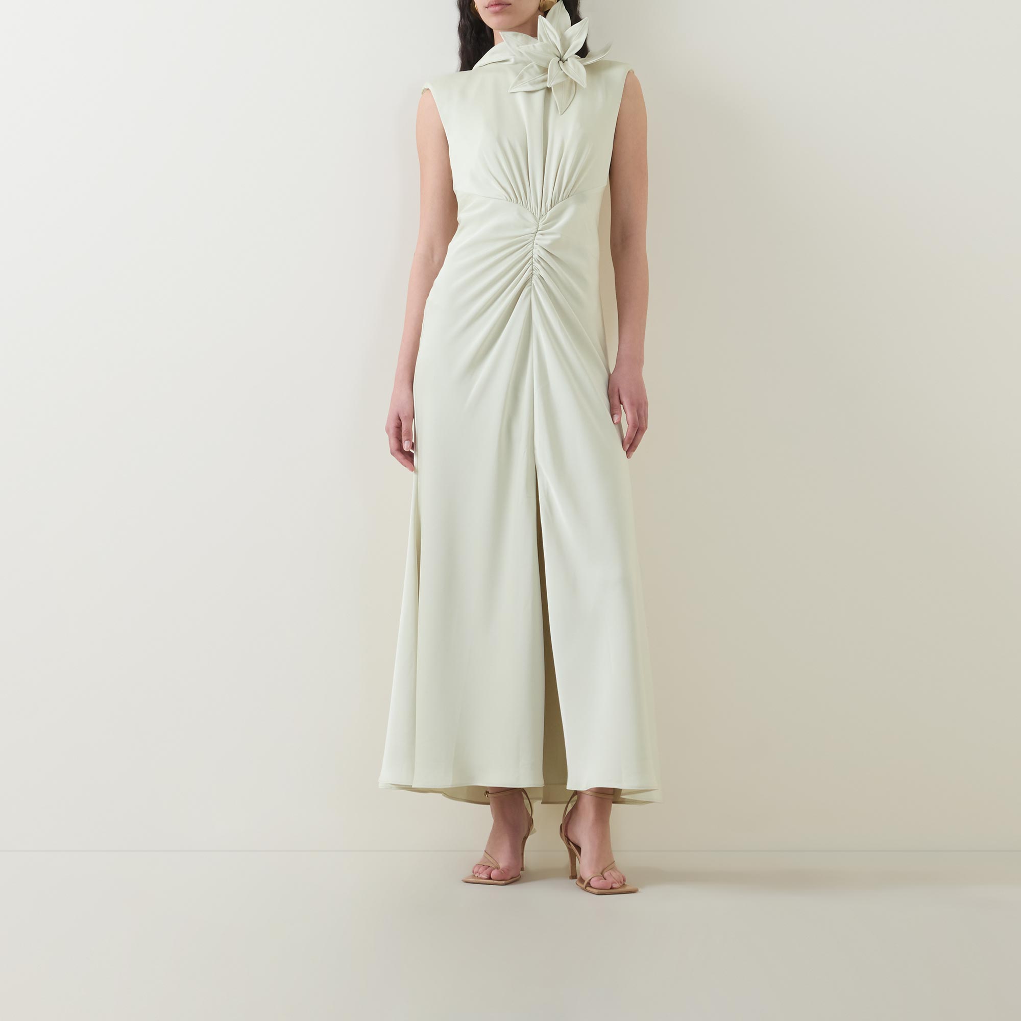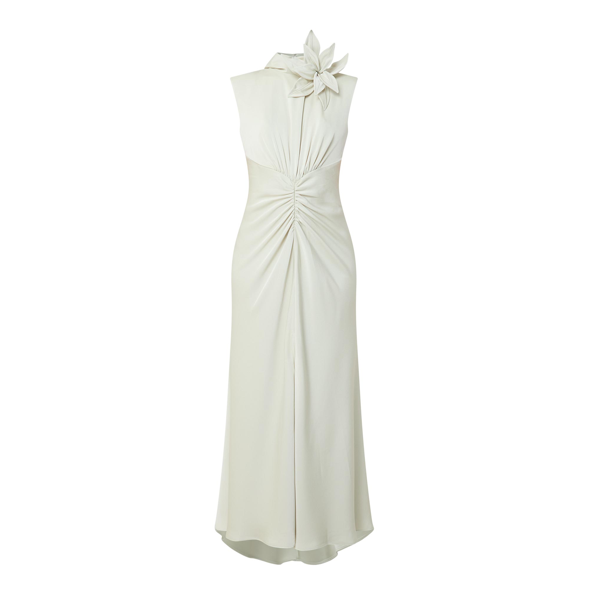 - High neckline, rear asymmetric tie fastening, floral appliqué detailing, sleeveless design, gathered front, rear zip fastening, straight hem, front split, maxi length