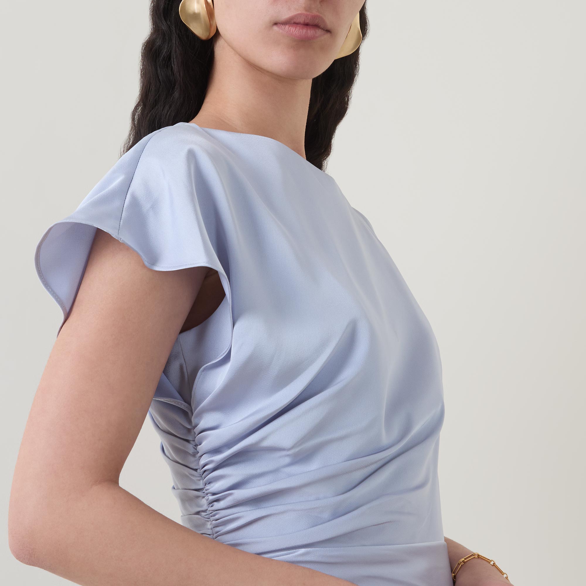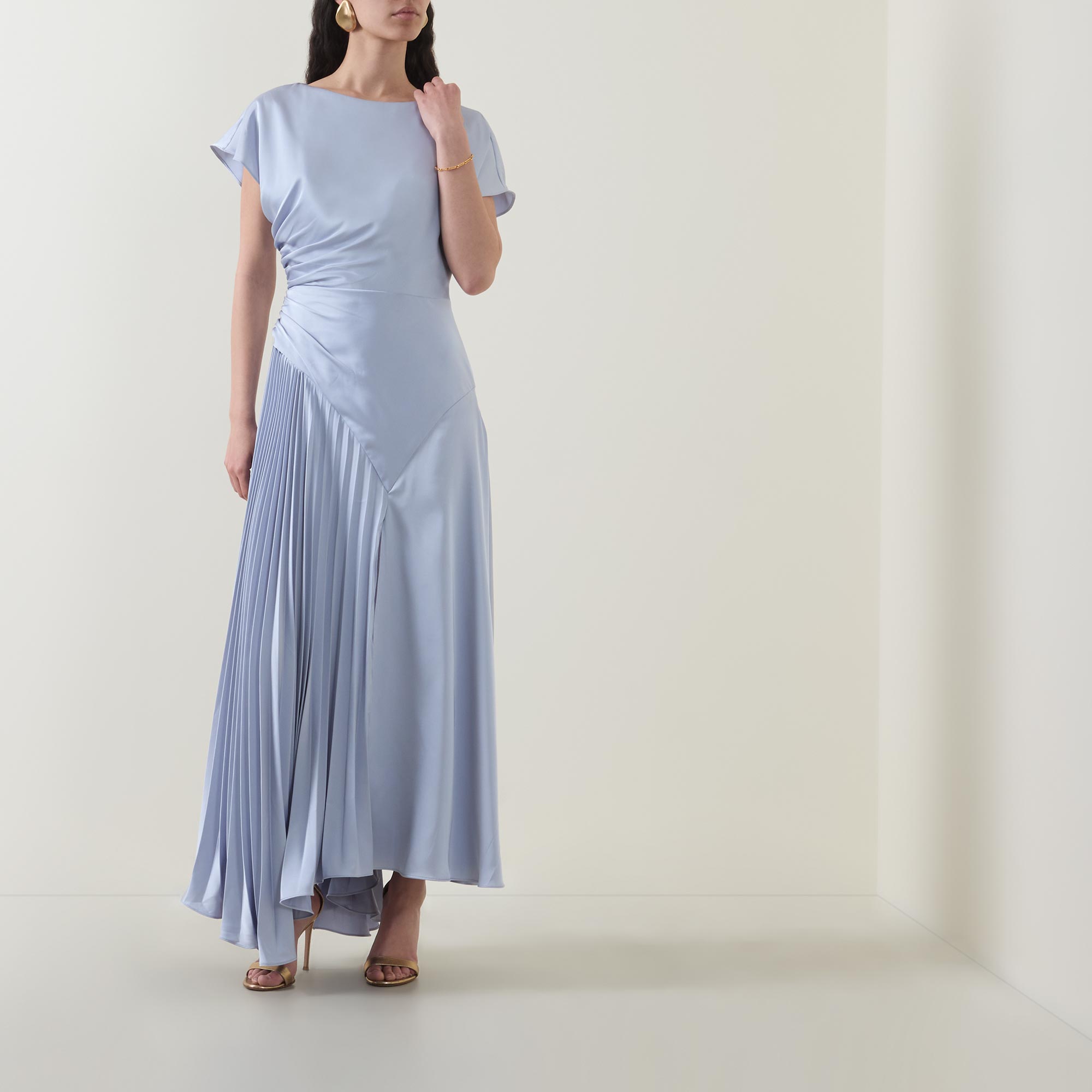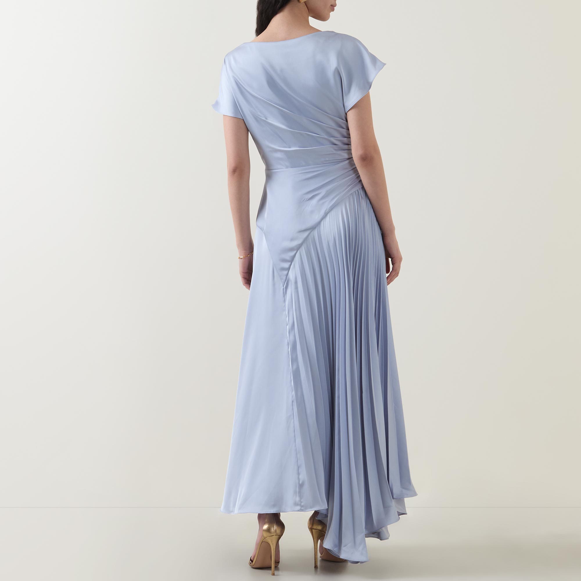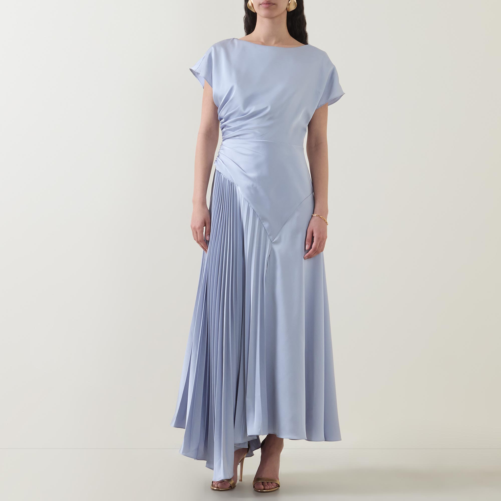 - Boat neckline, cap sleeves, gathered side, dropped waistline, pleated skirt, flared design, asymmetric hem, satin finish, midi length