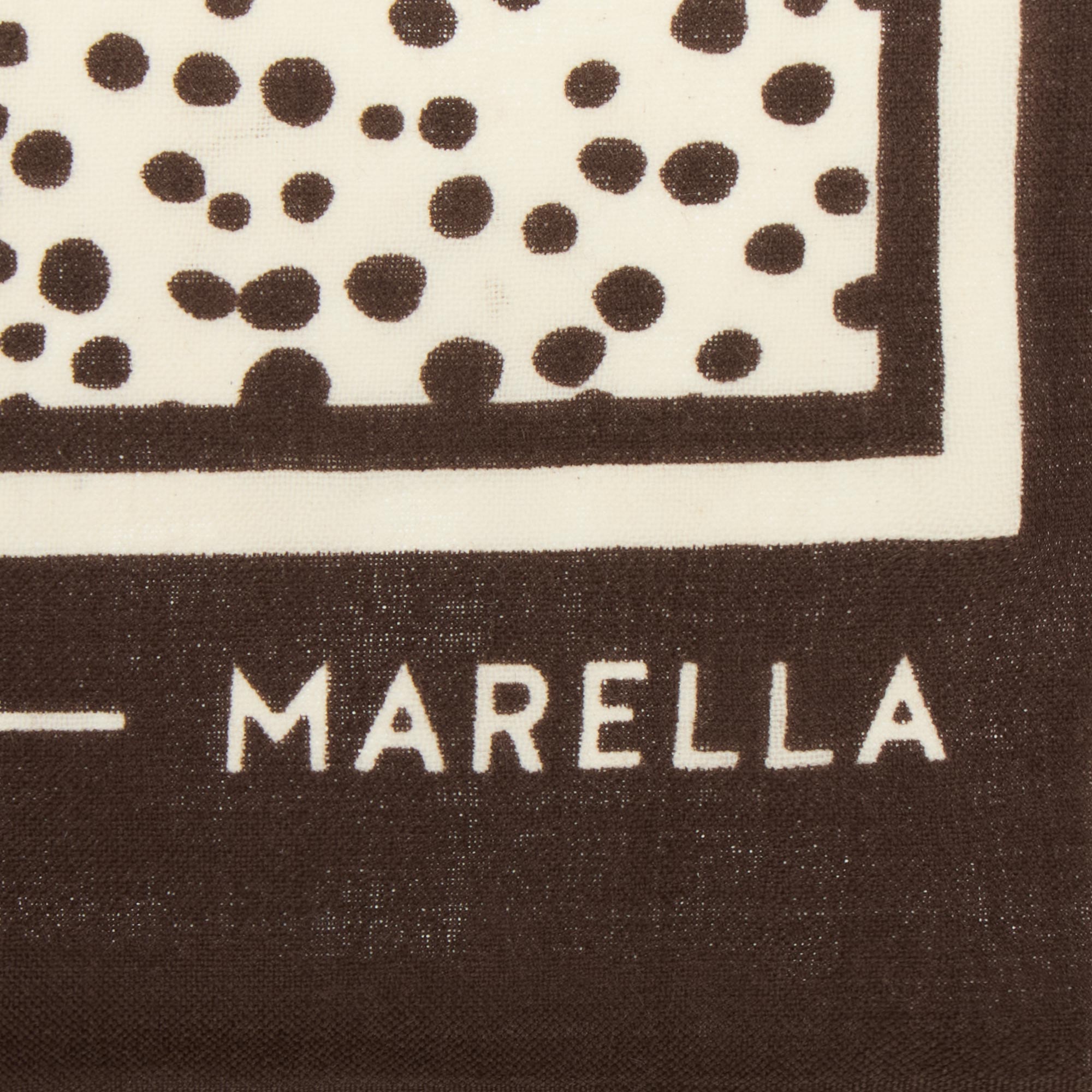 - Square-shaped design, frayed edges, solid border, abstract print, logo detail, woven finish