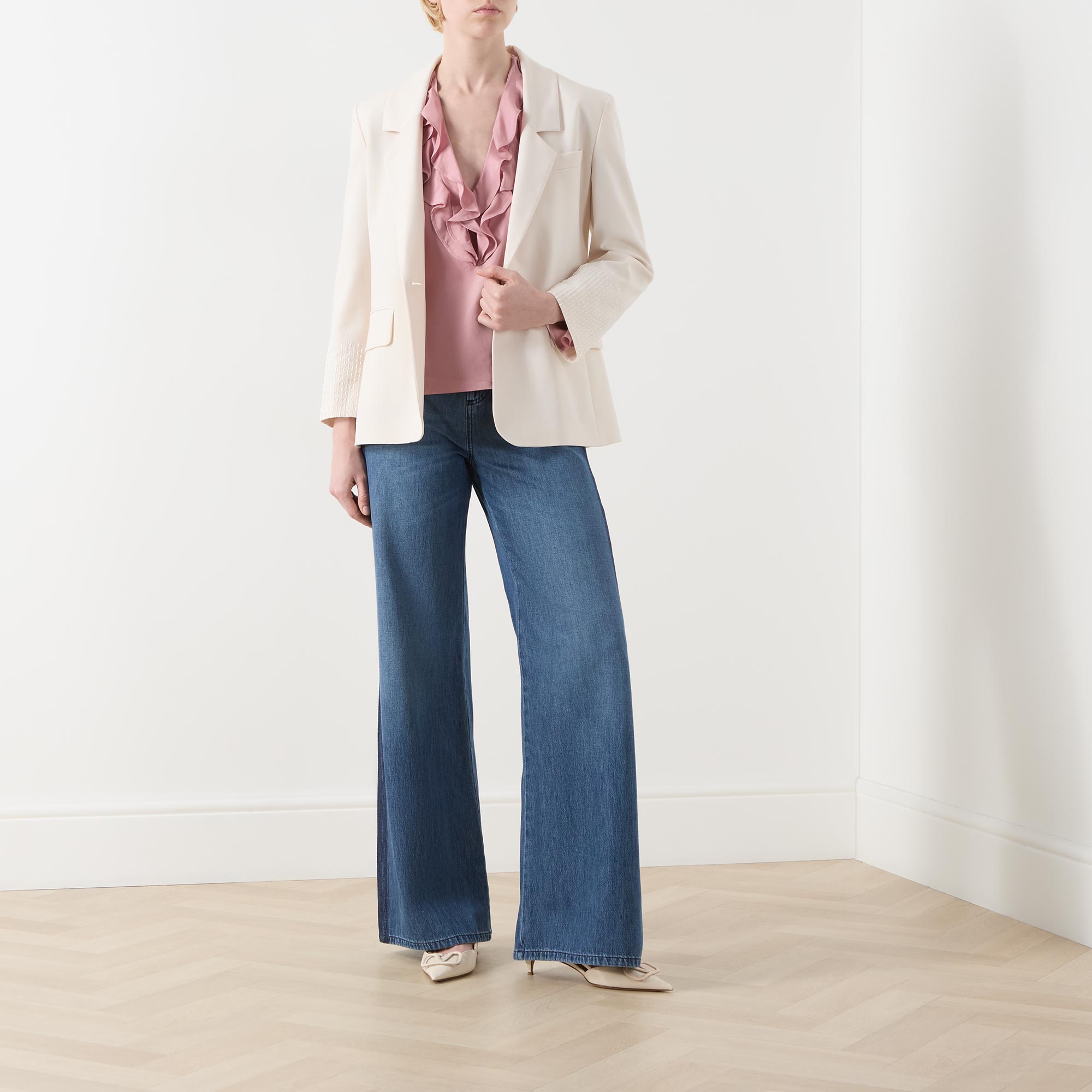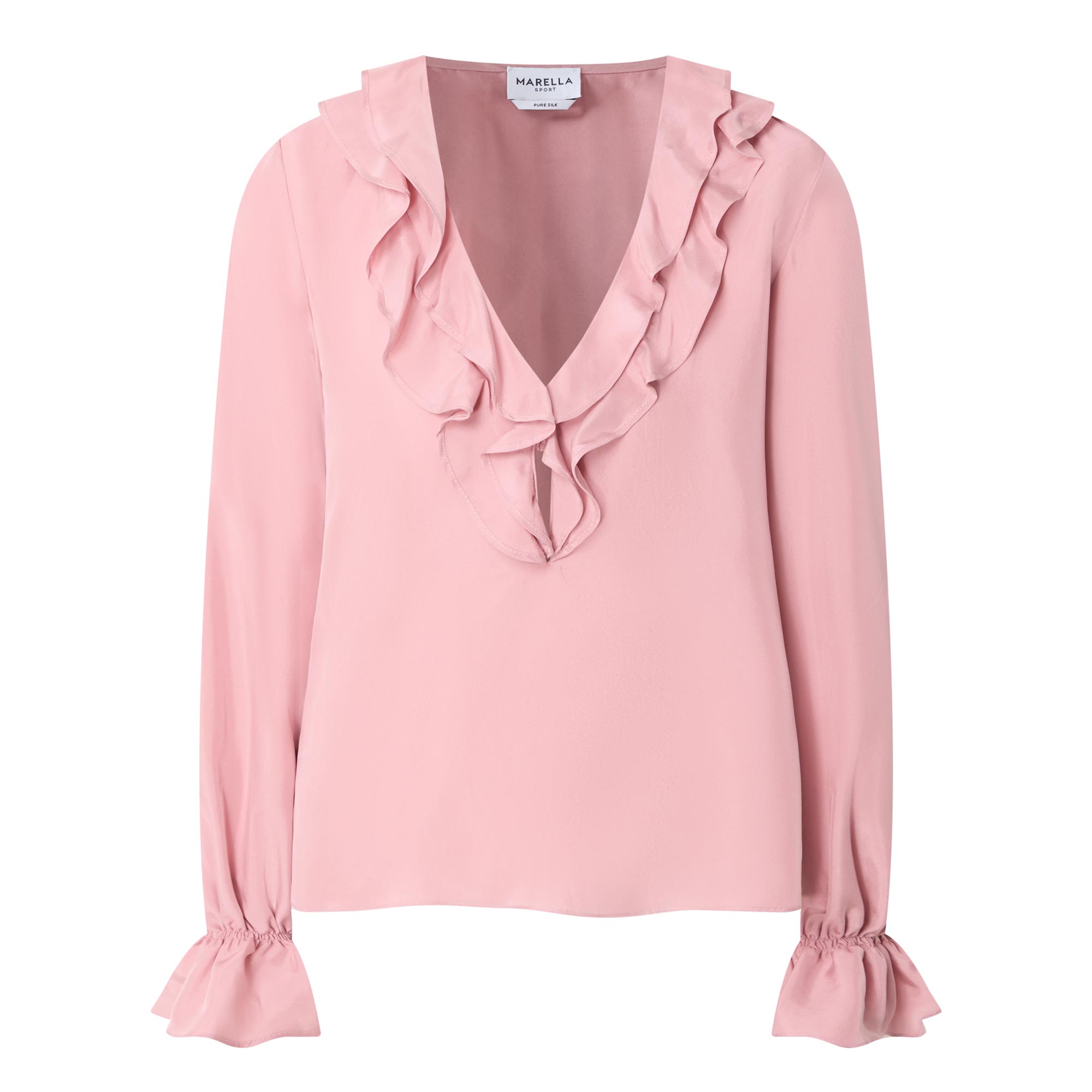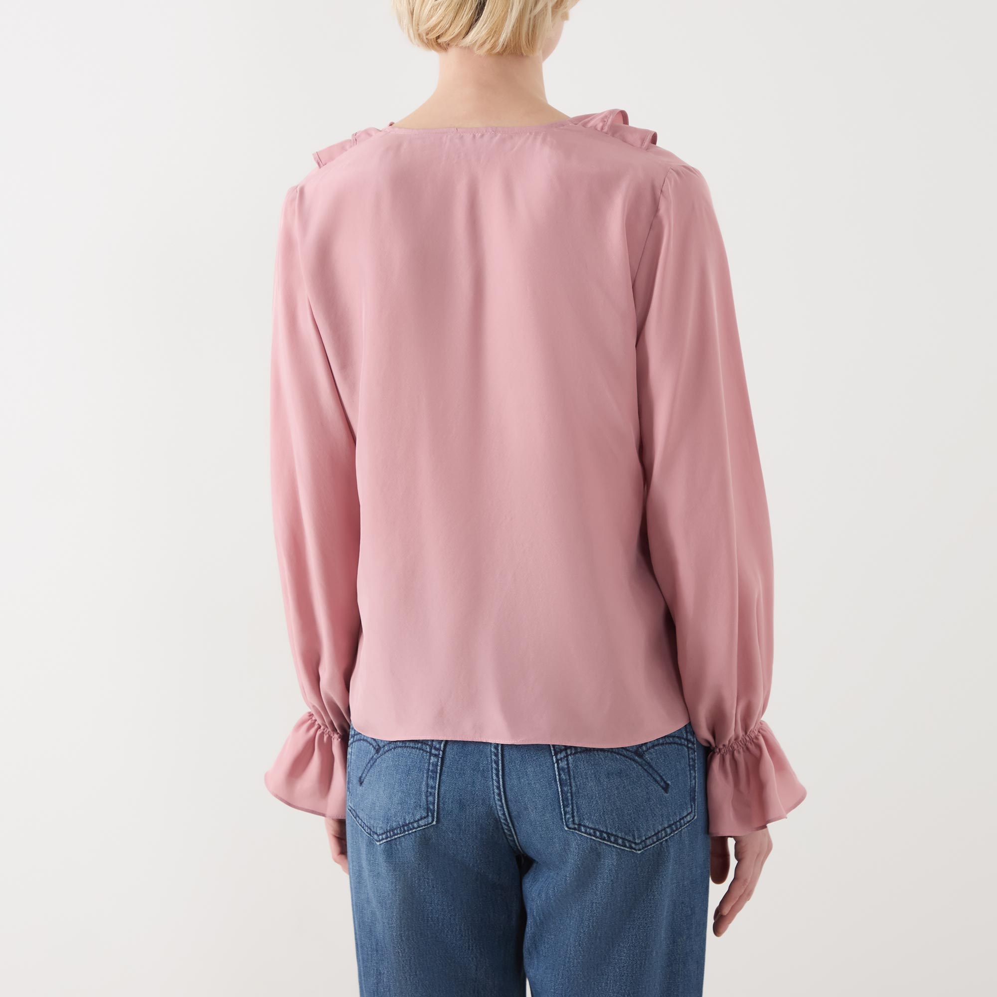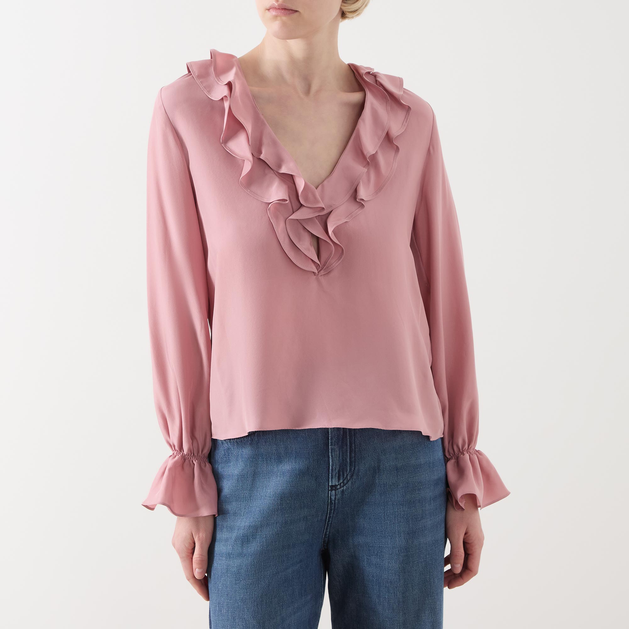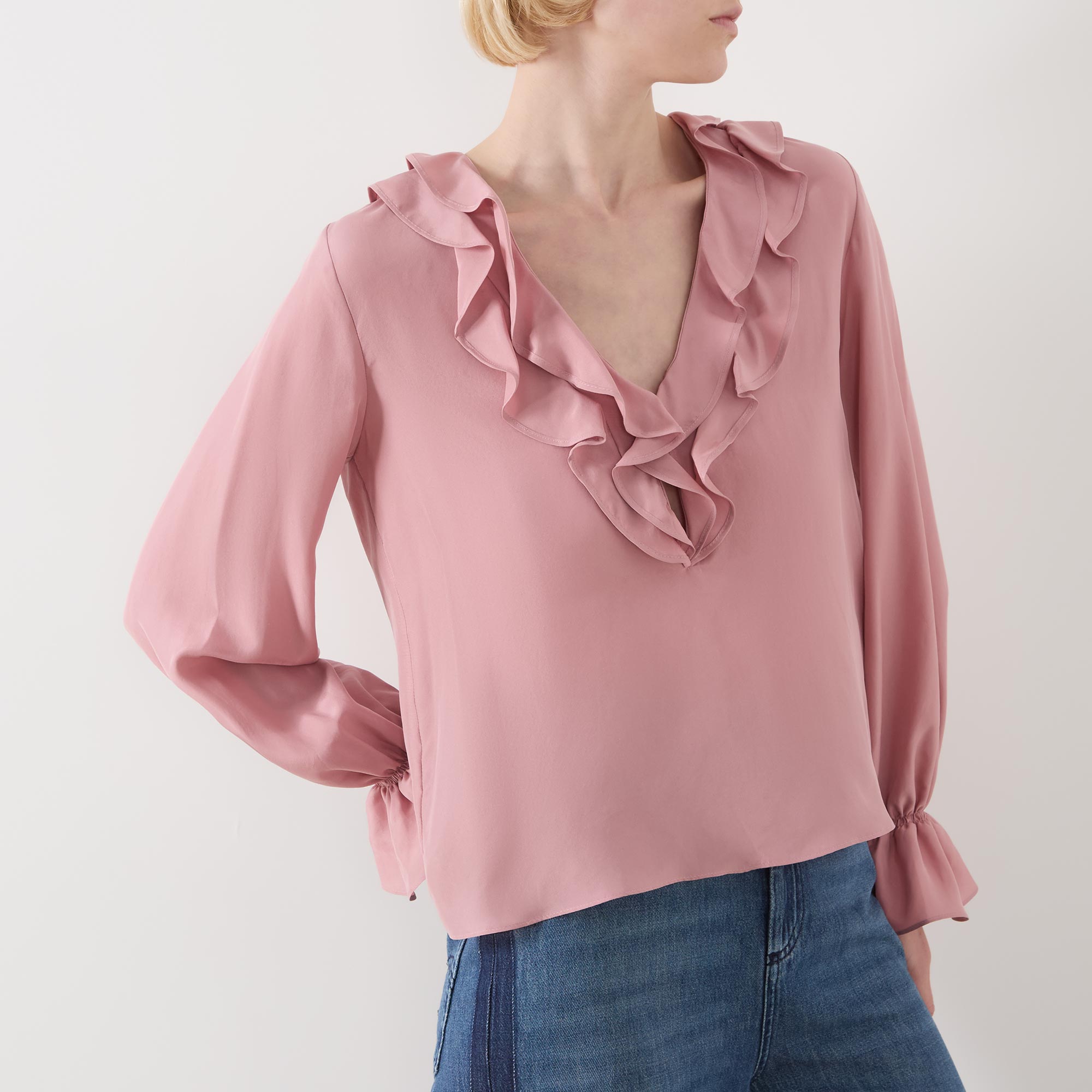 • V-neckline, layered ruffle design, long sleeves, elasticated flared cuffs, curved hem, smooth finish