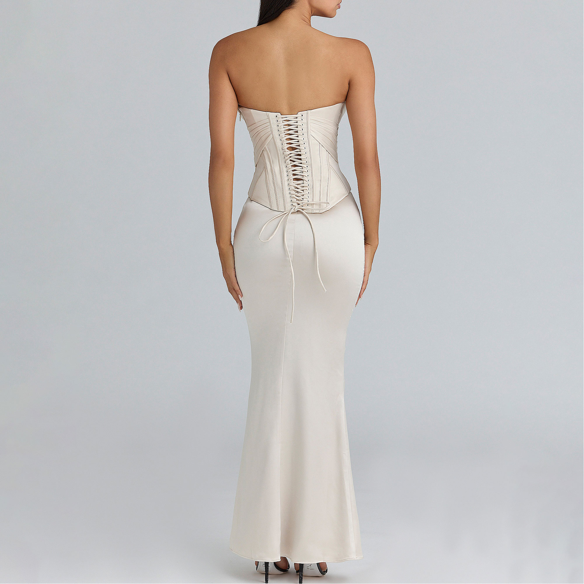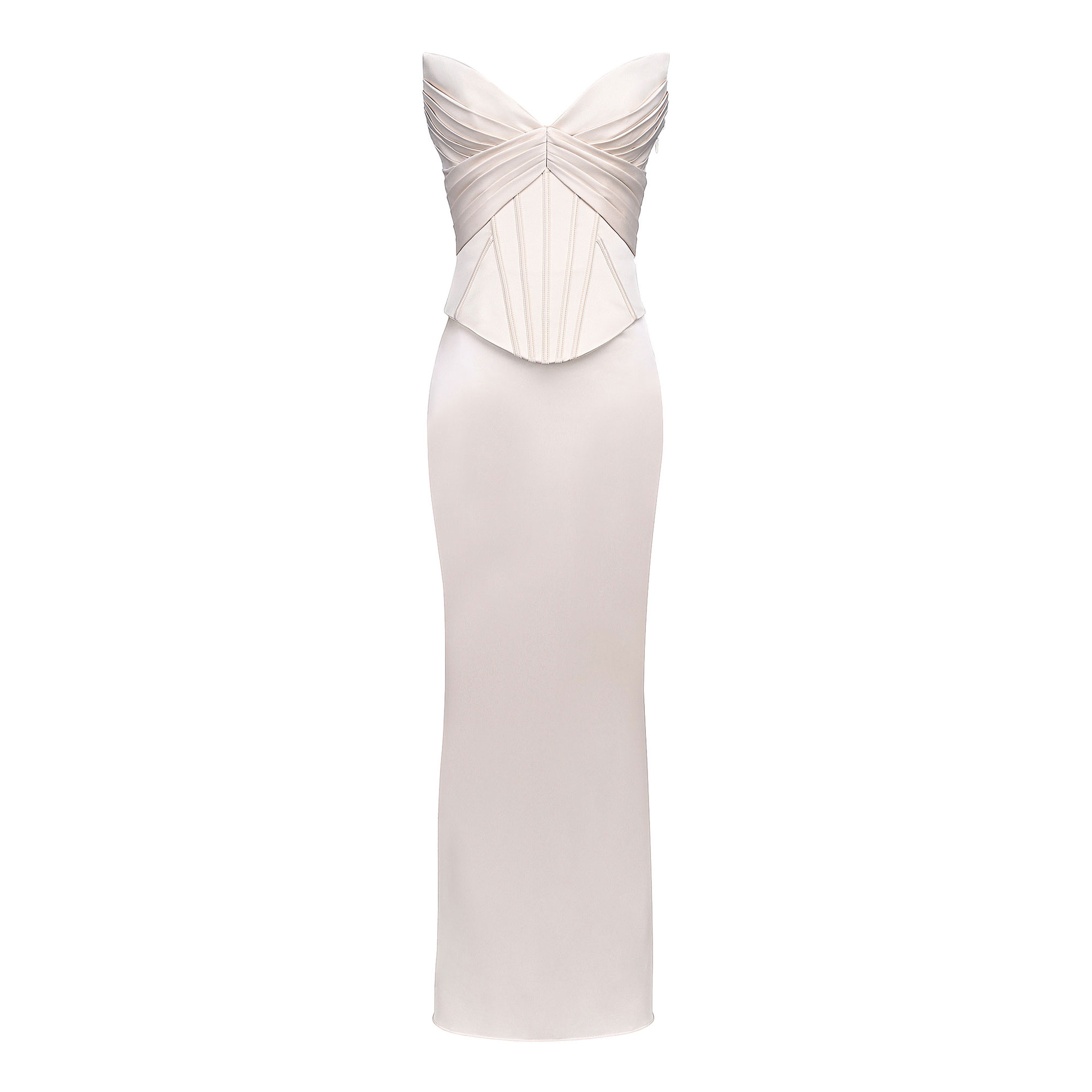 - Cut from duchess satin, structured bodice with boning and lace-up fastening, pleats on the bust, zip on the side, floor length