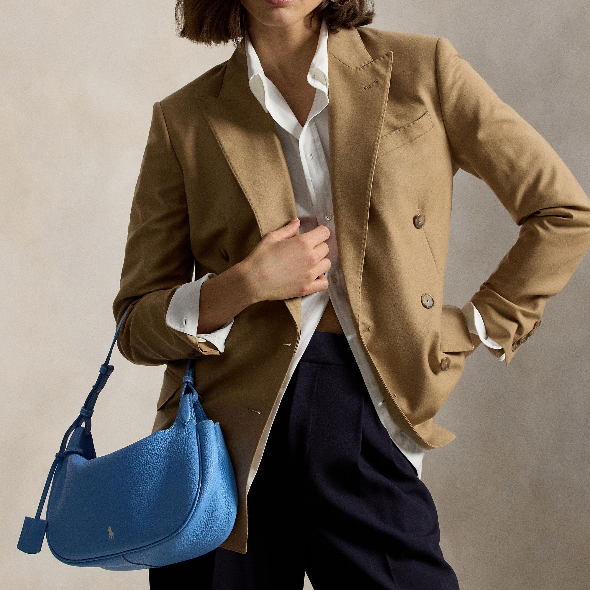 - Polo Play collection piece, Italian pebbled leather, adjustable shoulder strap with loop detail, sling profile, two-way top zip closure, topstitching, signature printed and embossed Pony logo detailing, detachable leather key cover with engraved hardware, Polo Play dust bag