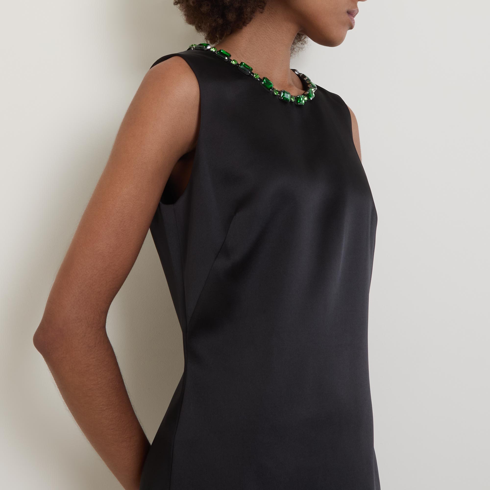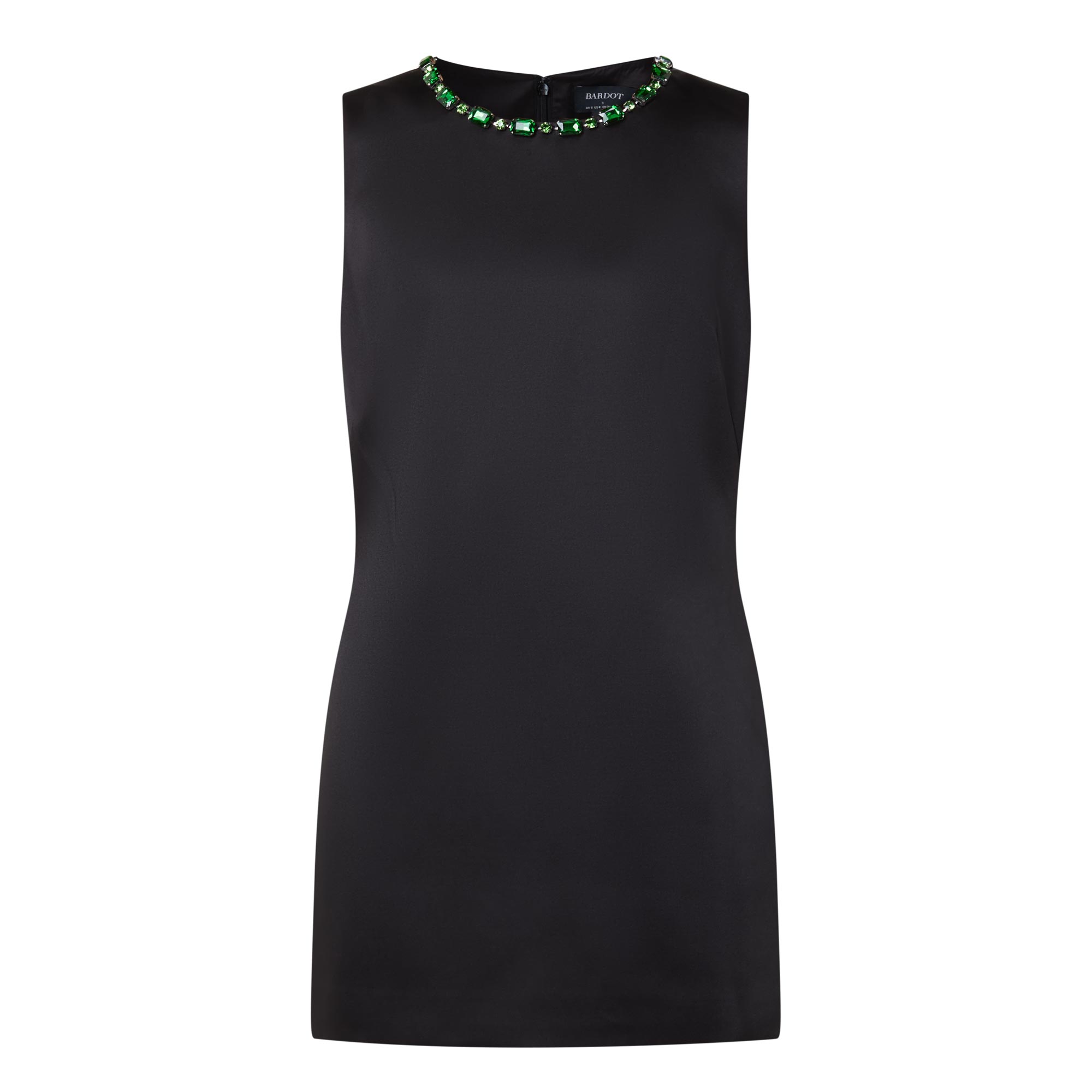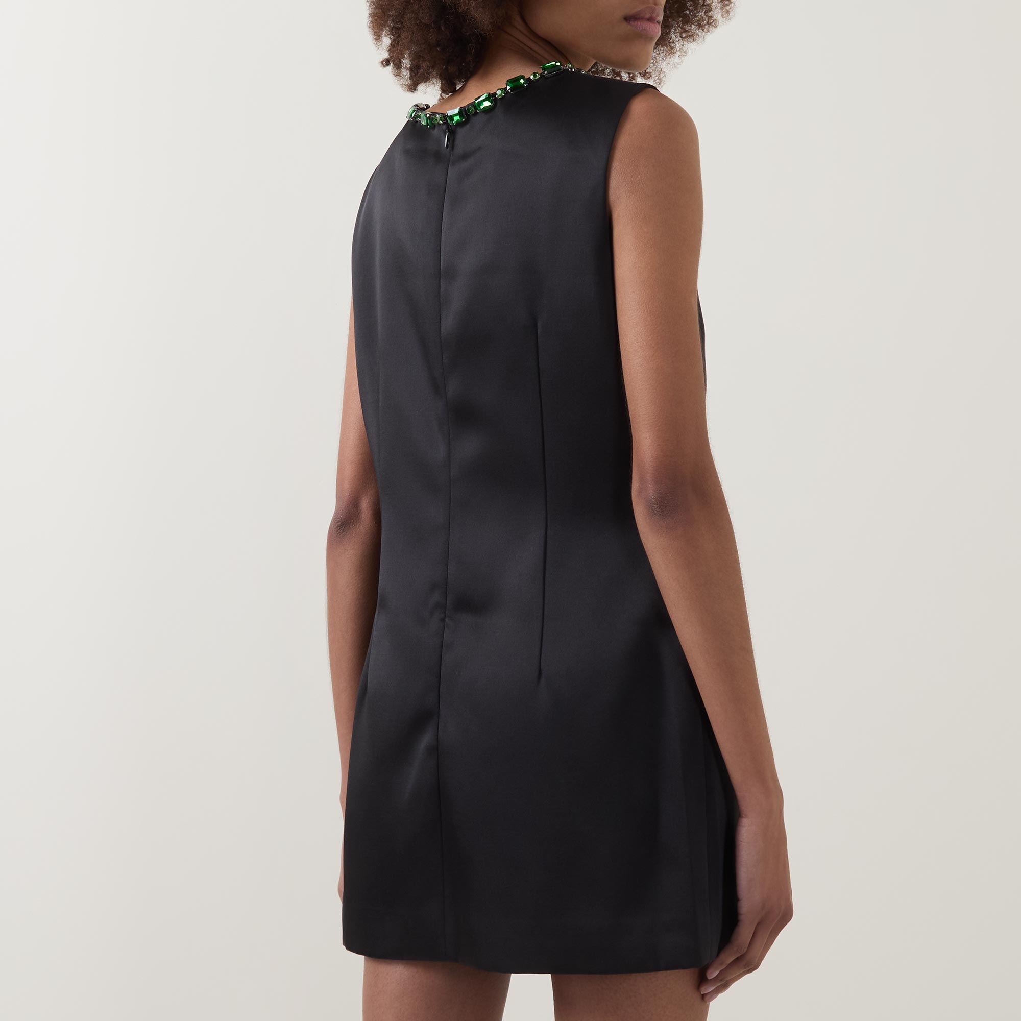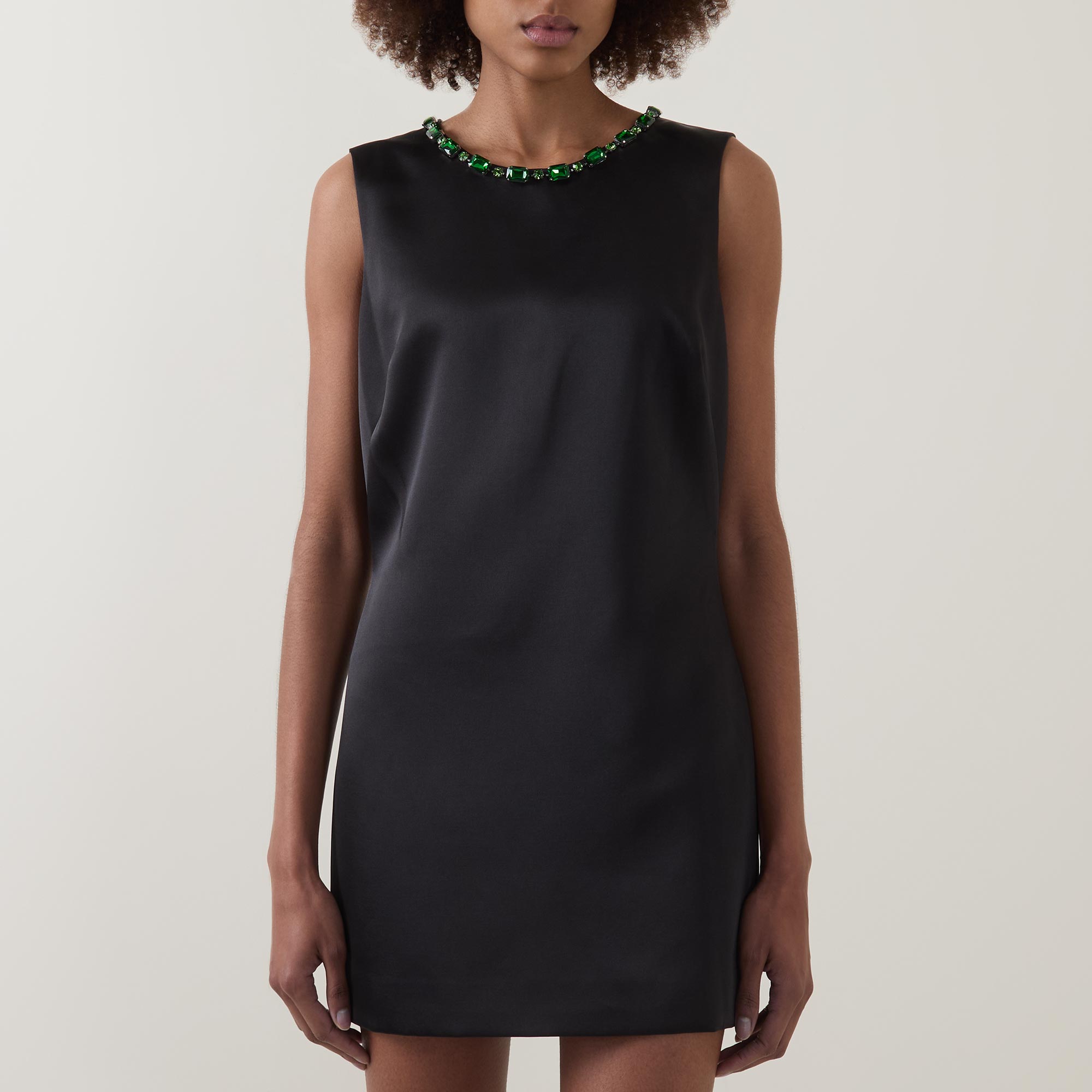 - Round neckline with diamanté embellished detailing, sleeveless design, rear zip fastening, straight hem, satin finish, mini length, lined