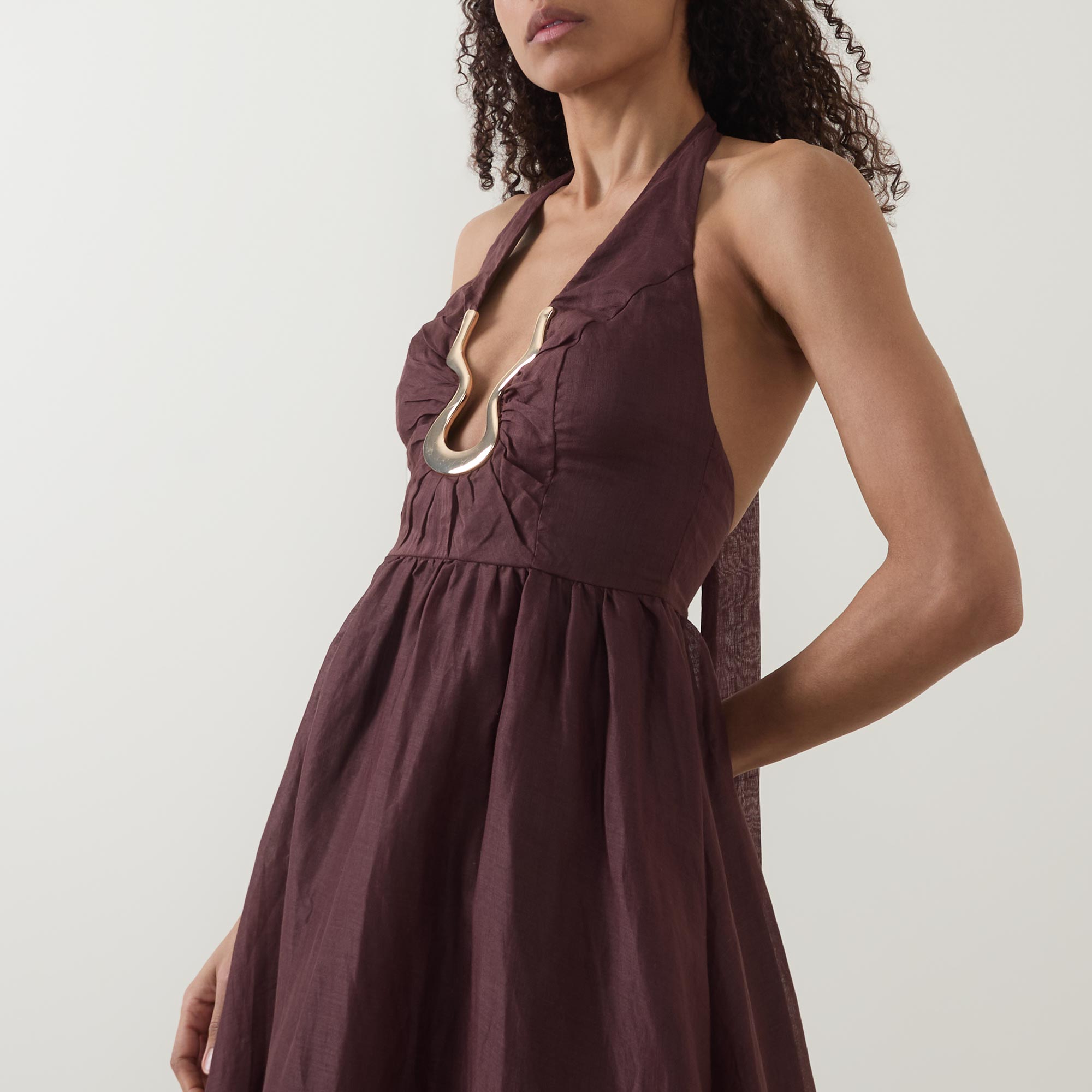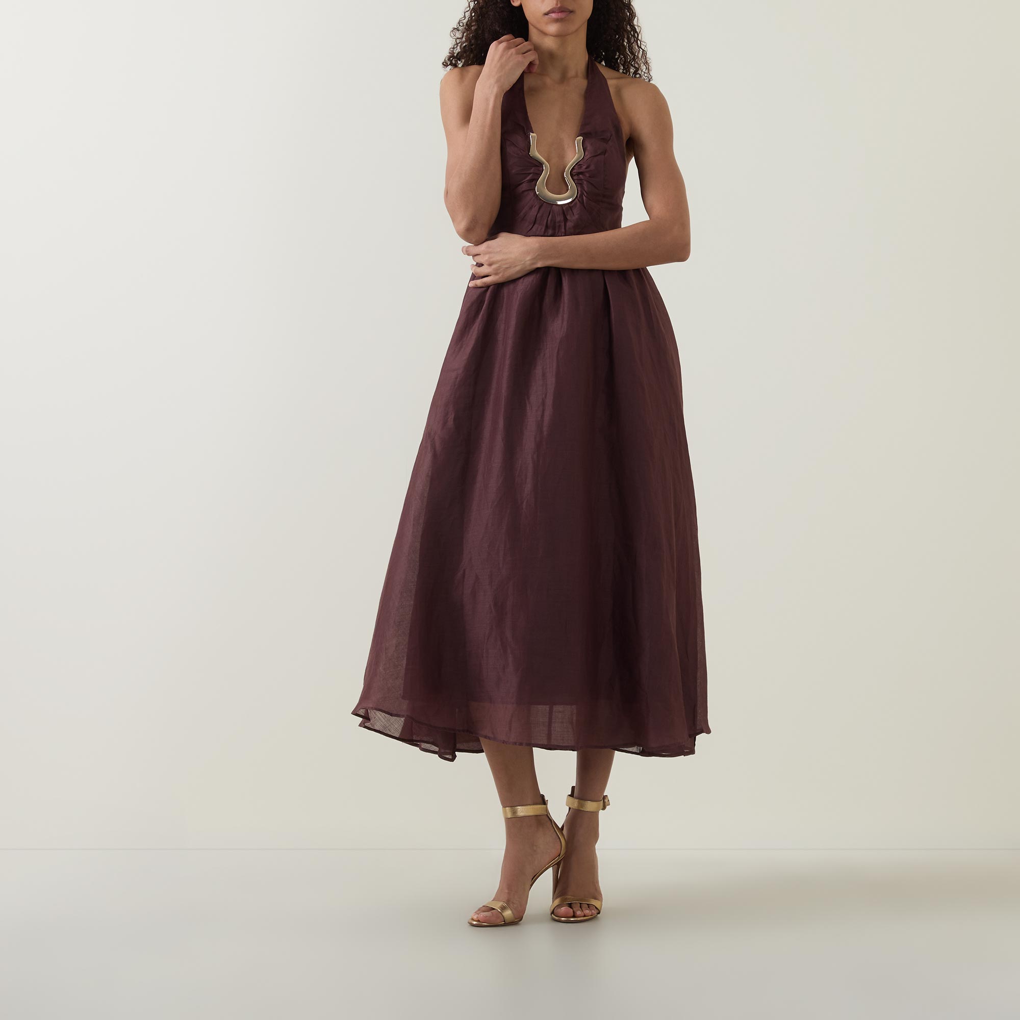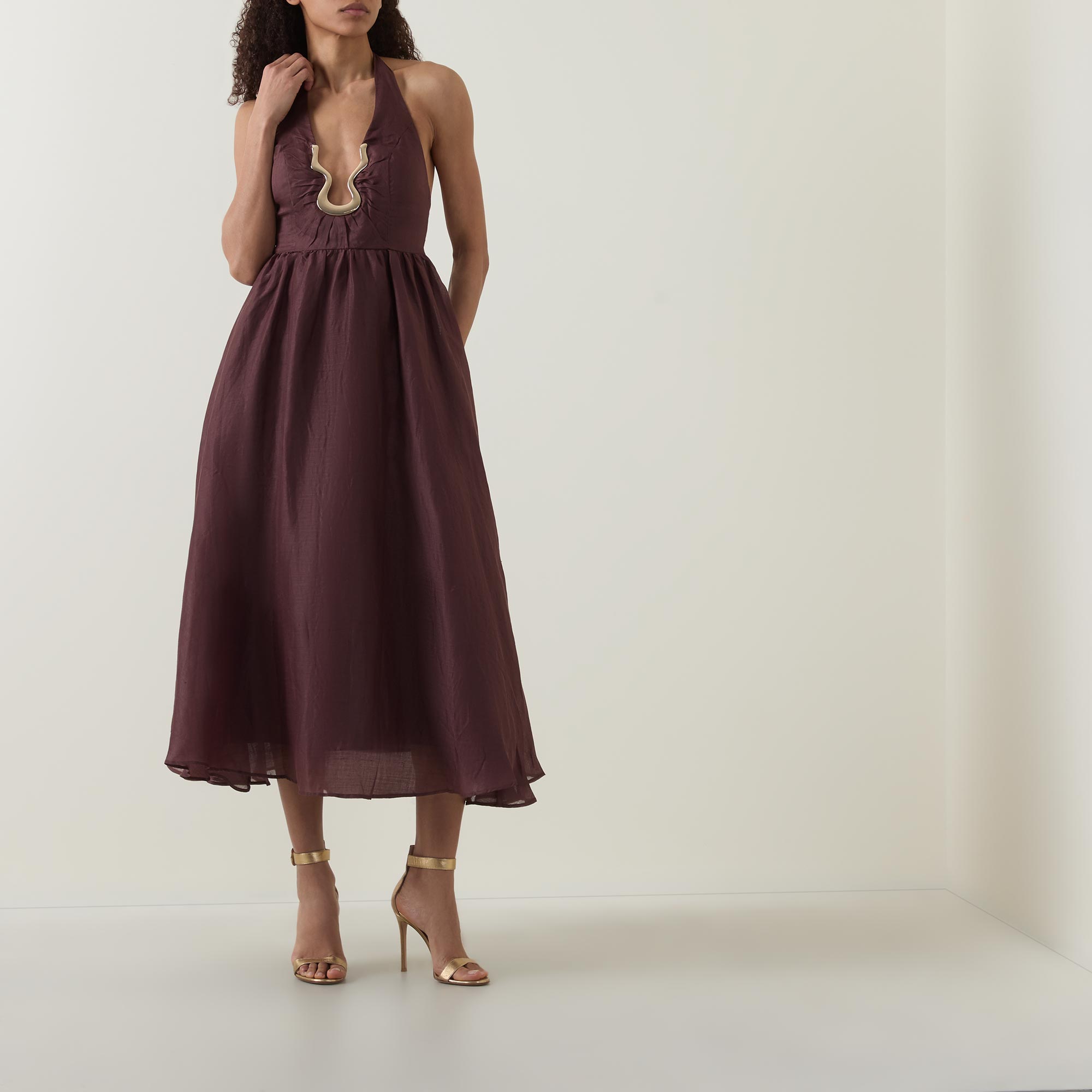 - Halter neckline, plunge neckline, midi length, self-tie fastening, U-shaped metal embellishment, bust and waist gathered details, open back, fully lined, open back