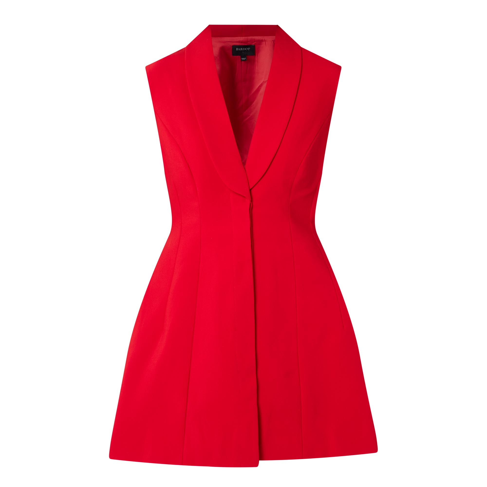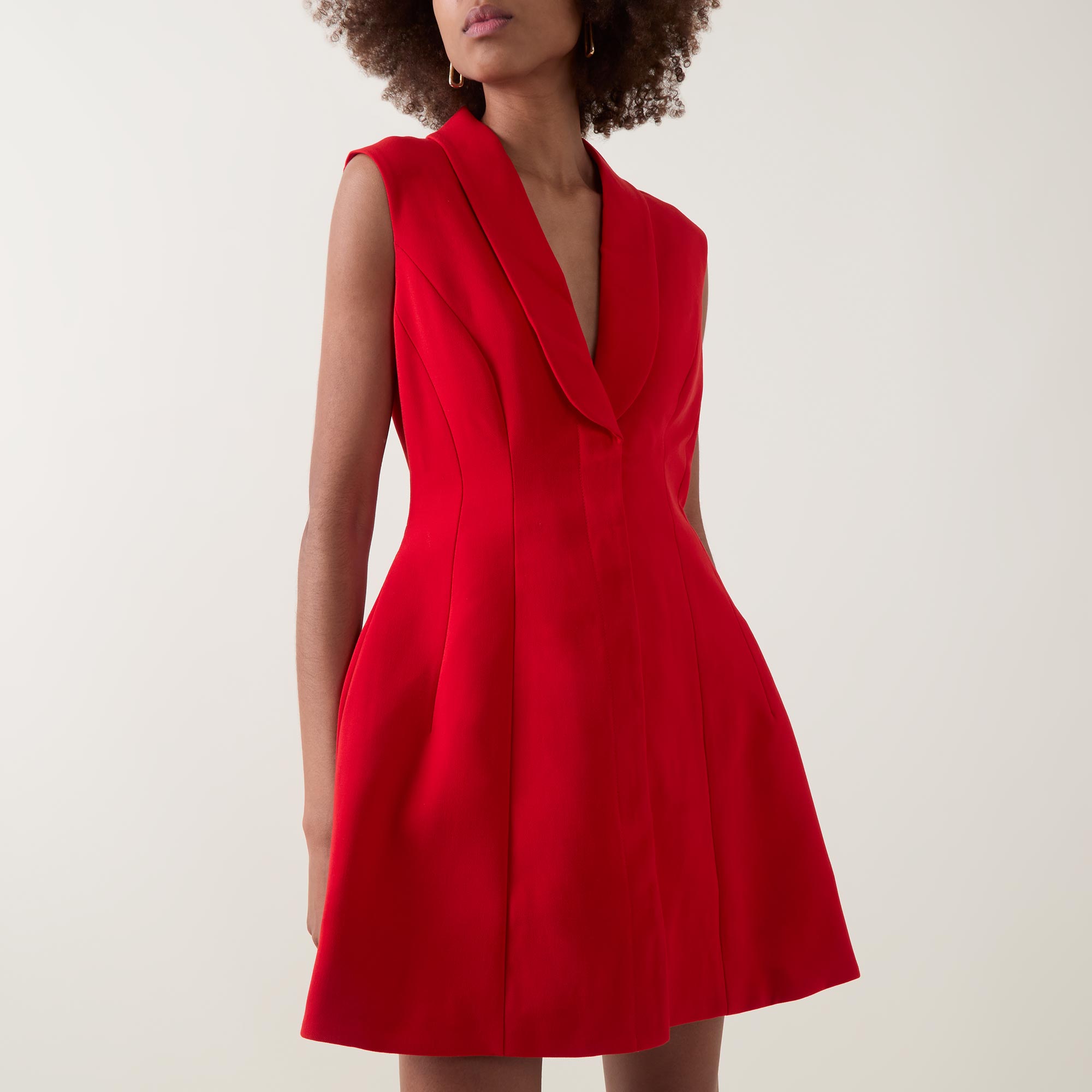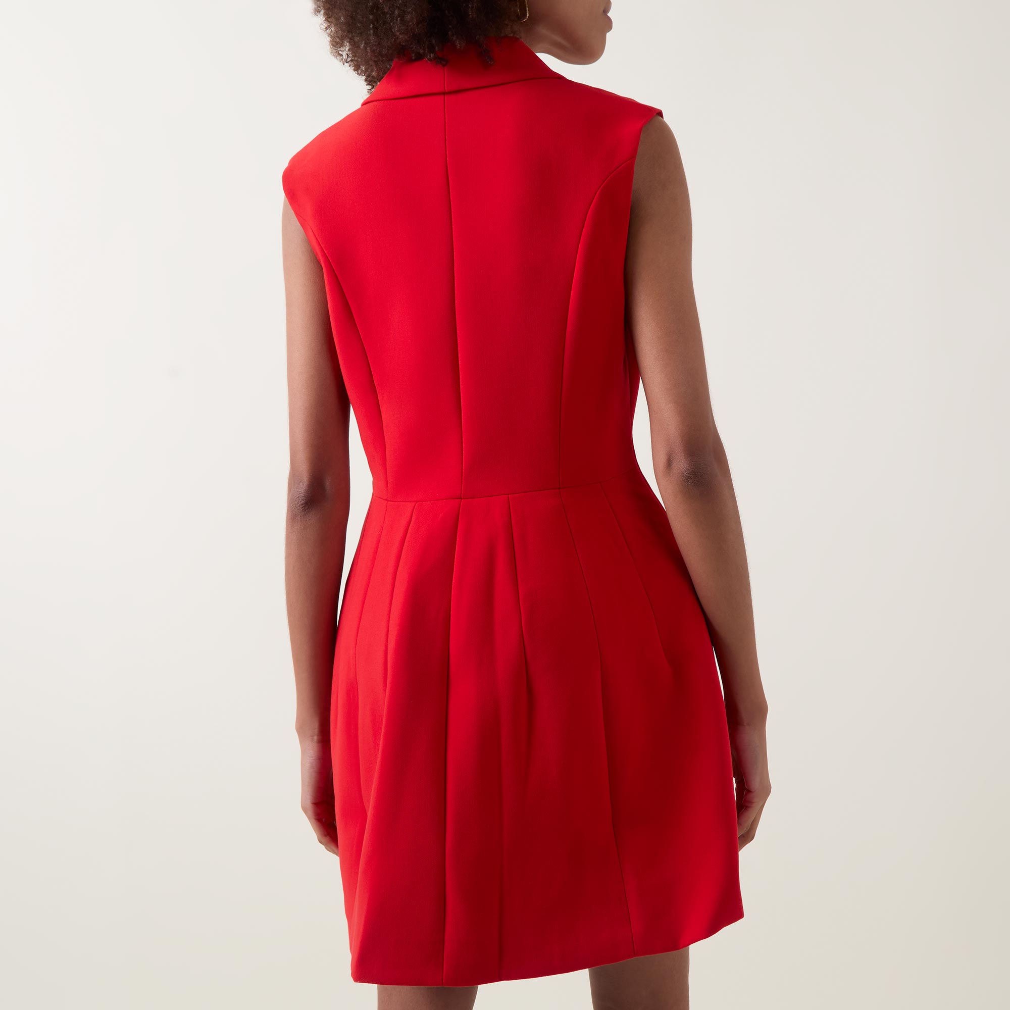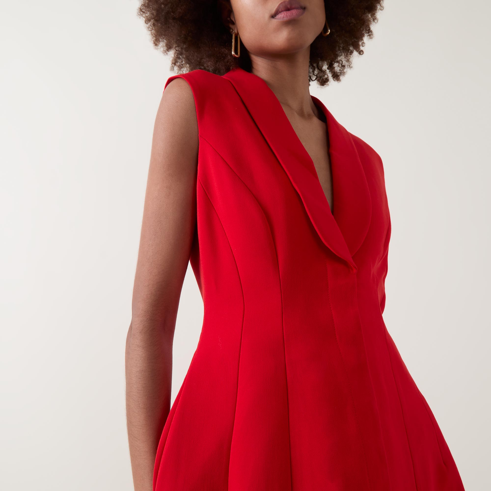 - Plunge neckline, tuxedo lapels, sleeveless, mini length, princess seams, balloon skirt, fully lined, concealed fastening
