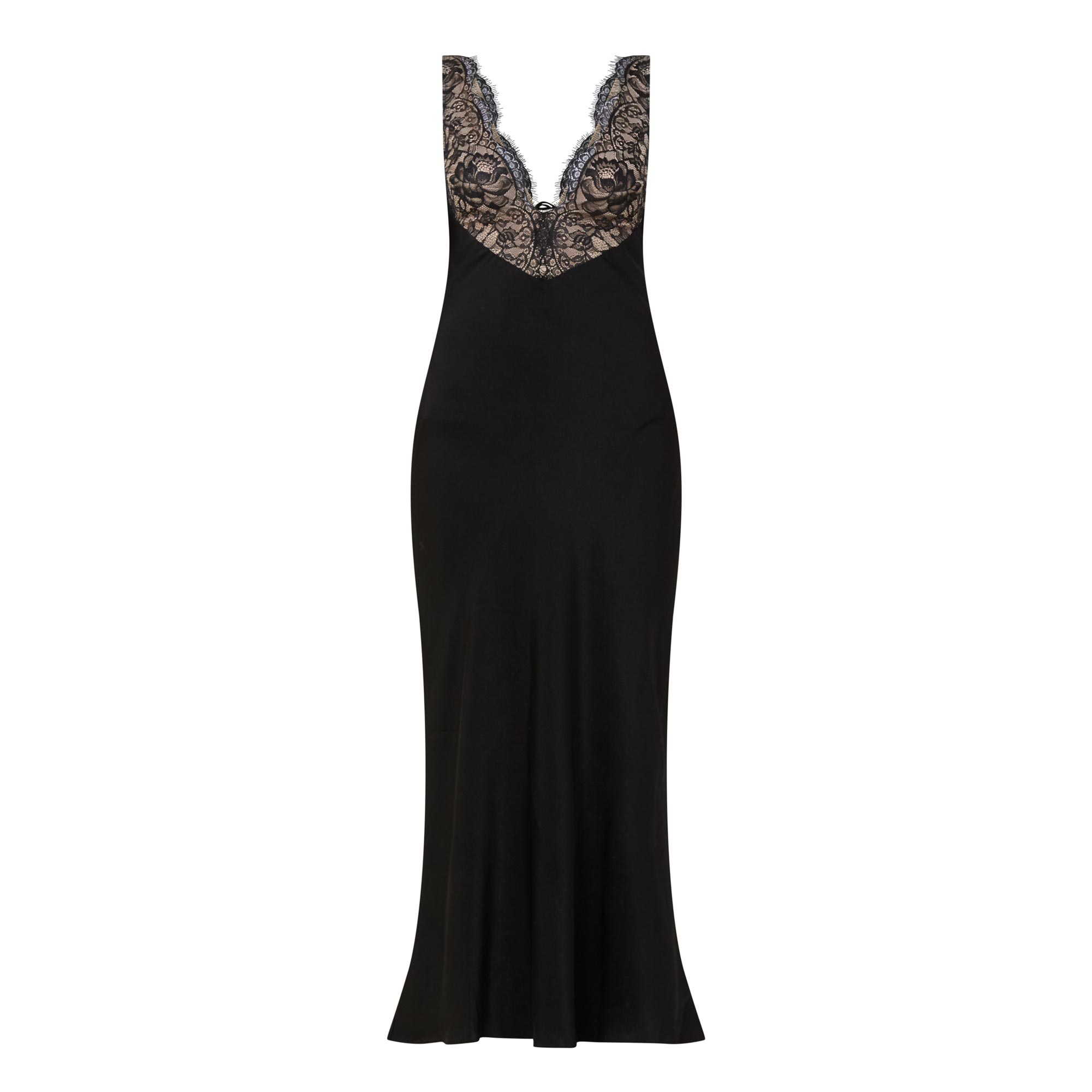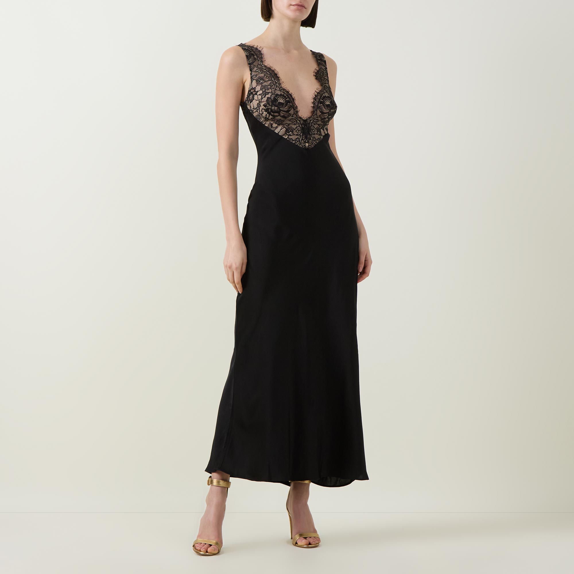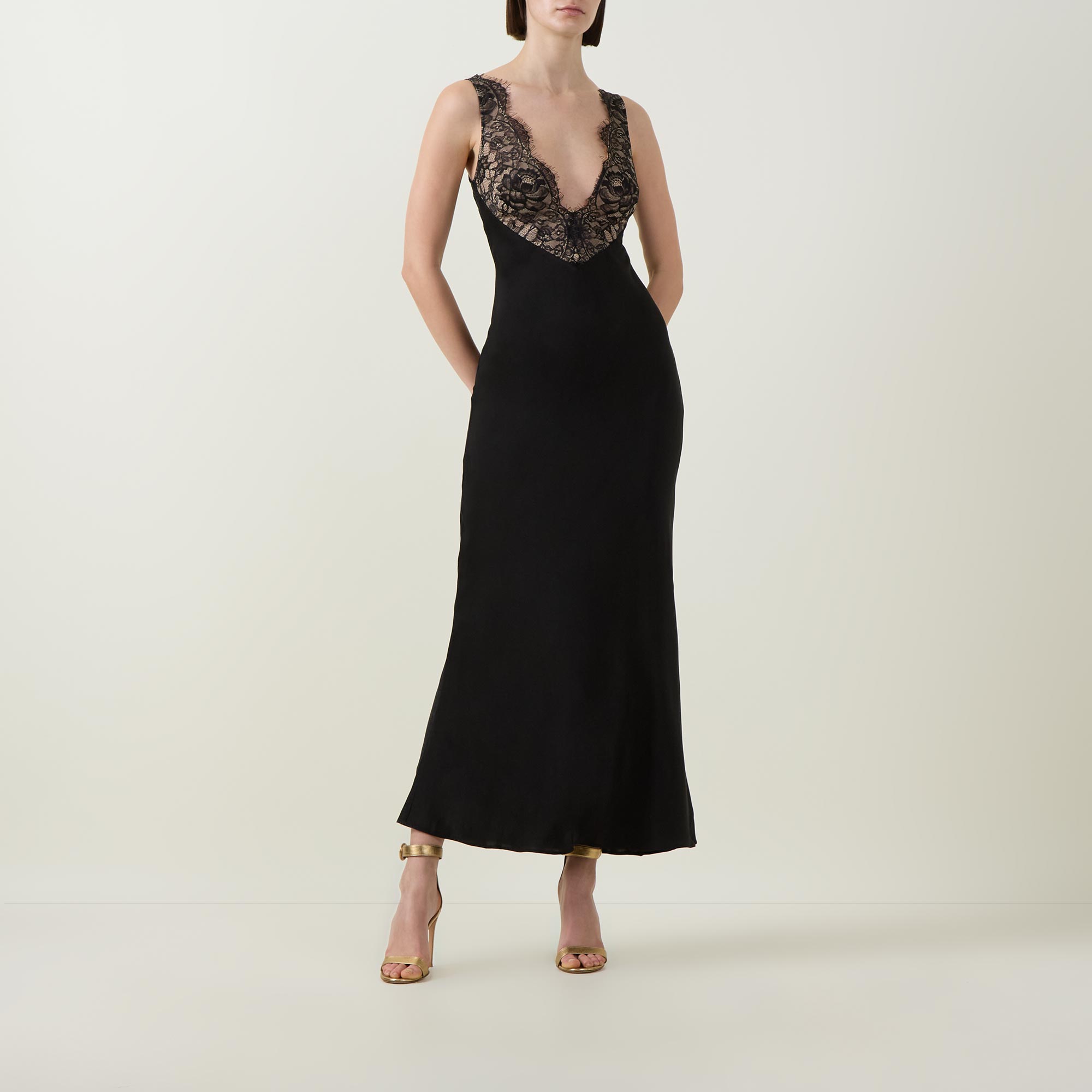 - Plunging V-neckline, sleeveless design, lace detailing on the front and back of the bodice, scalloped front lined with mesh, bias-cut, flared hem, smooth finish, midi length